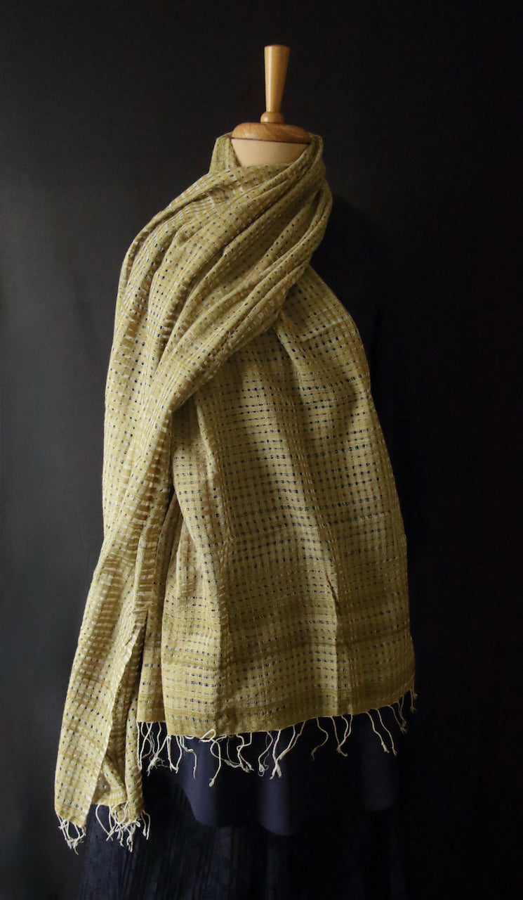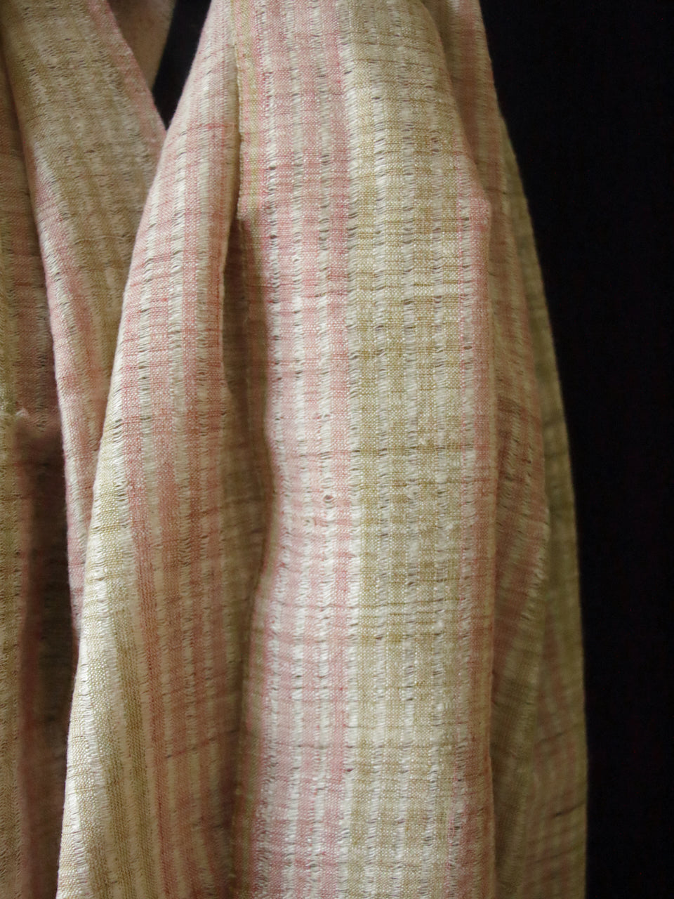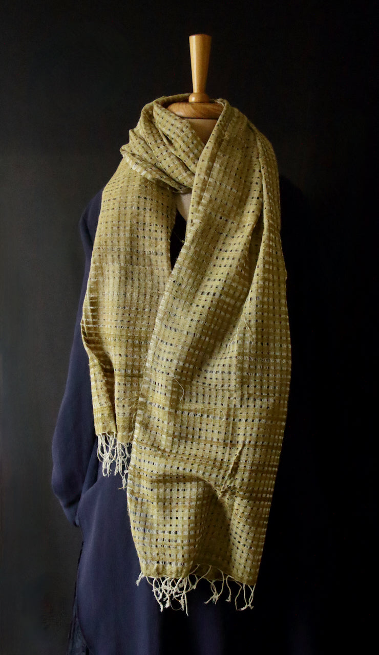 The muffler is made from Handspun Eri Silk Yarns in the traditional looms in Assam by women weavers . The yarns have been natural dyed with natural dye extracts from plant based sources. Generally , hand spun wild silks have a slight dry texture and a very unique hand feel . These mufflers have gone through the process of calendaring that makes them smooth and soft.