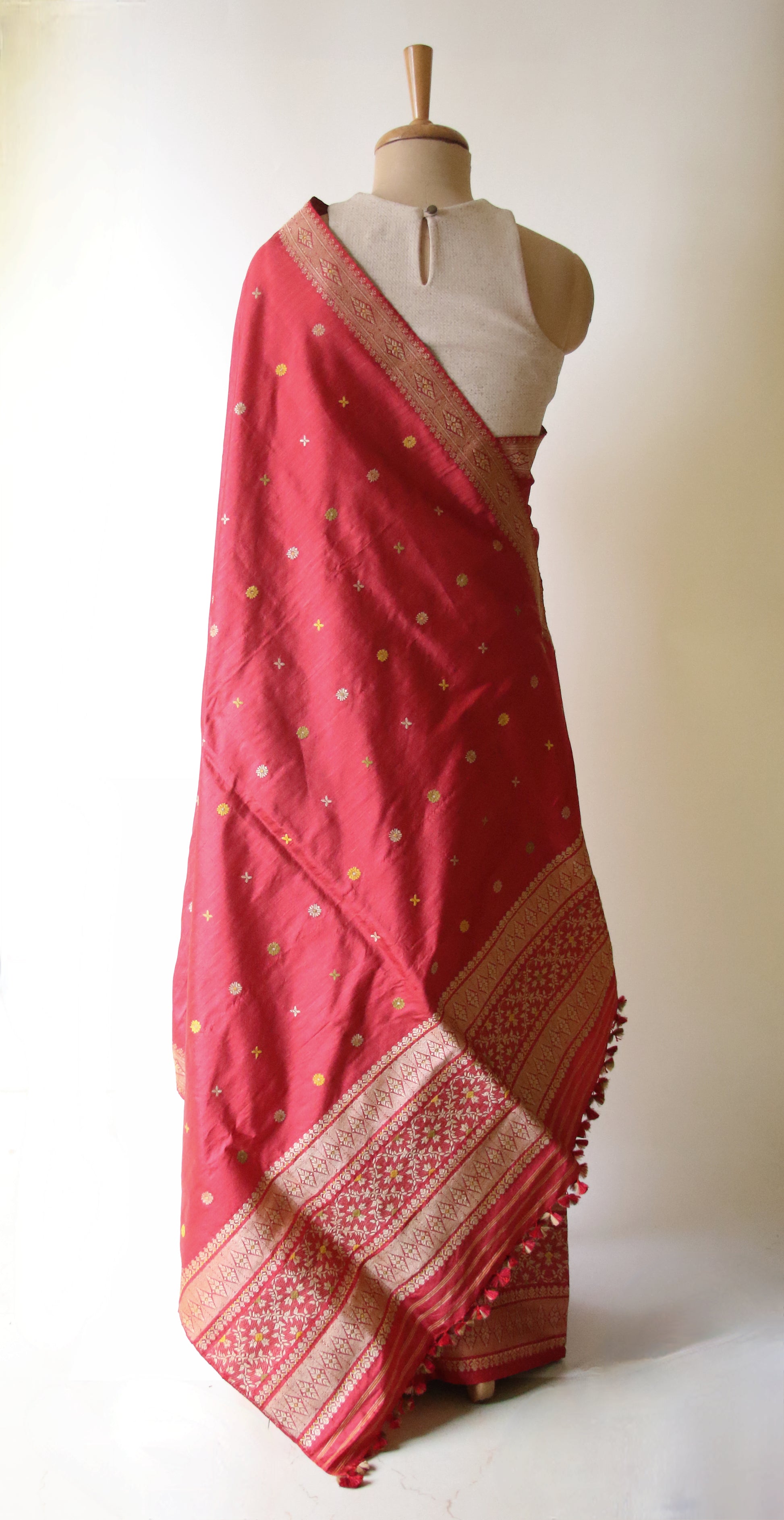 The Mulberry silk yarns have been natural dyed with natural ingredients and all motifs in muga silk and natural dyed eri silk.