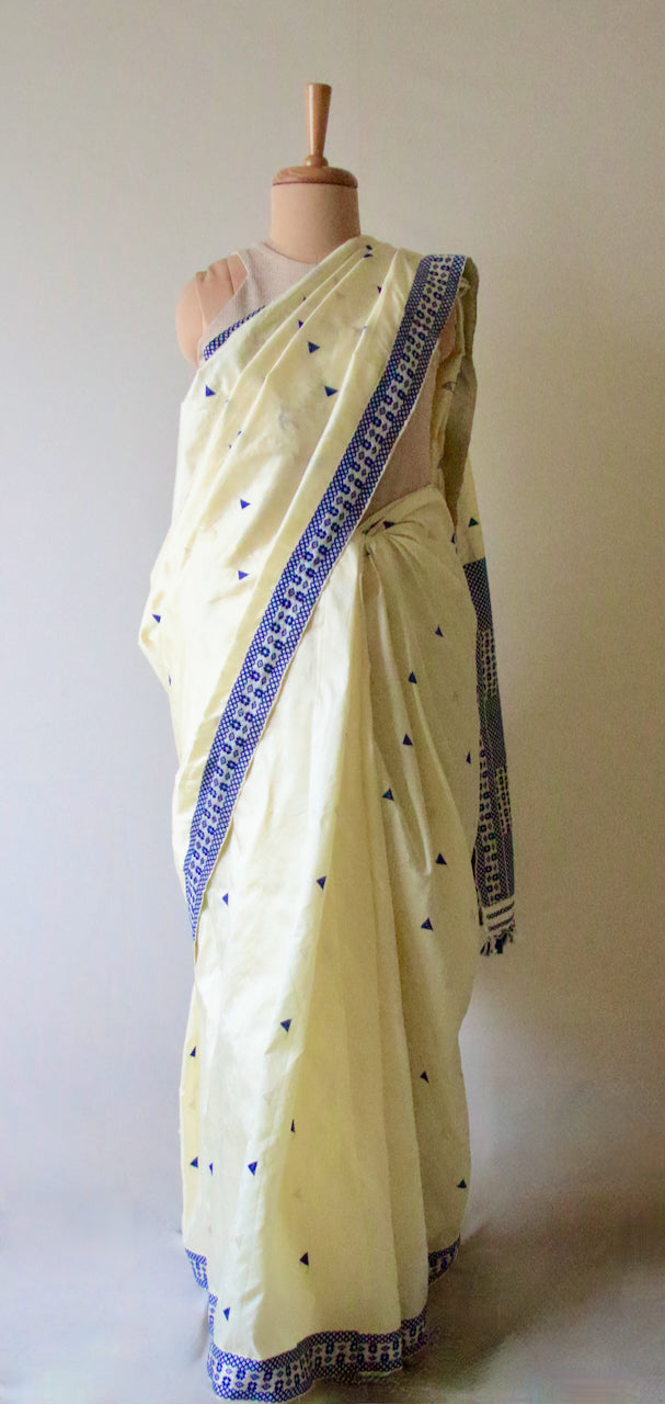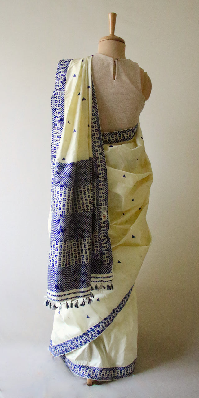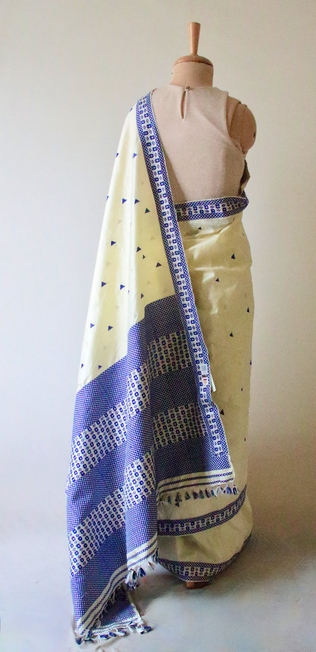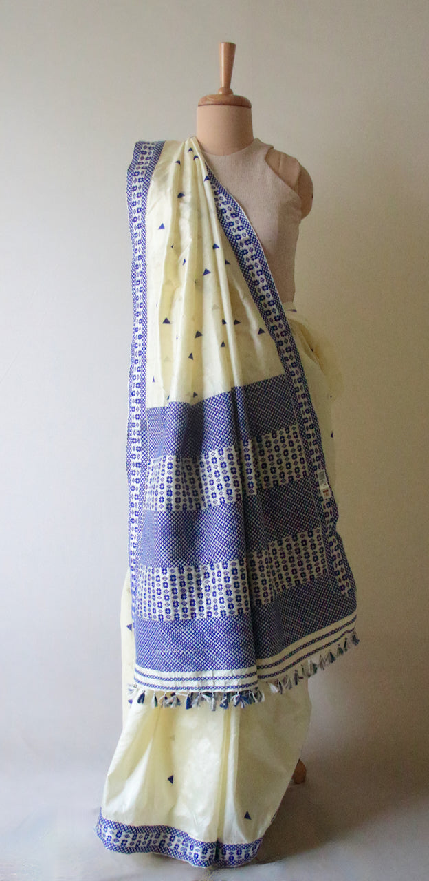 The Saree has Mulberry Silk in the warp and weft and all the extra weft motifs are in cotton and acrylic.