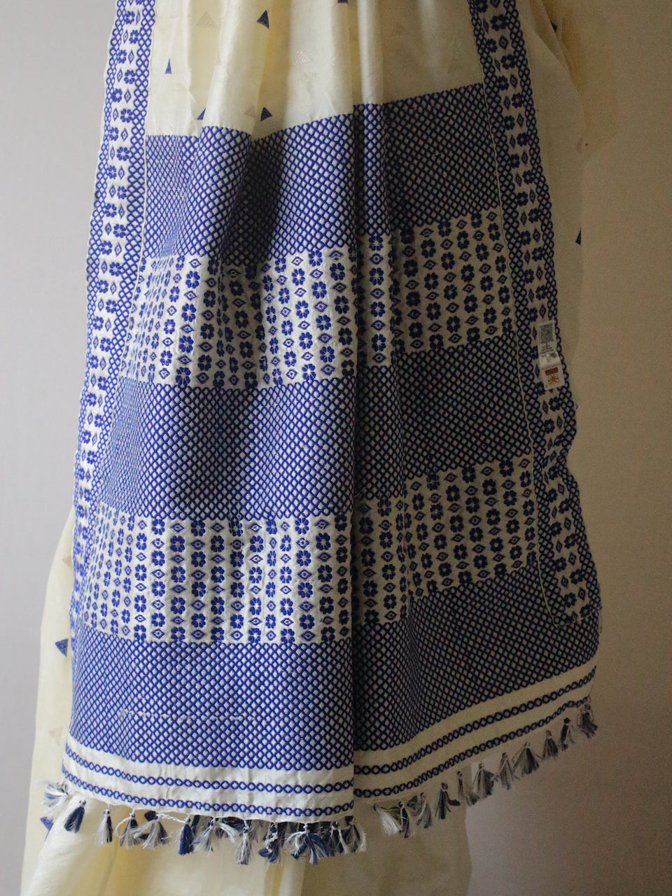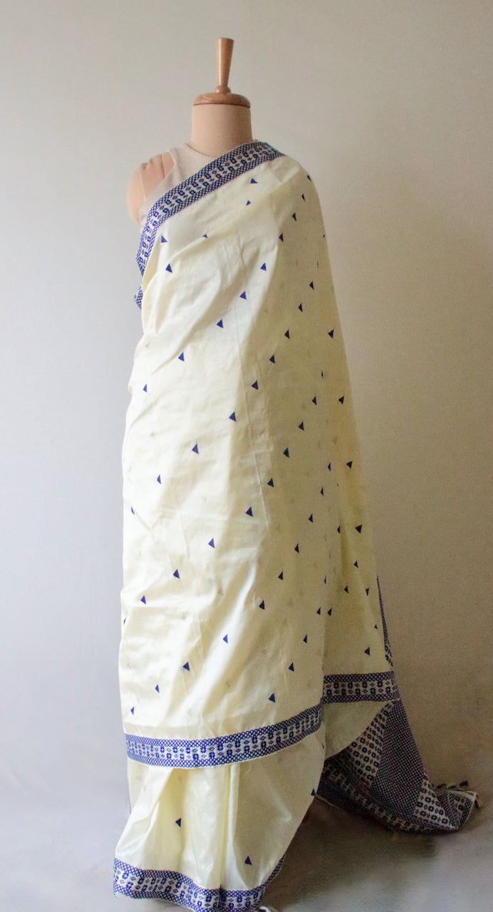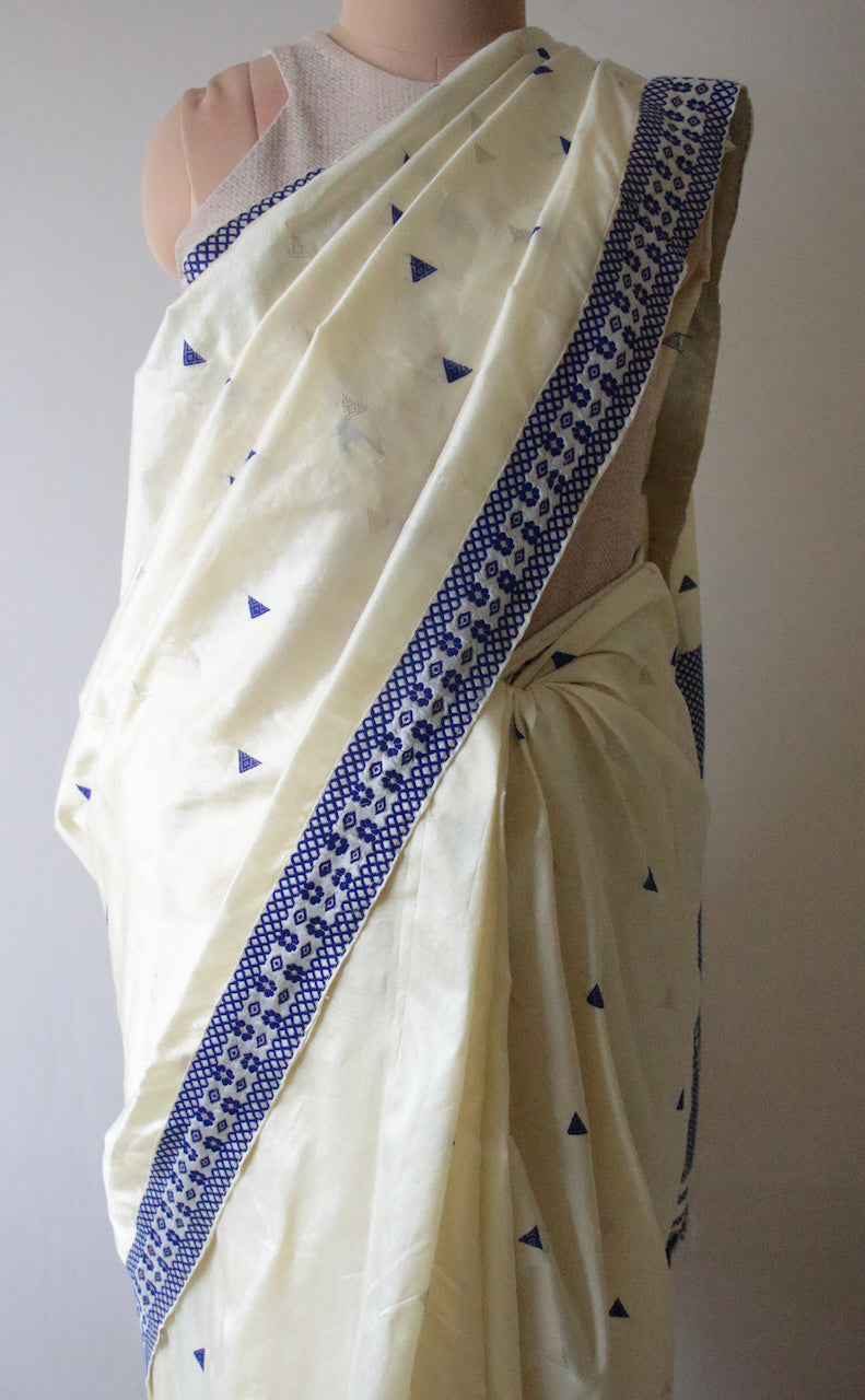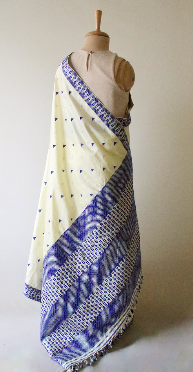 The Saree has Mulberry Silk in the warp and weft and all the extra weft motifs are in cotton and acrylic.