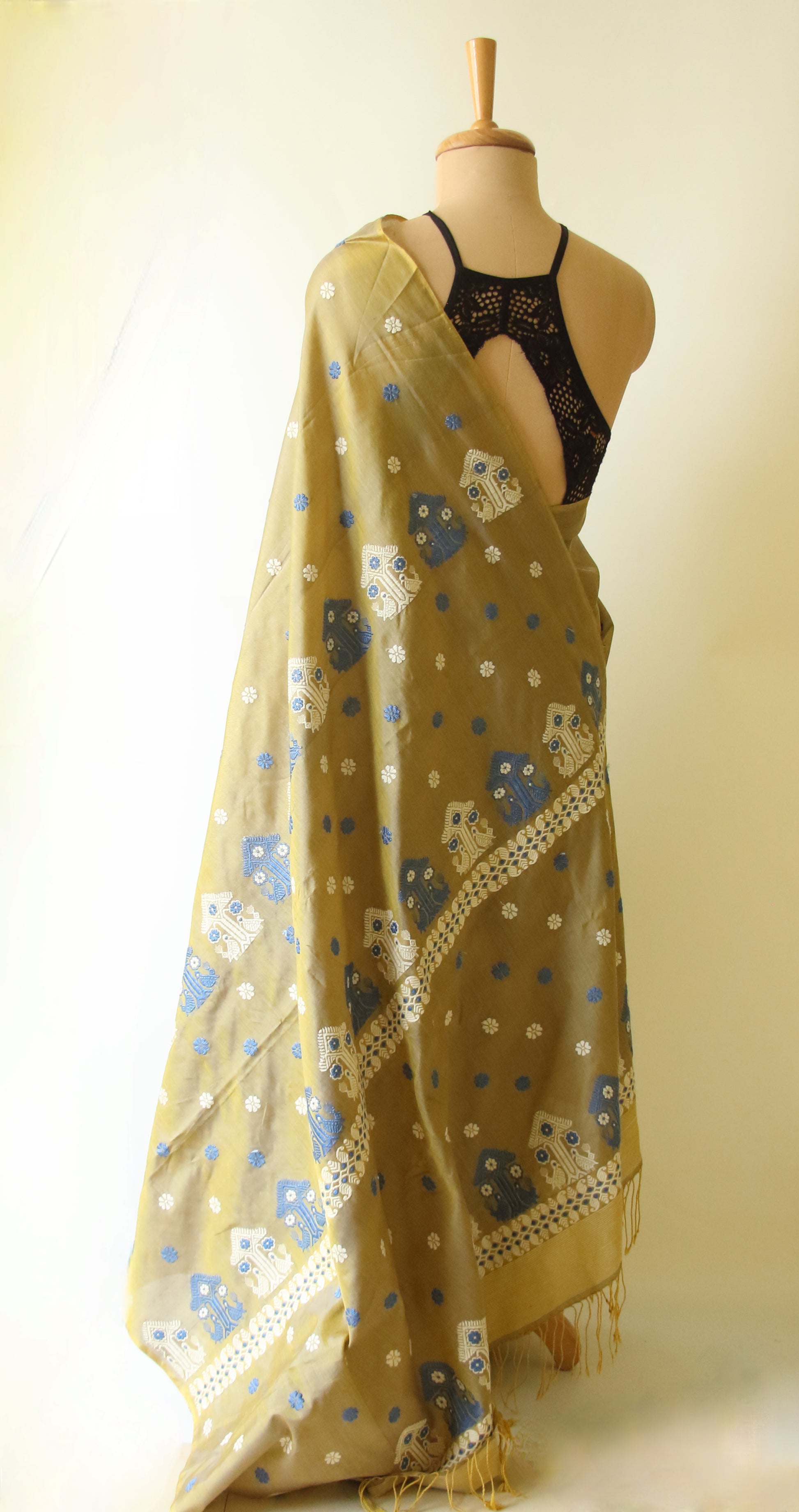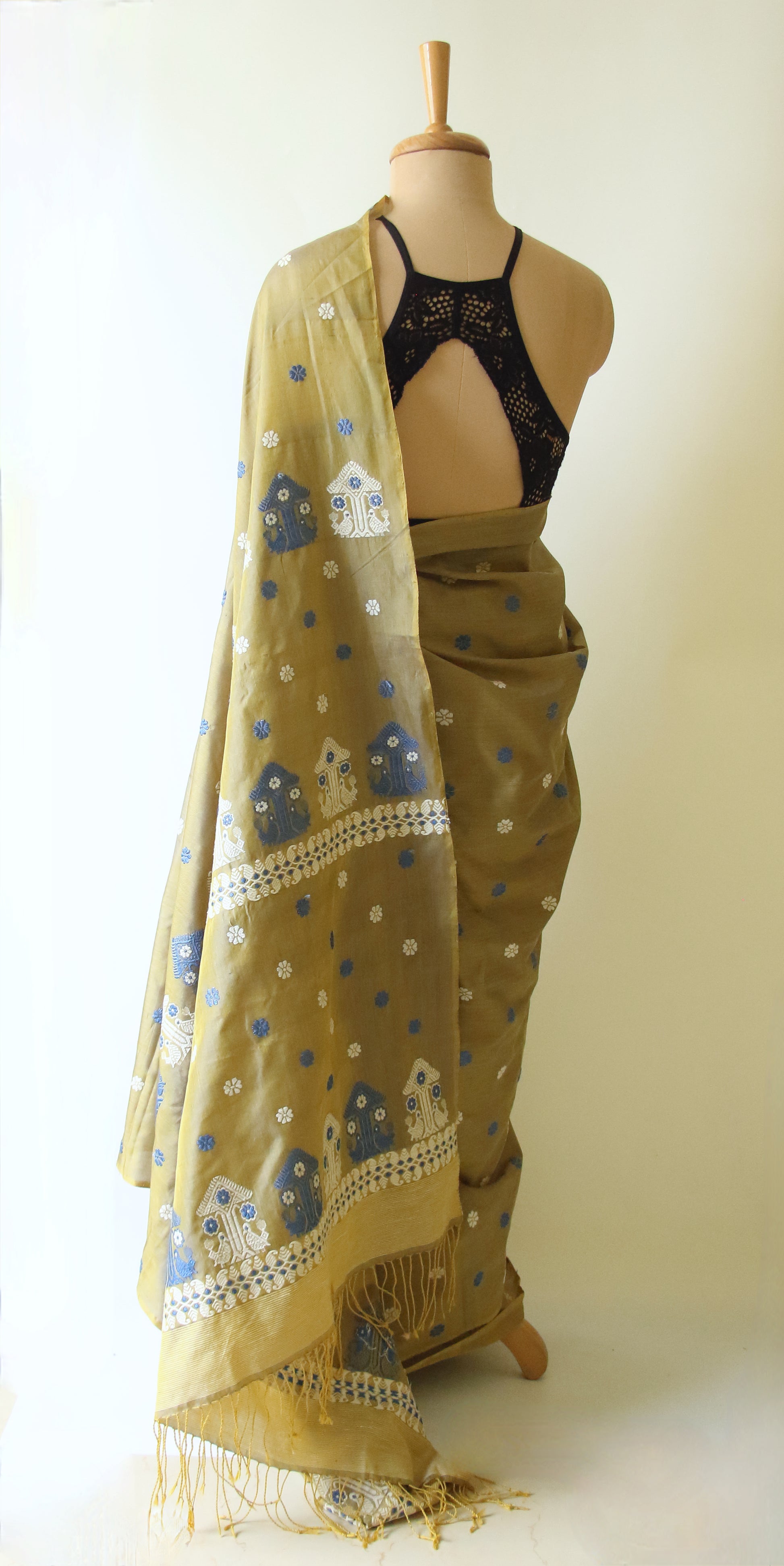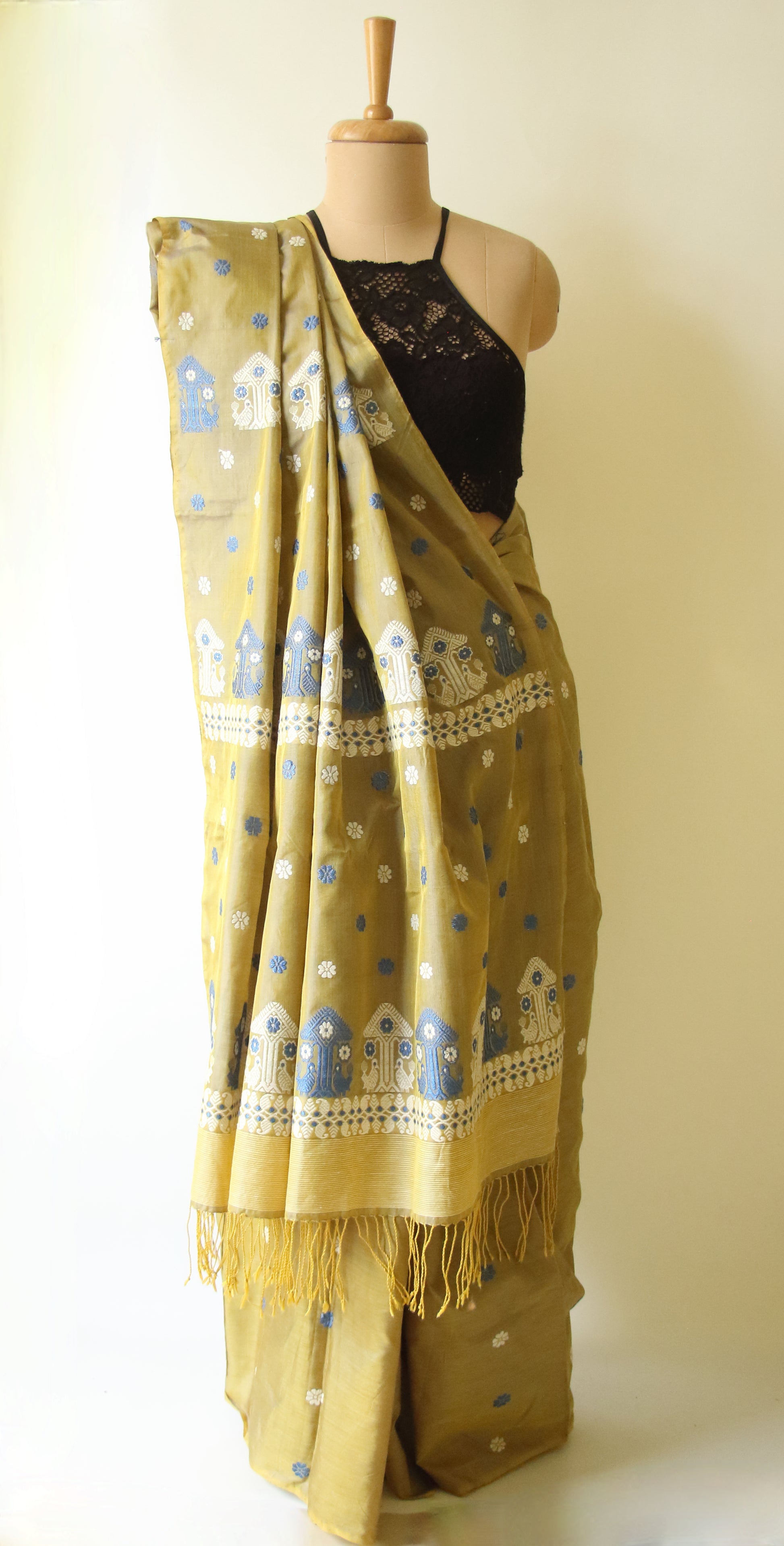 The saree has Modal yarns in the warp and Mulberry Silk Yarns in the weft . The interwoven motif yarns are in Eri Silk and cotton.