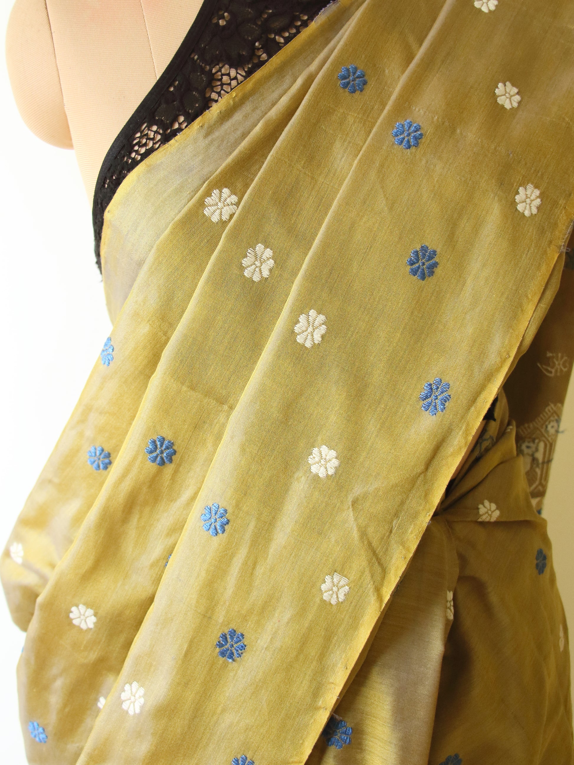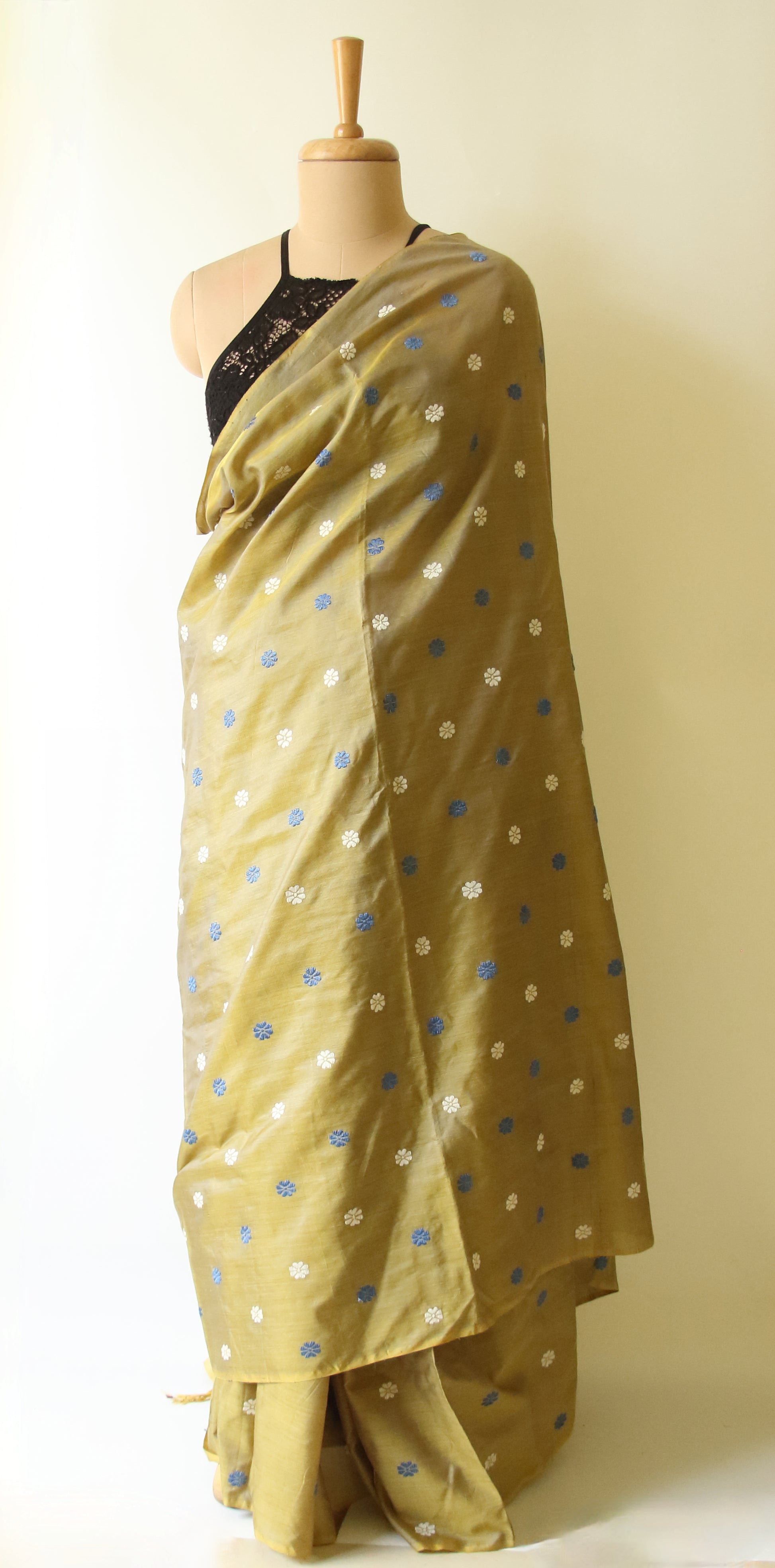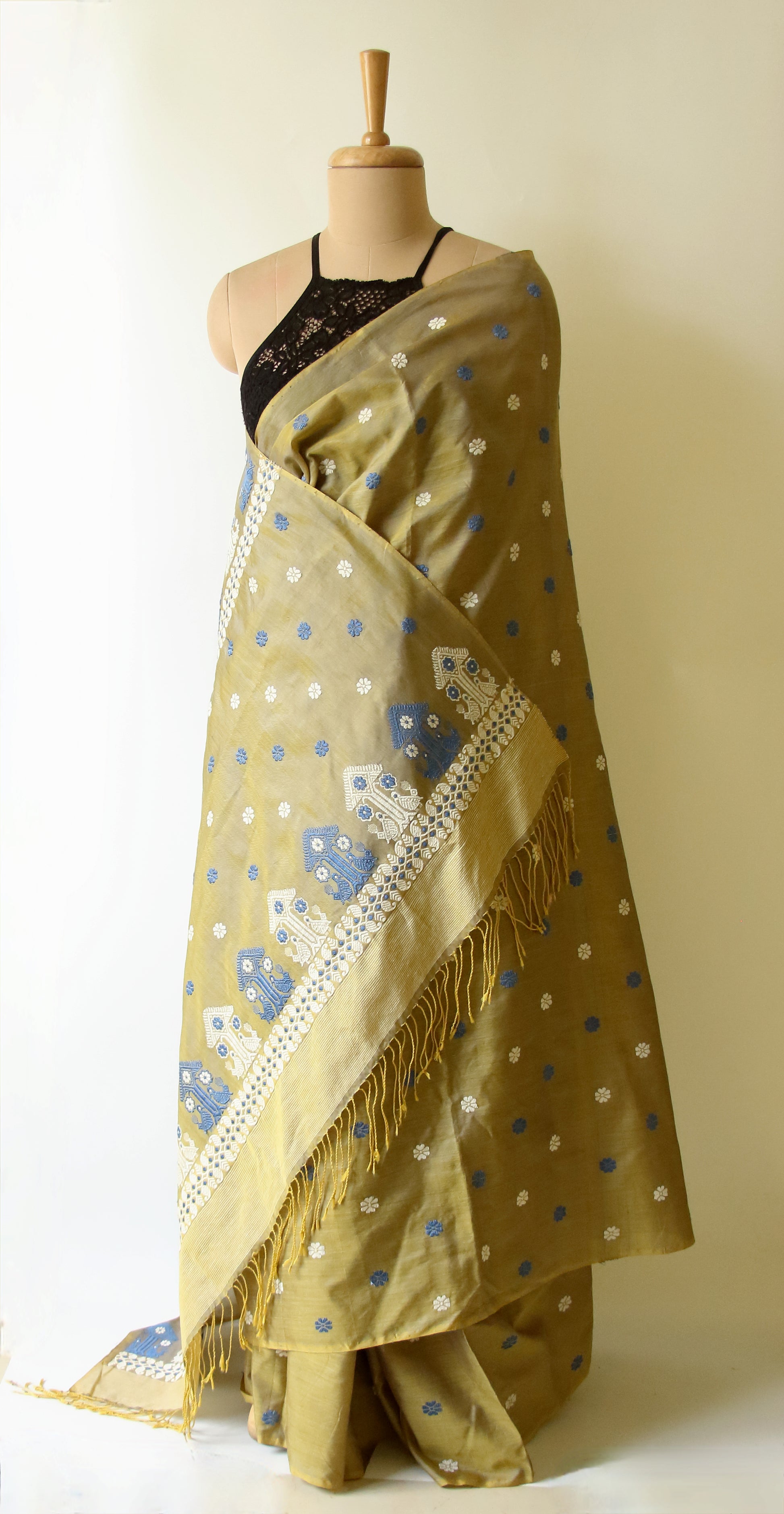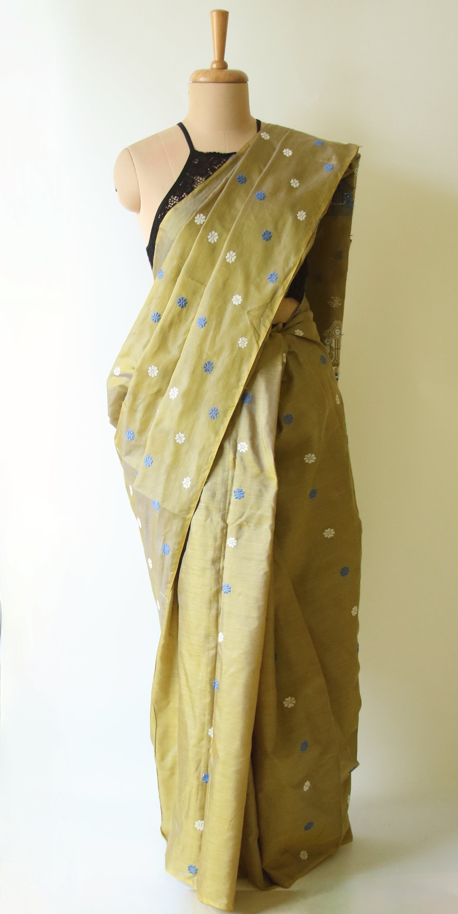 The saree has Modal yarns in the warp and Mulberry Silk Yarns in the weft . The interwoven motif yarns are in Eri Silk and cotton.