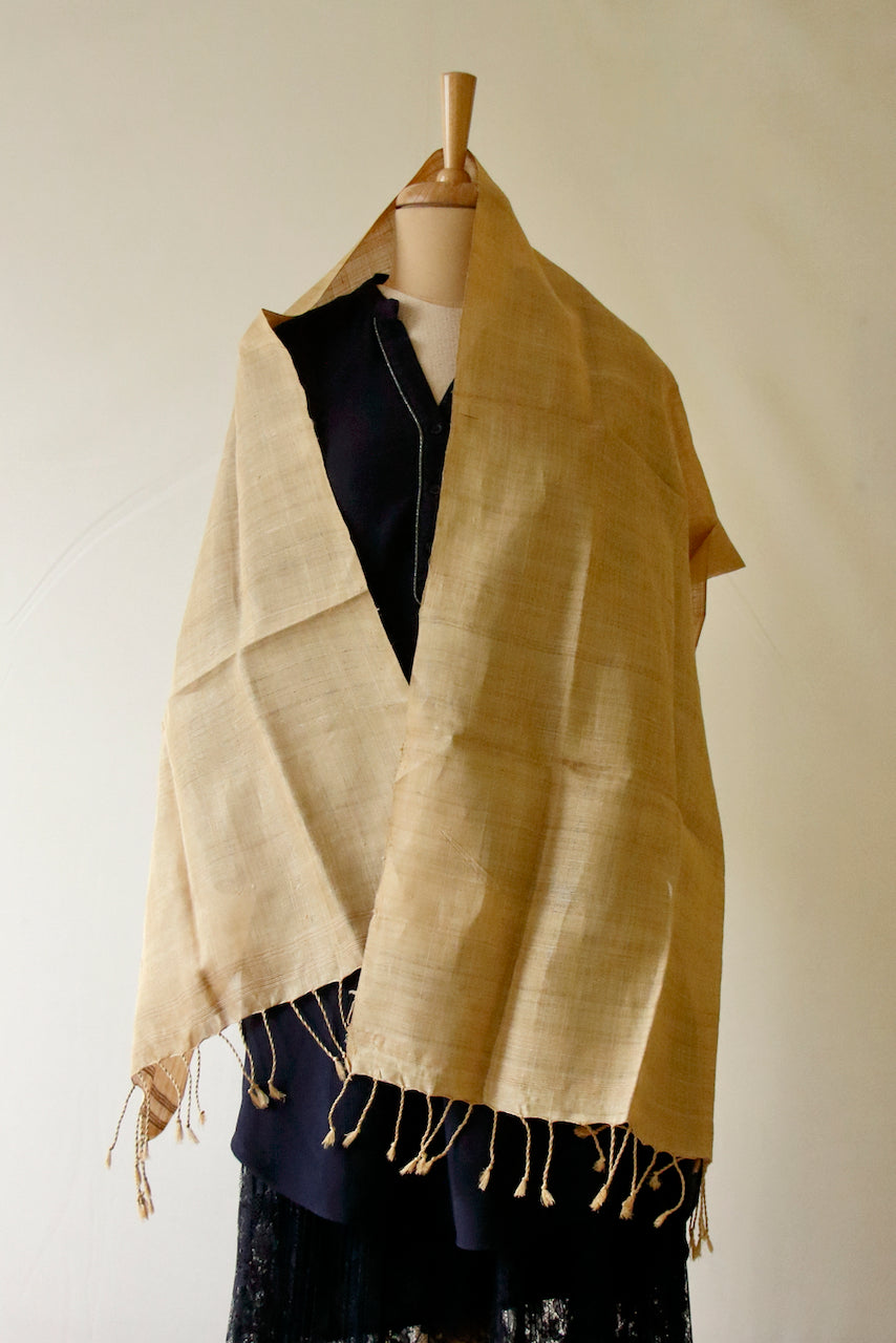 This Stole has hand reeled yarns both in the weft and warp . Hand reeled Muga silk yarns are the most valued kind . It has been woven on the basic handloom .