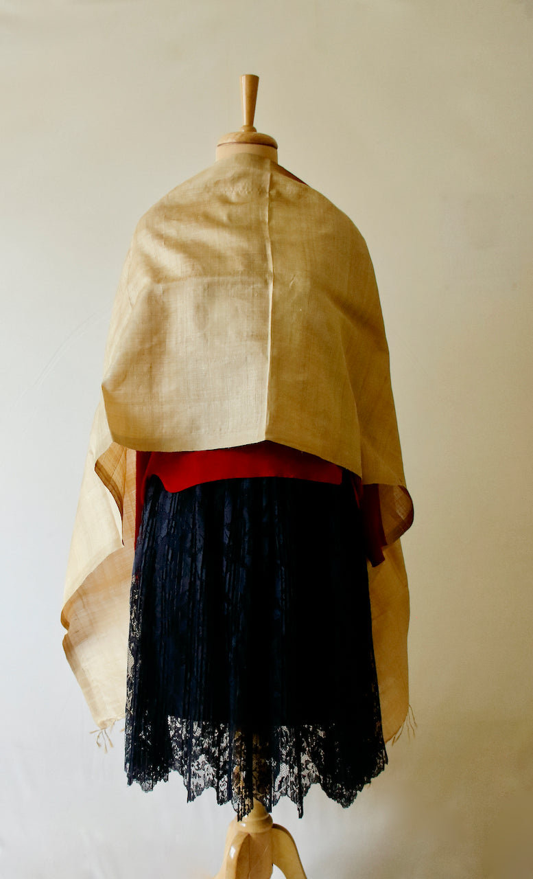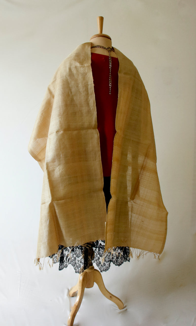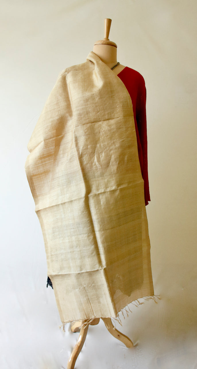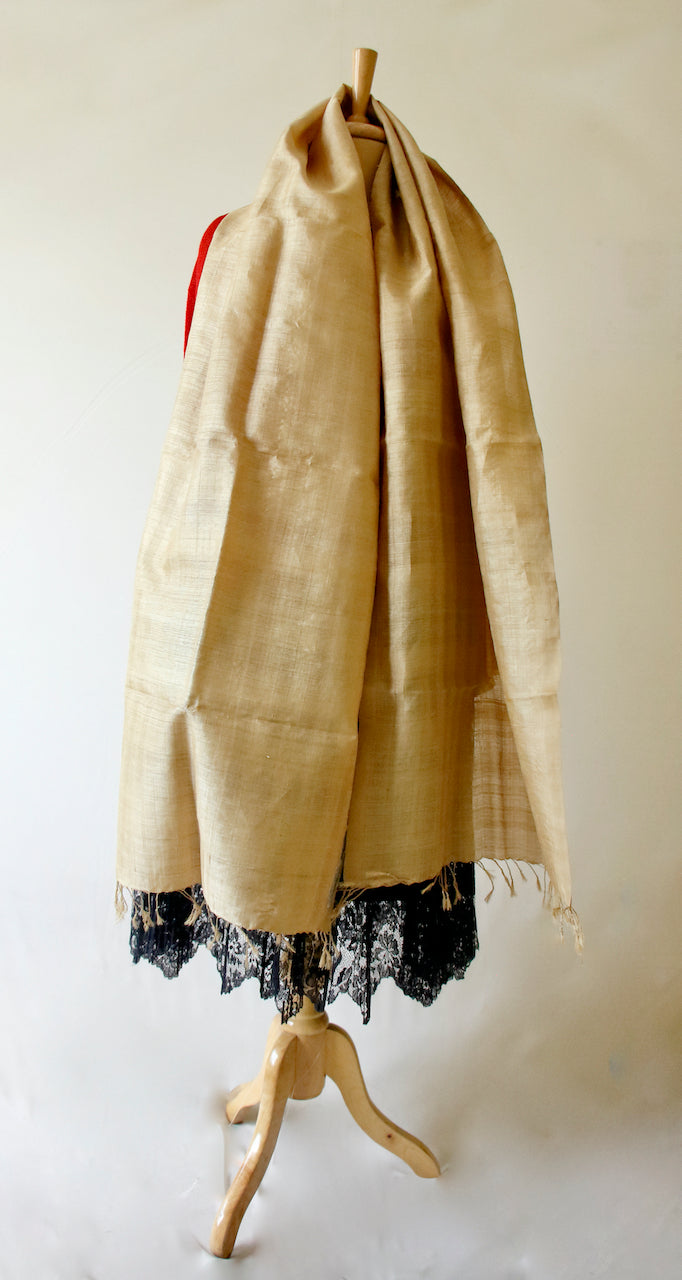 This Stole has hand reeled yarns both in the weft and warp . Hand reeled Muga silk yarns are the most valued kind . It has been woven on the basic handloom .