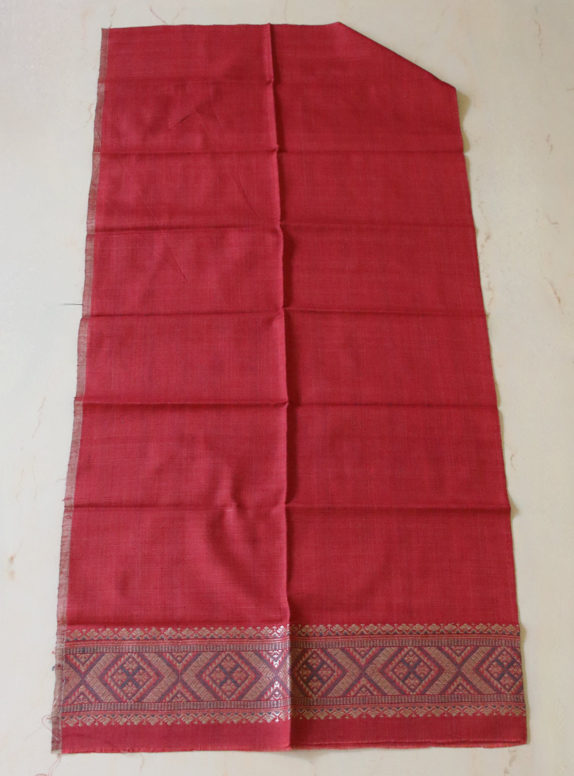 The Mekhla and Chador is a traditional 2 piece dress from the North East State of Assam, India . The Mekhla is appx 1.20 Mt in length and 37" width when stitched. The Warp will have pleats when worn. The top part or 'chadar ' is a shawl or half -sari which is used to cover the upper portion of the body and is worn on top of the mekhla or wrap. The usual size is 3 Meters long and about 37 inches in width.