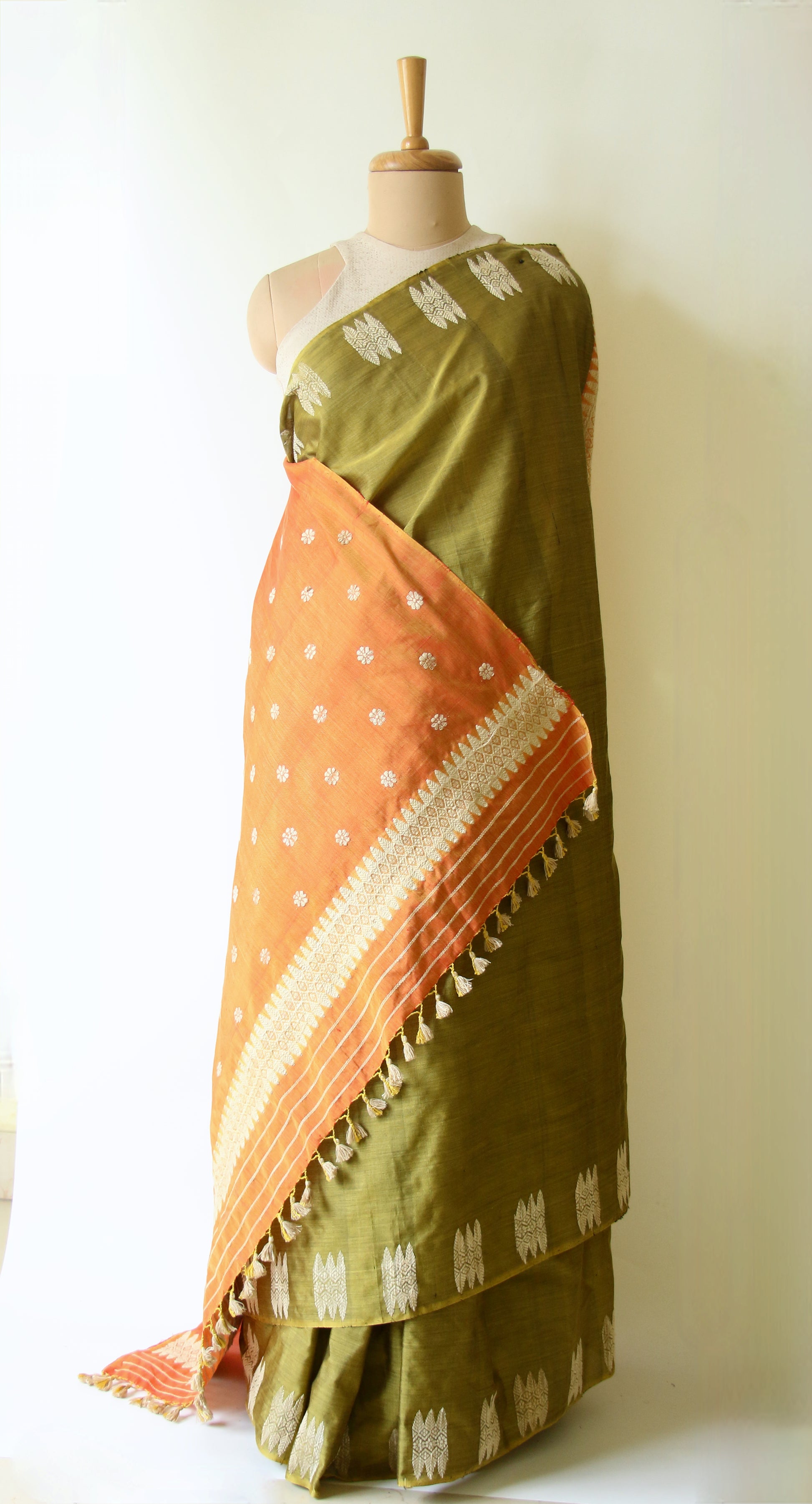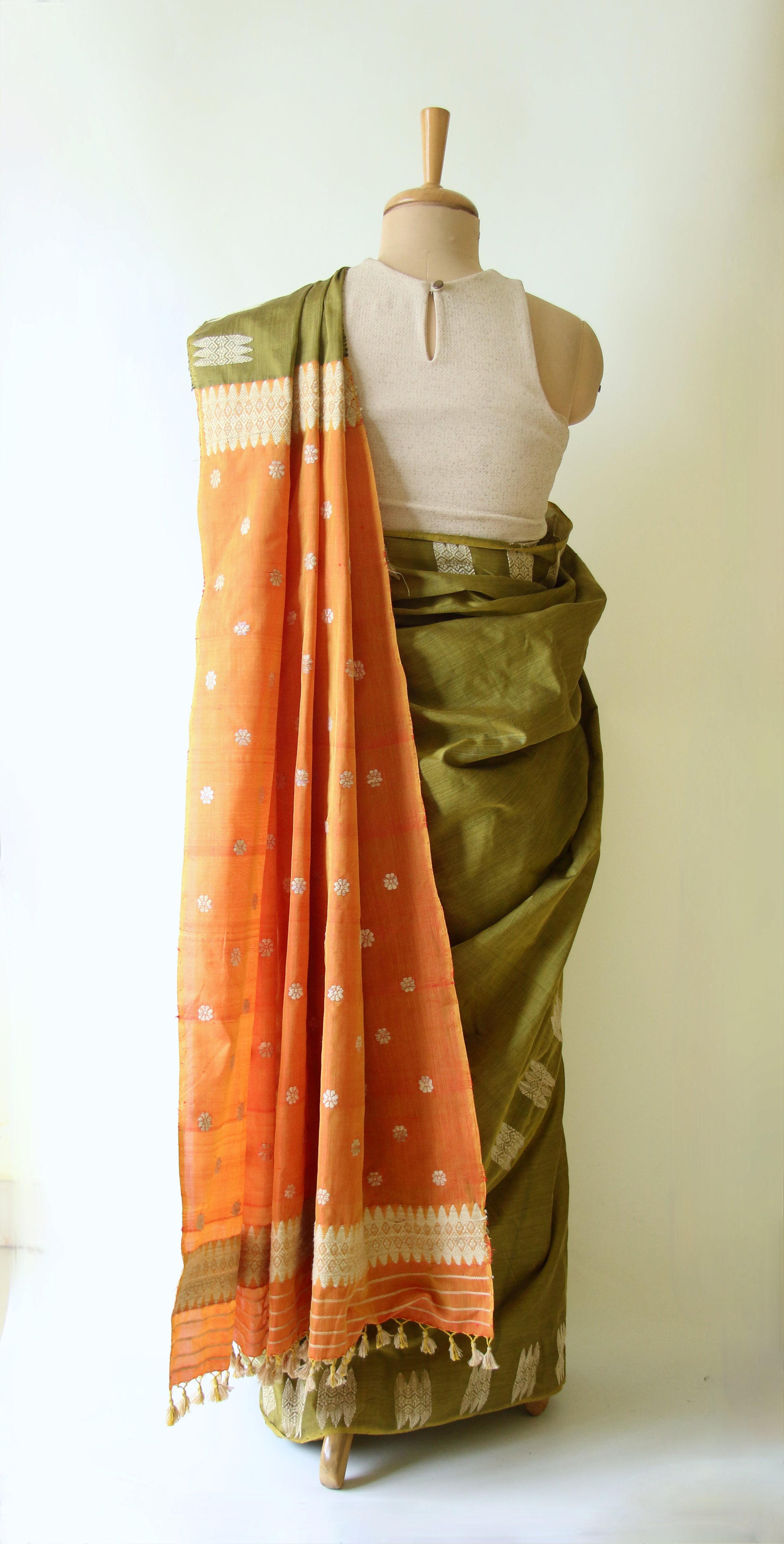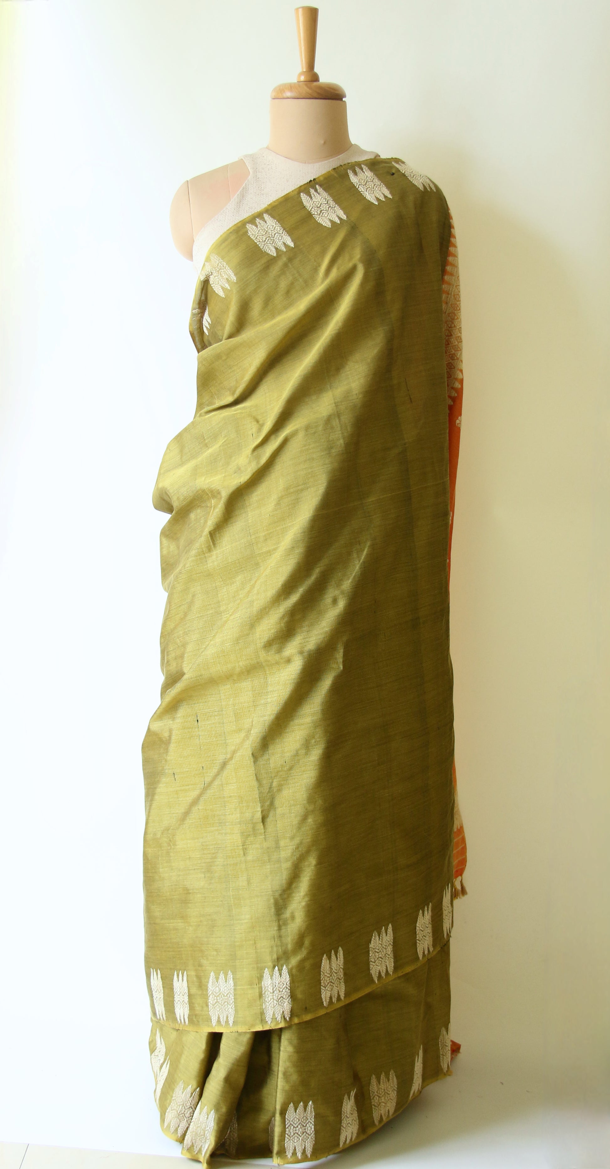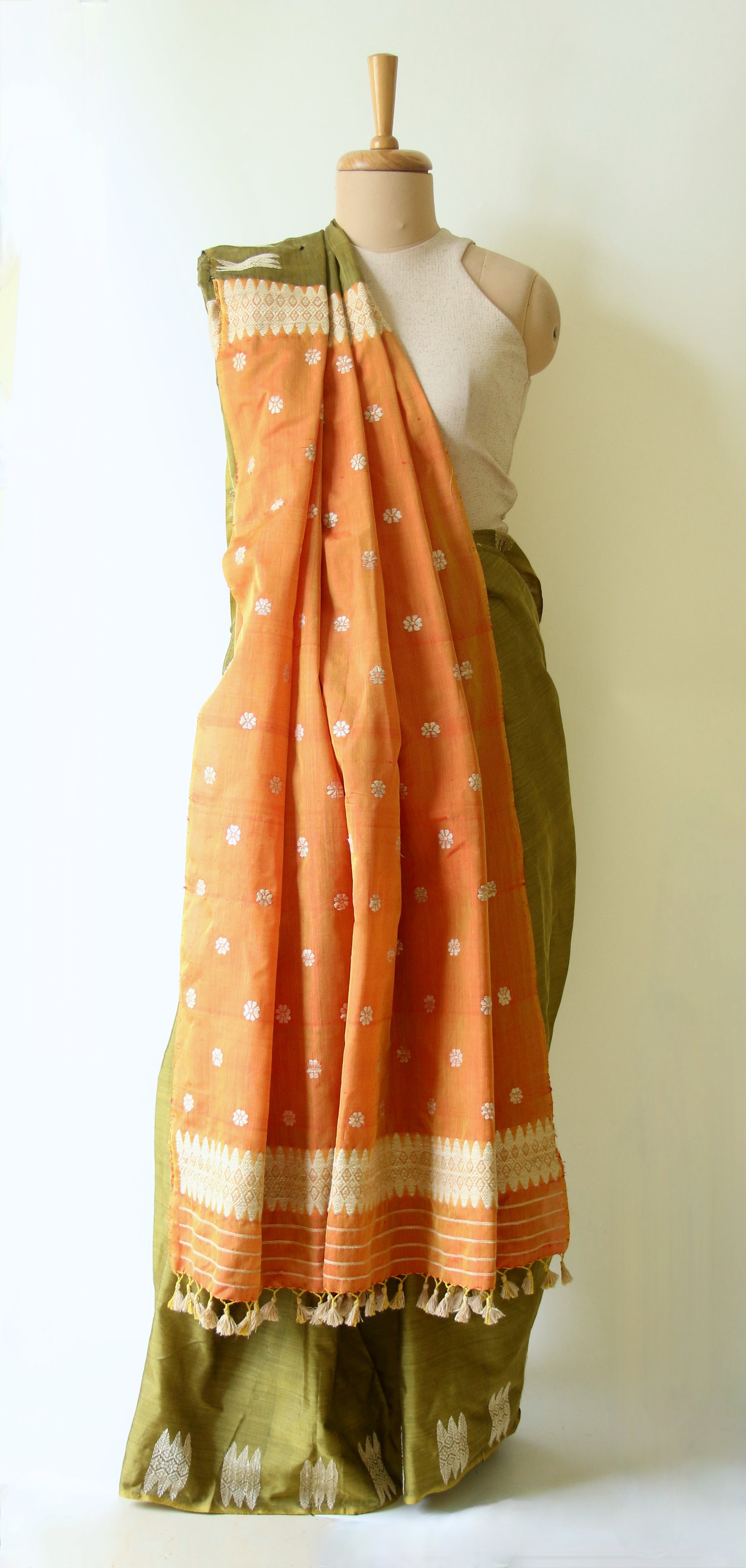 The saree has Modal yarns in the warp and Raw Mulberry Silk Yarns in the weft . The interwoven motif yarns are in Eri Silk .