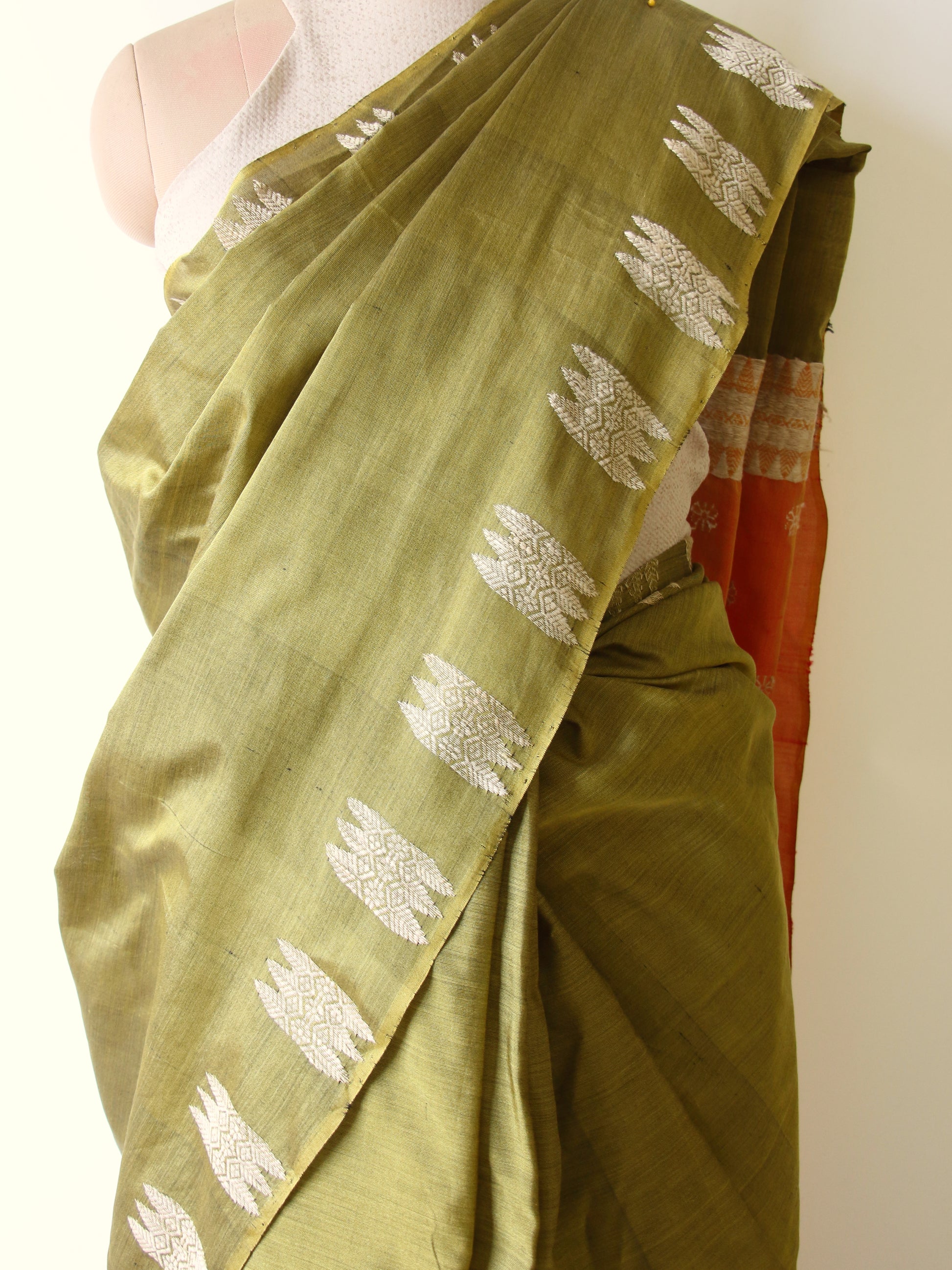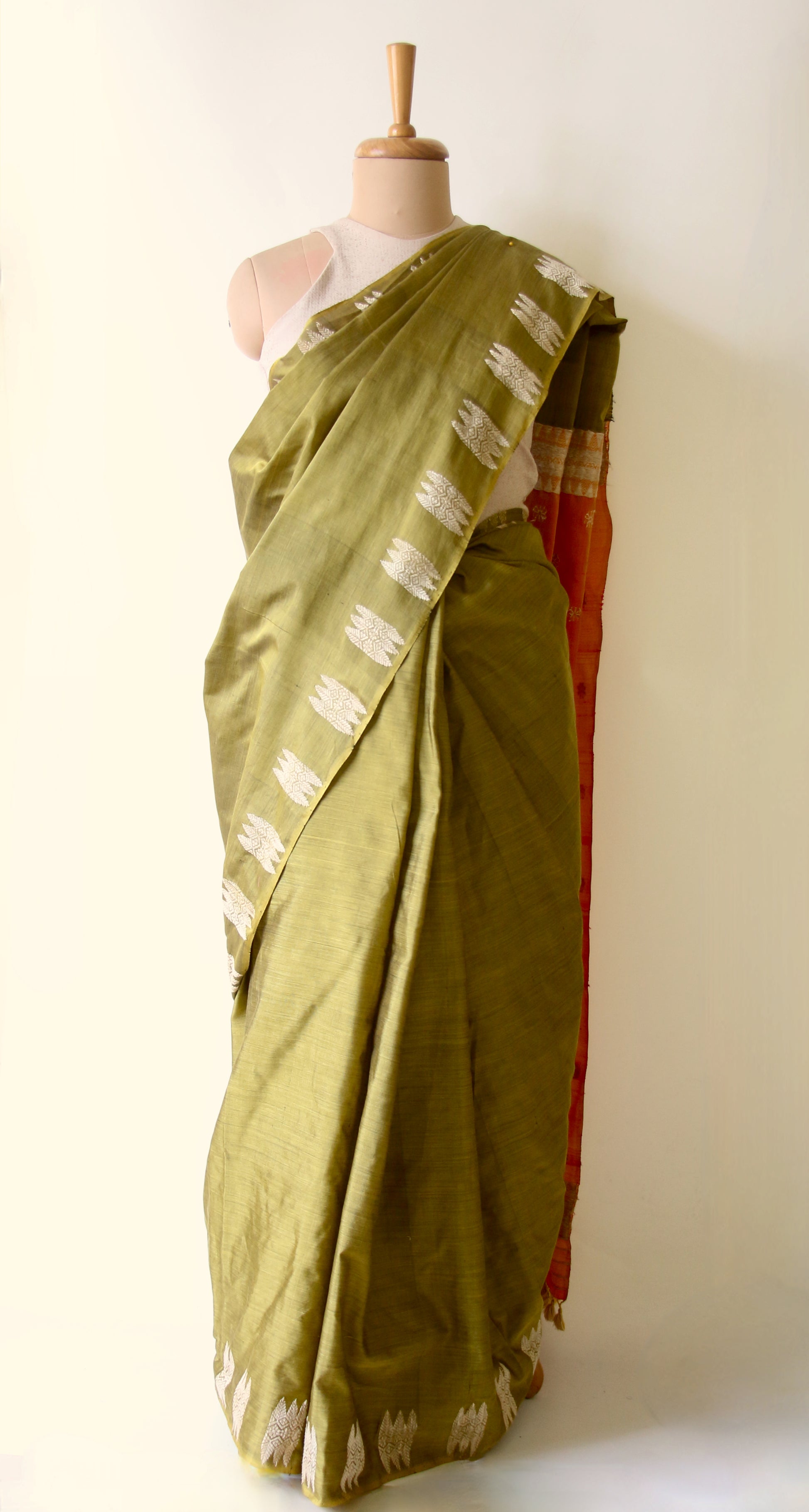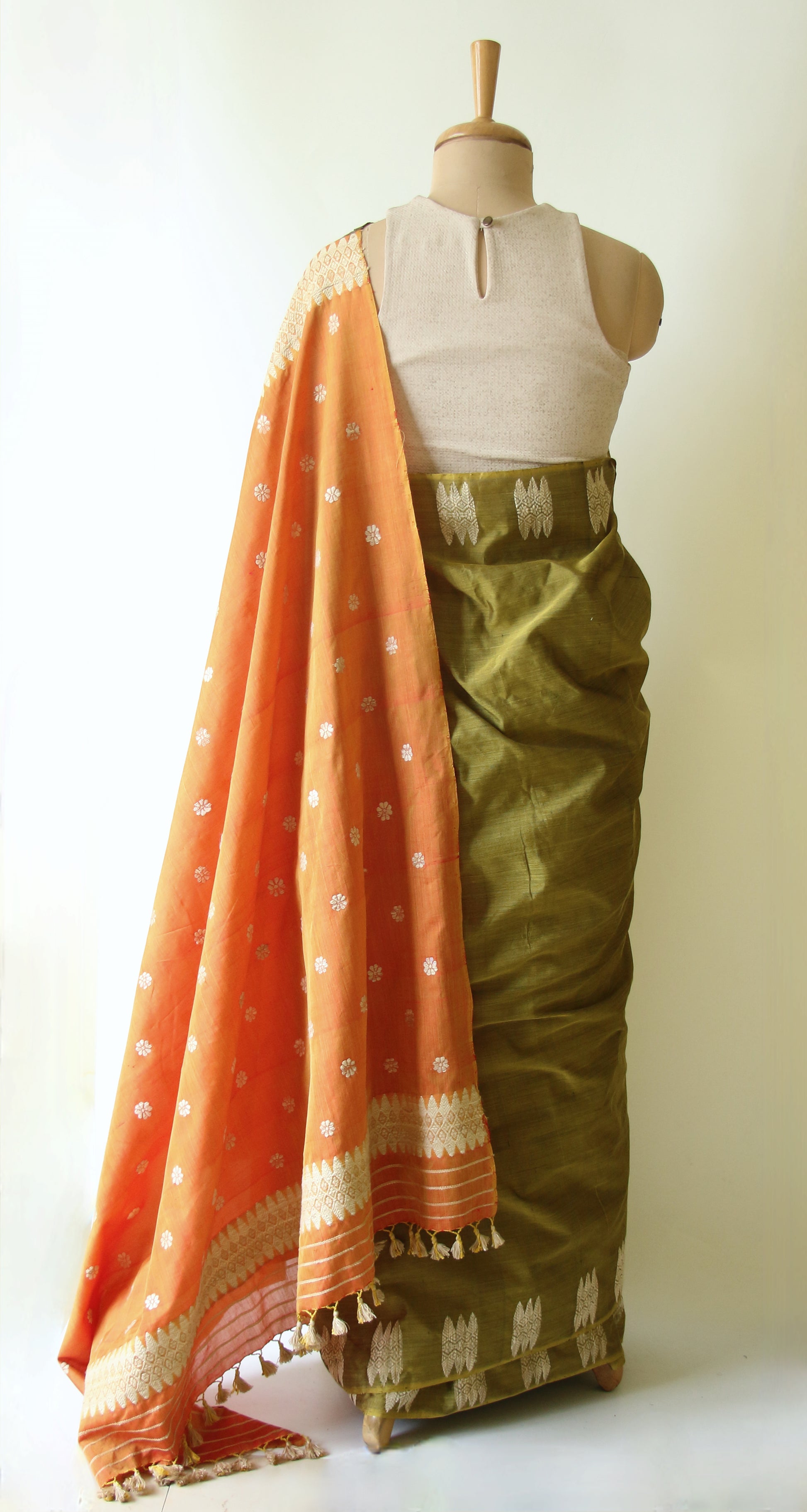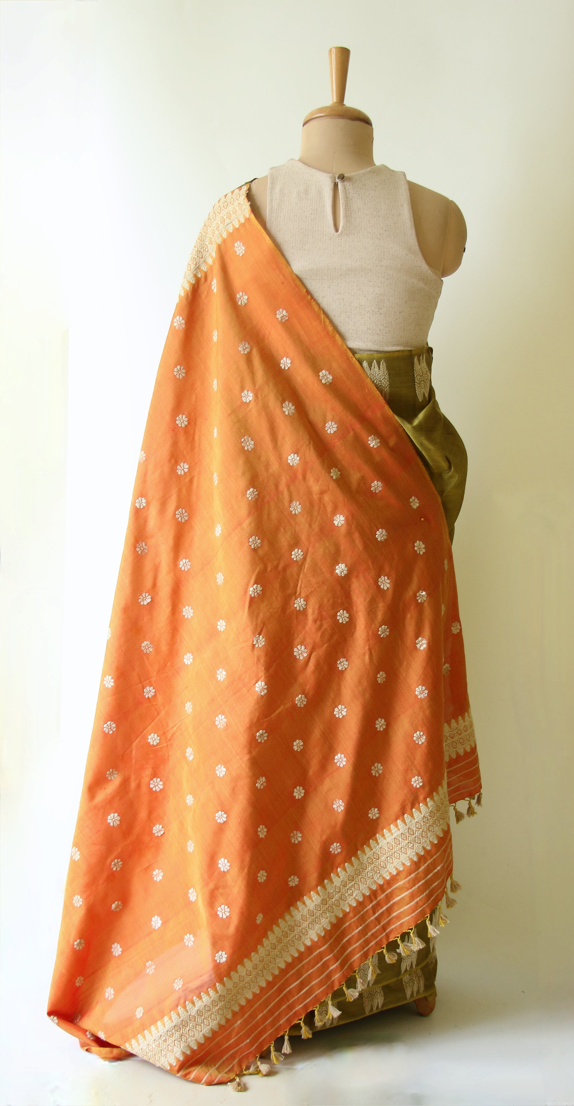 The saree has Modal yarns in the warp and Raw Mulberry Silk Yarns in the weft . The interwoven motif yarns are in Eri Silk .