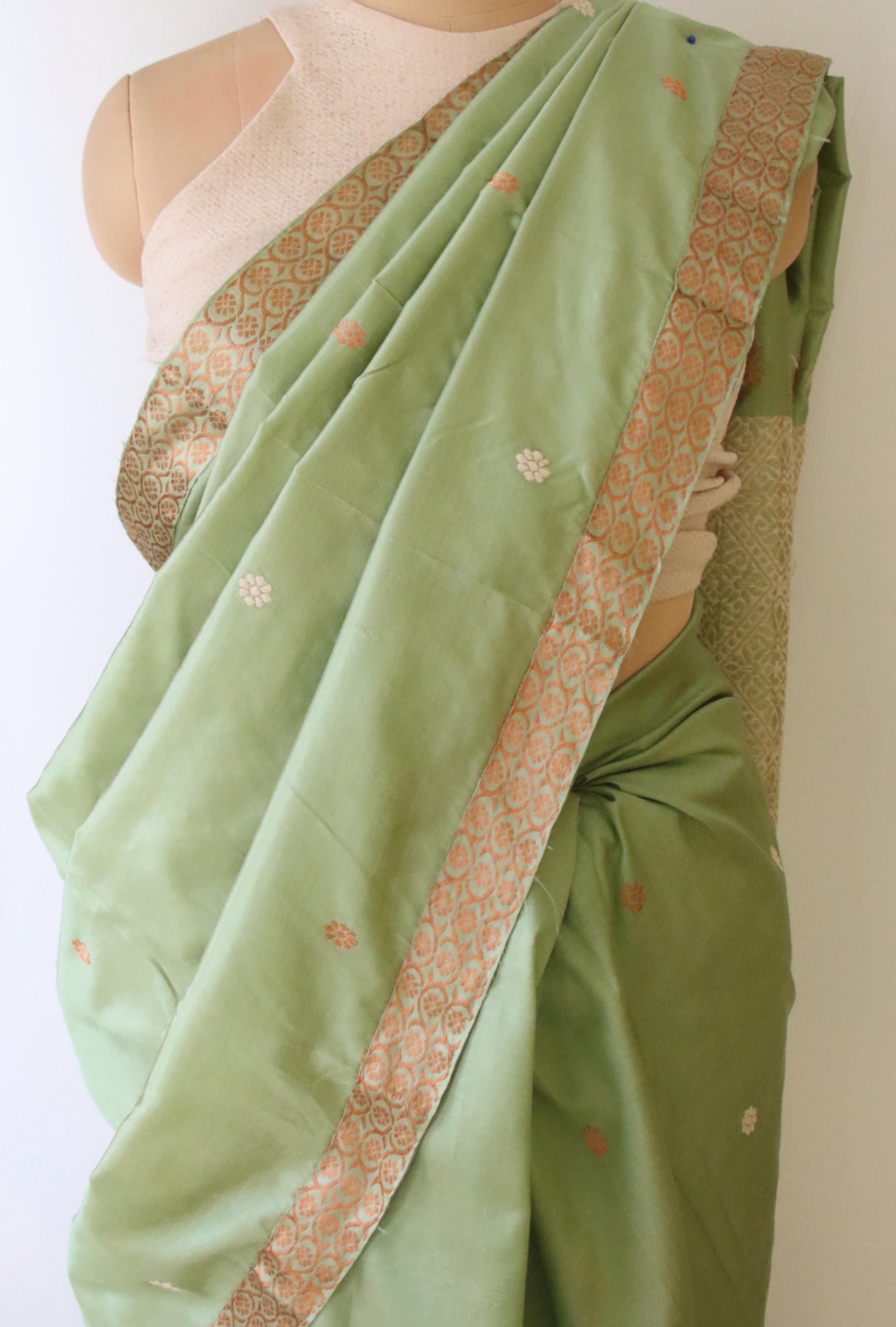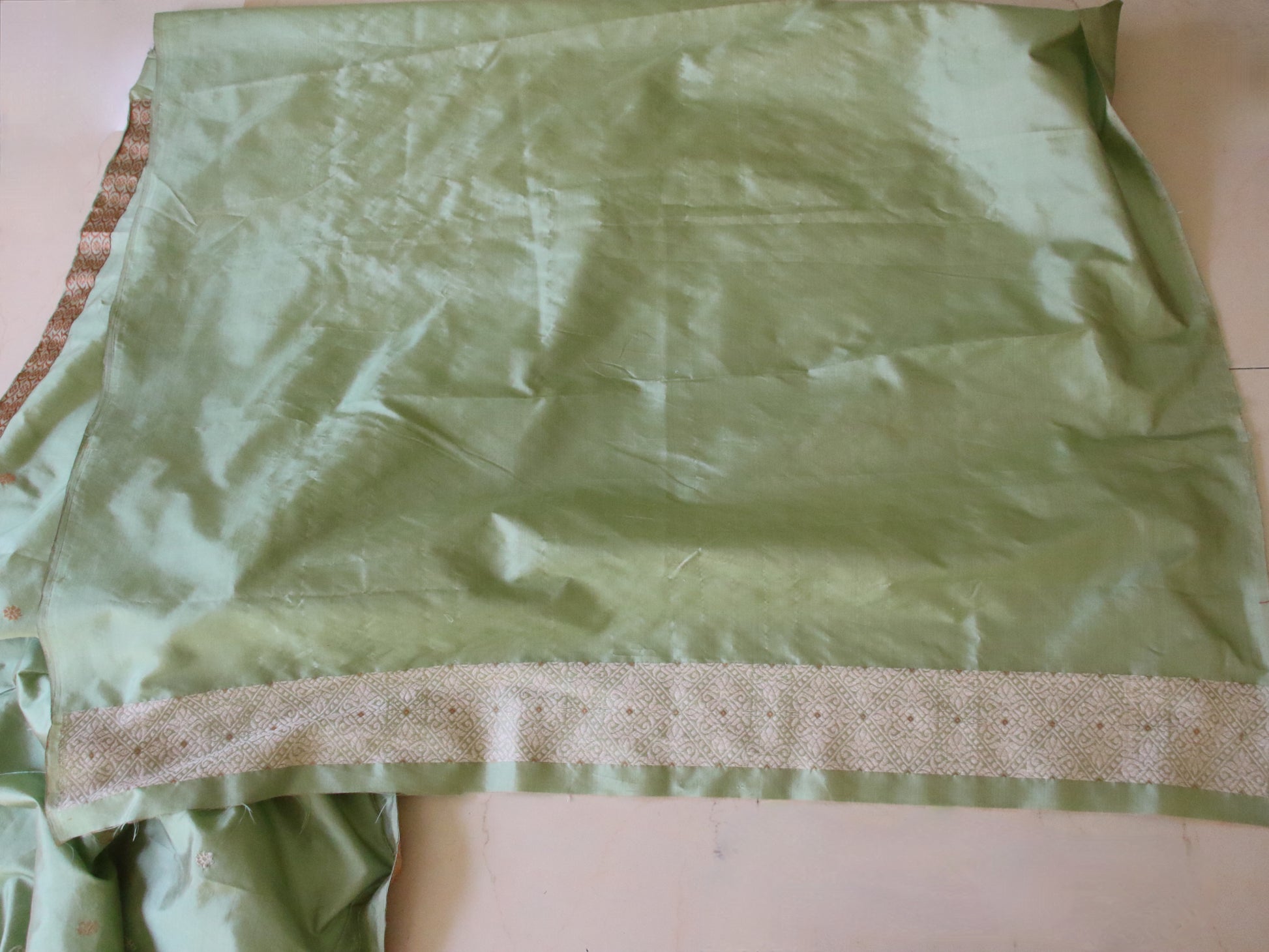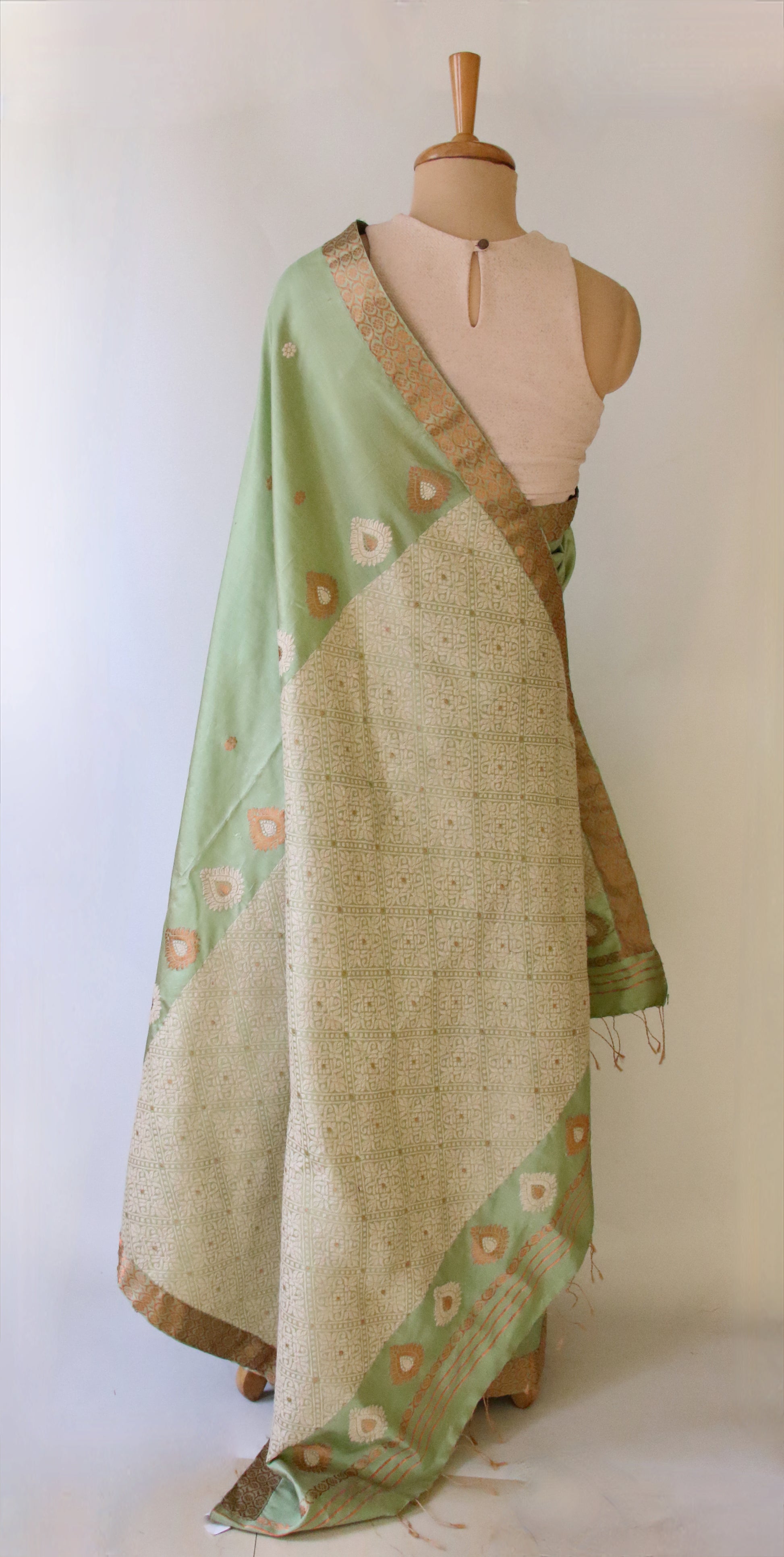 The saree has Tassar Silk in the warp and Mulberry silk in the weft . Mulberry Silk is also known as 'Pat Silk' locally. The interwoven motifs are in copper zari and silk noil.