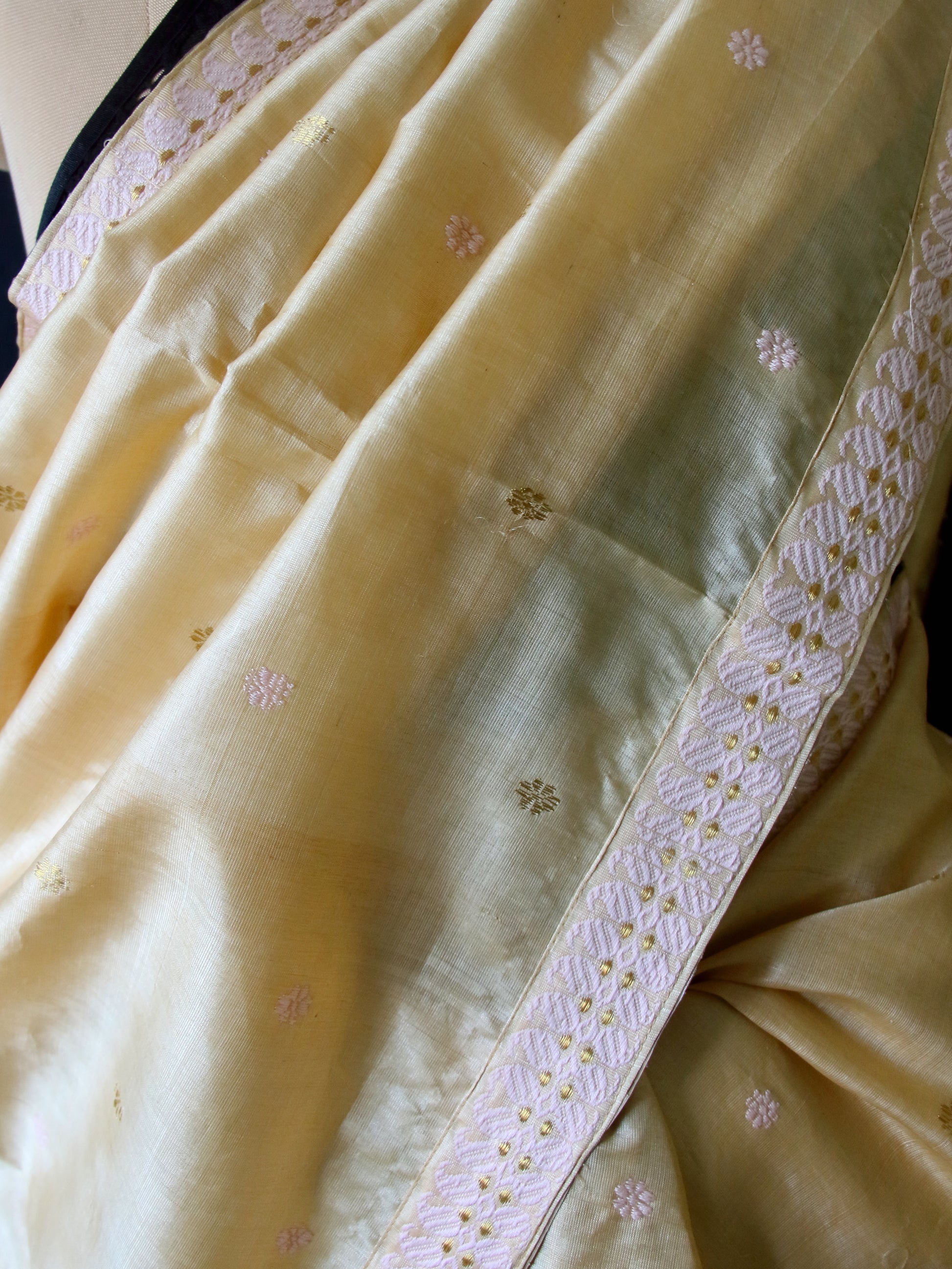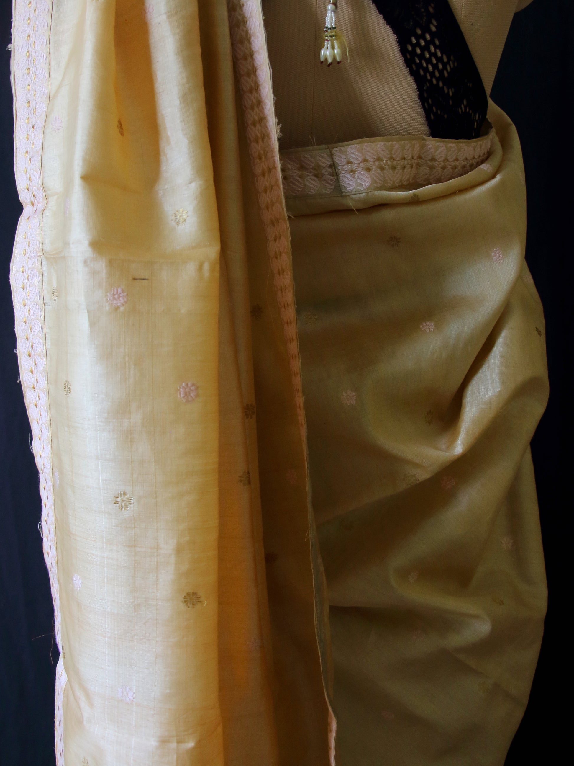 It has Tassar silk in the warp and weft . The interwoven motifs are in cotton and zari.