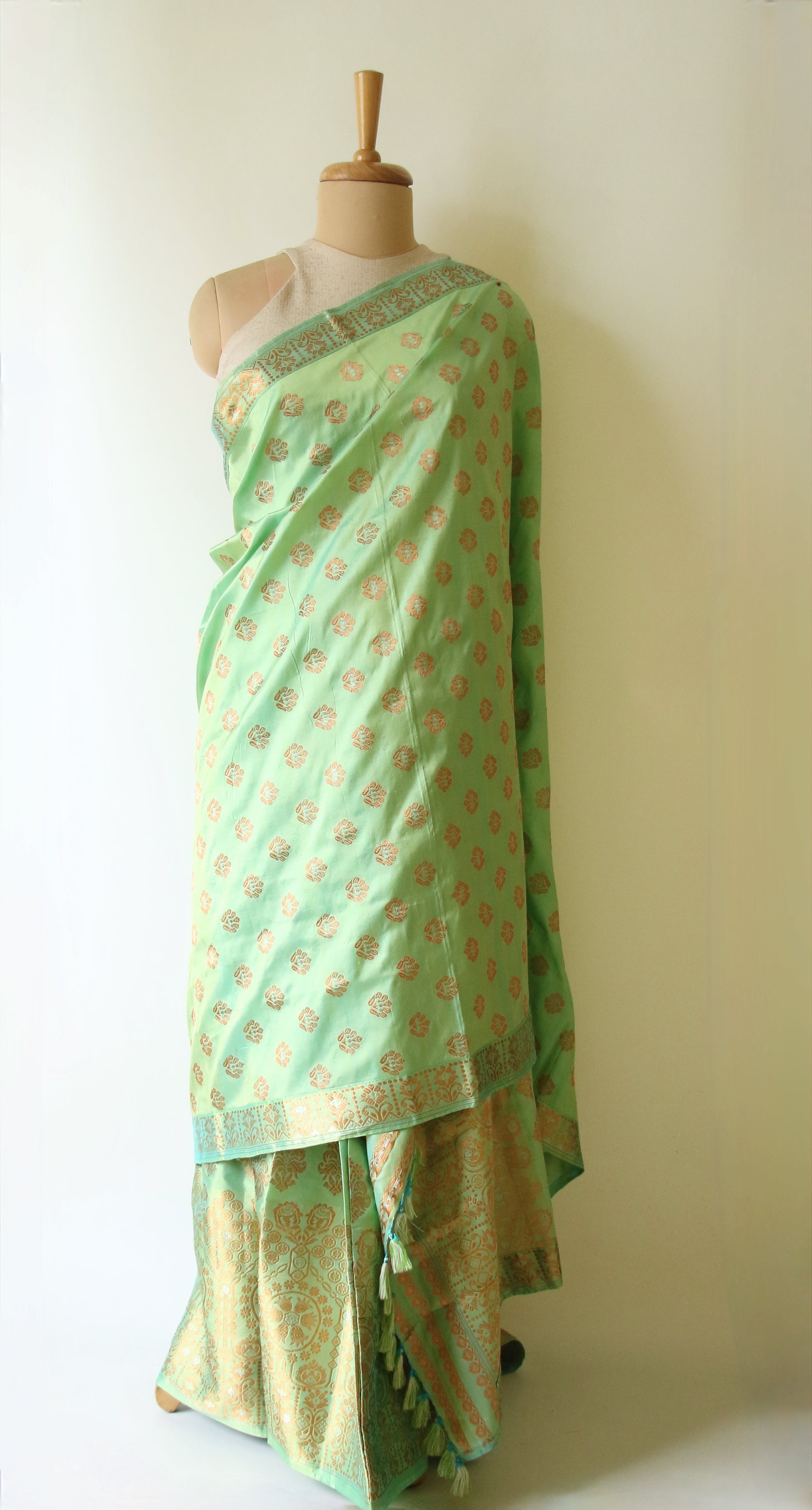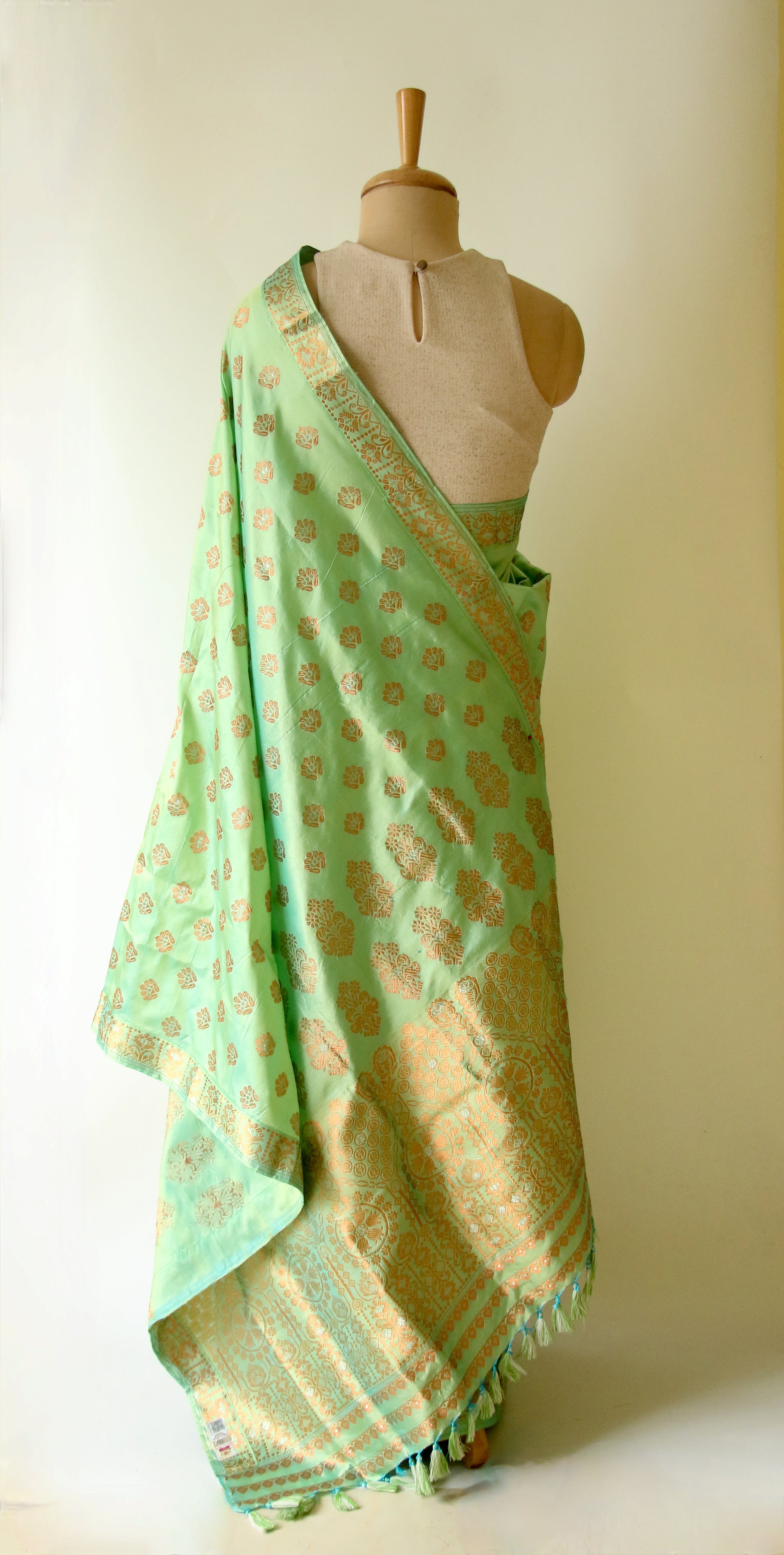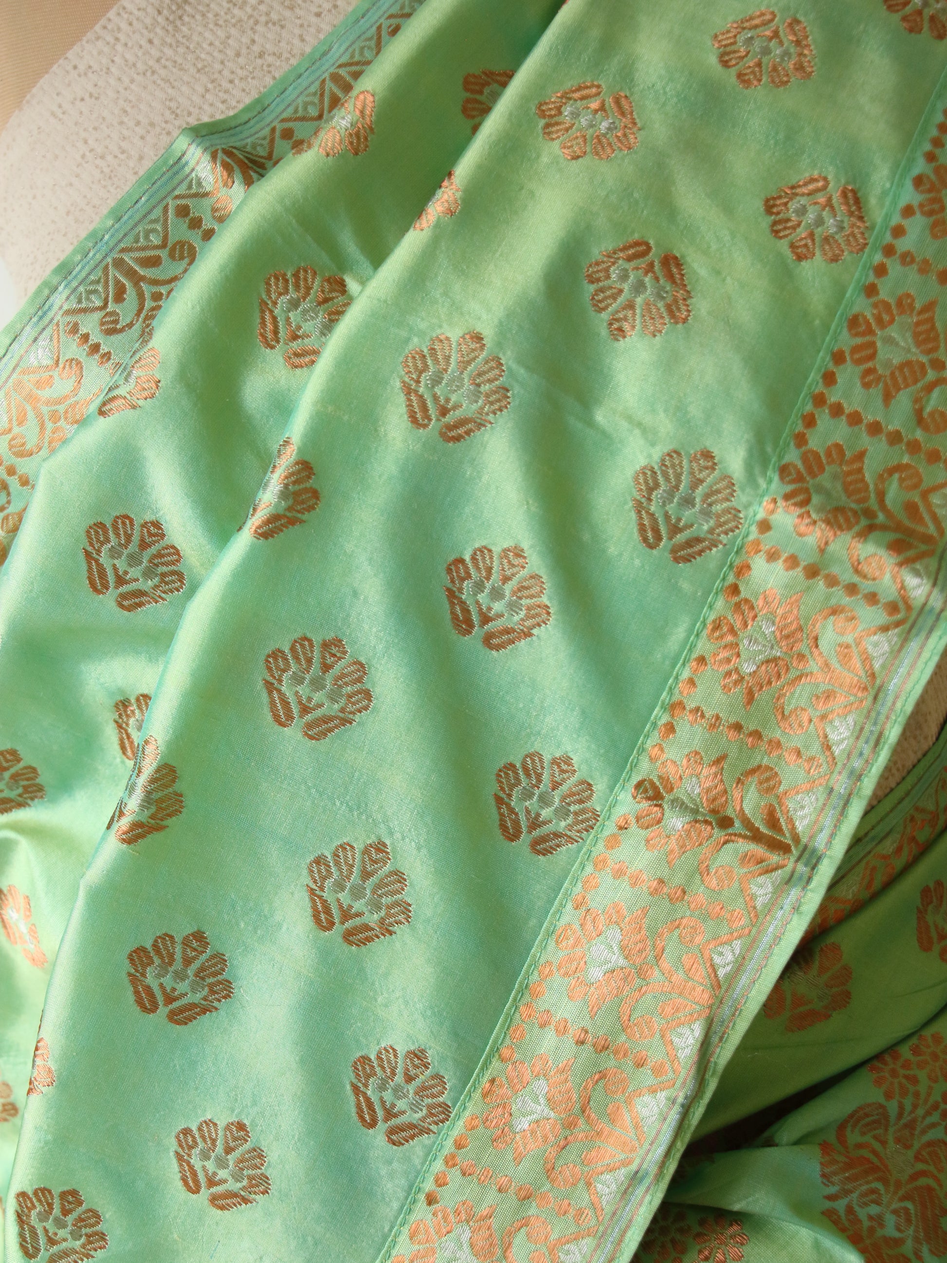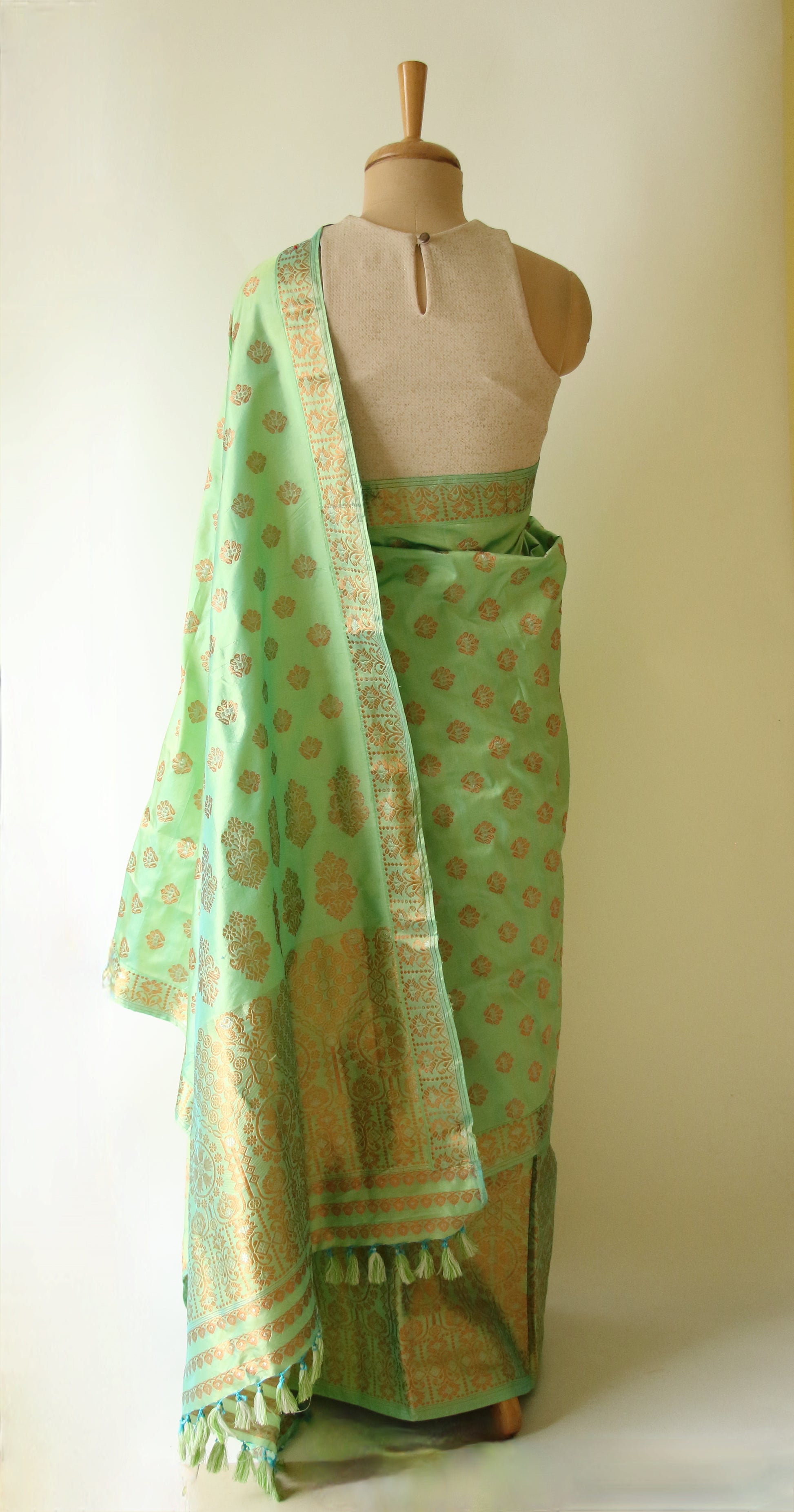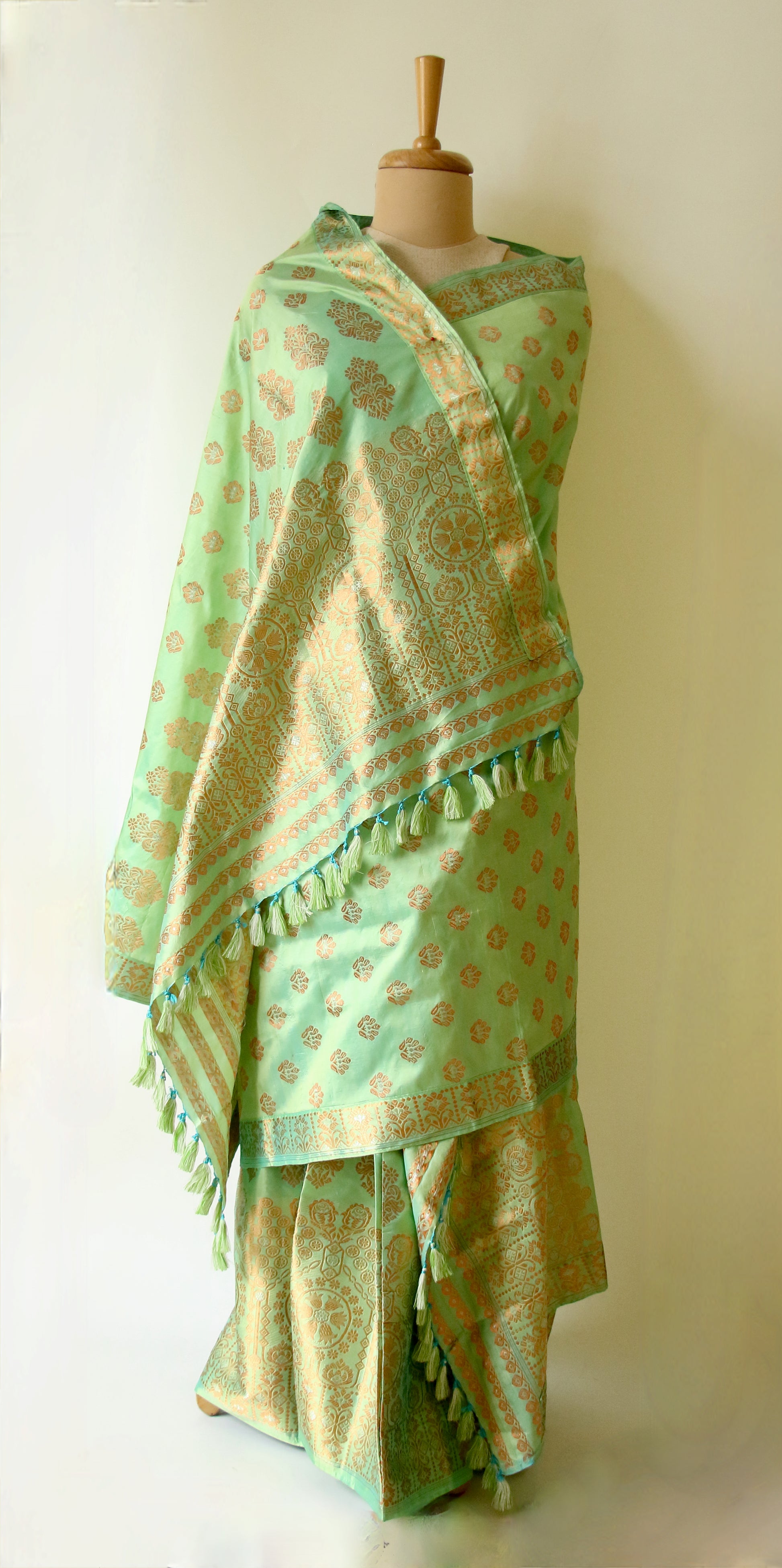 Dark Pista Green all over motifs silk Mekhela Chador set from our looms in Assam , India.