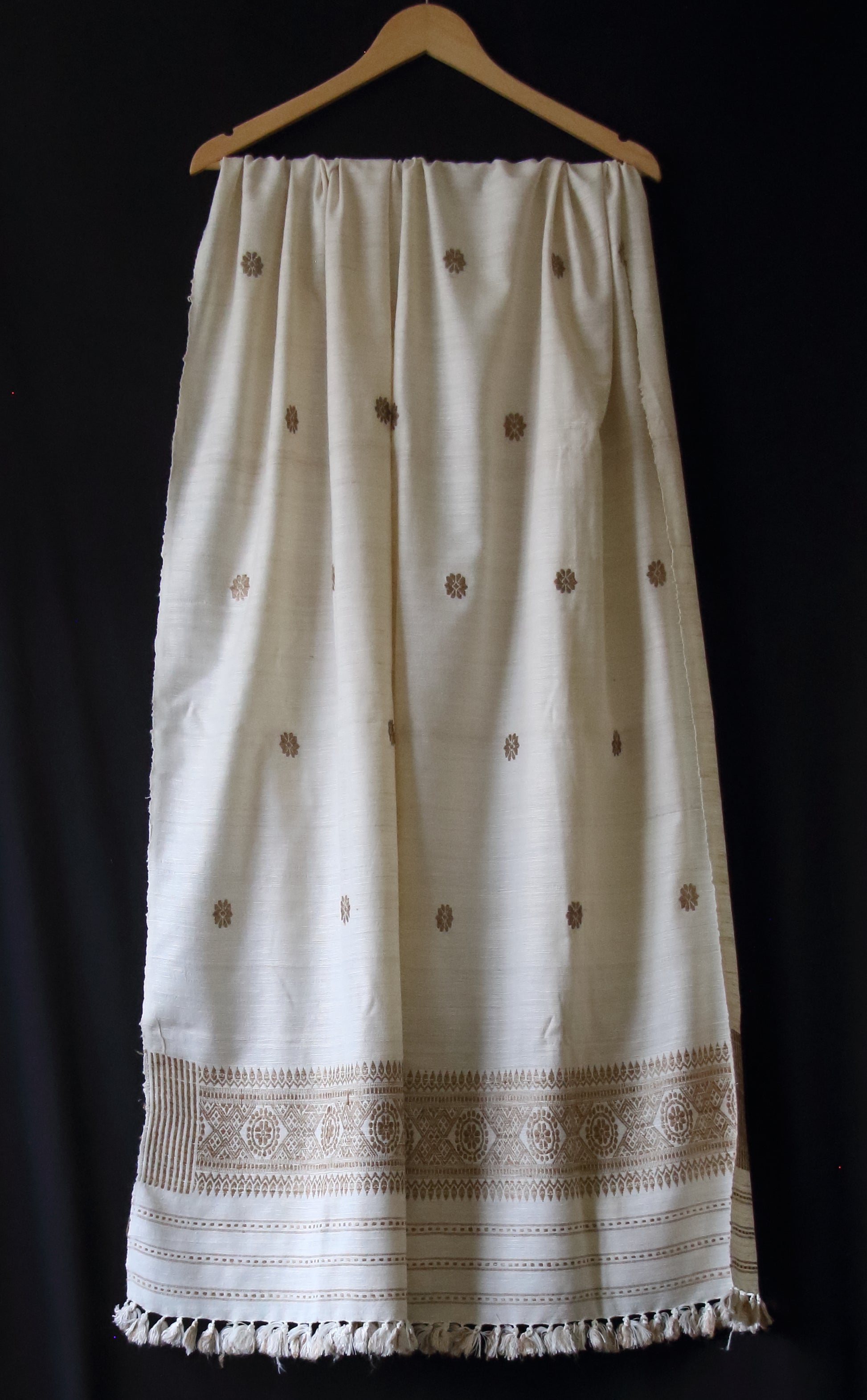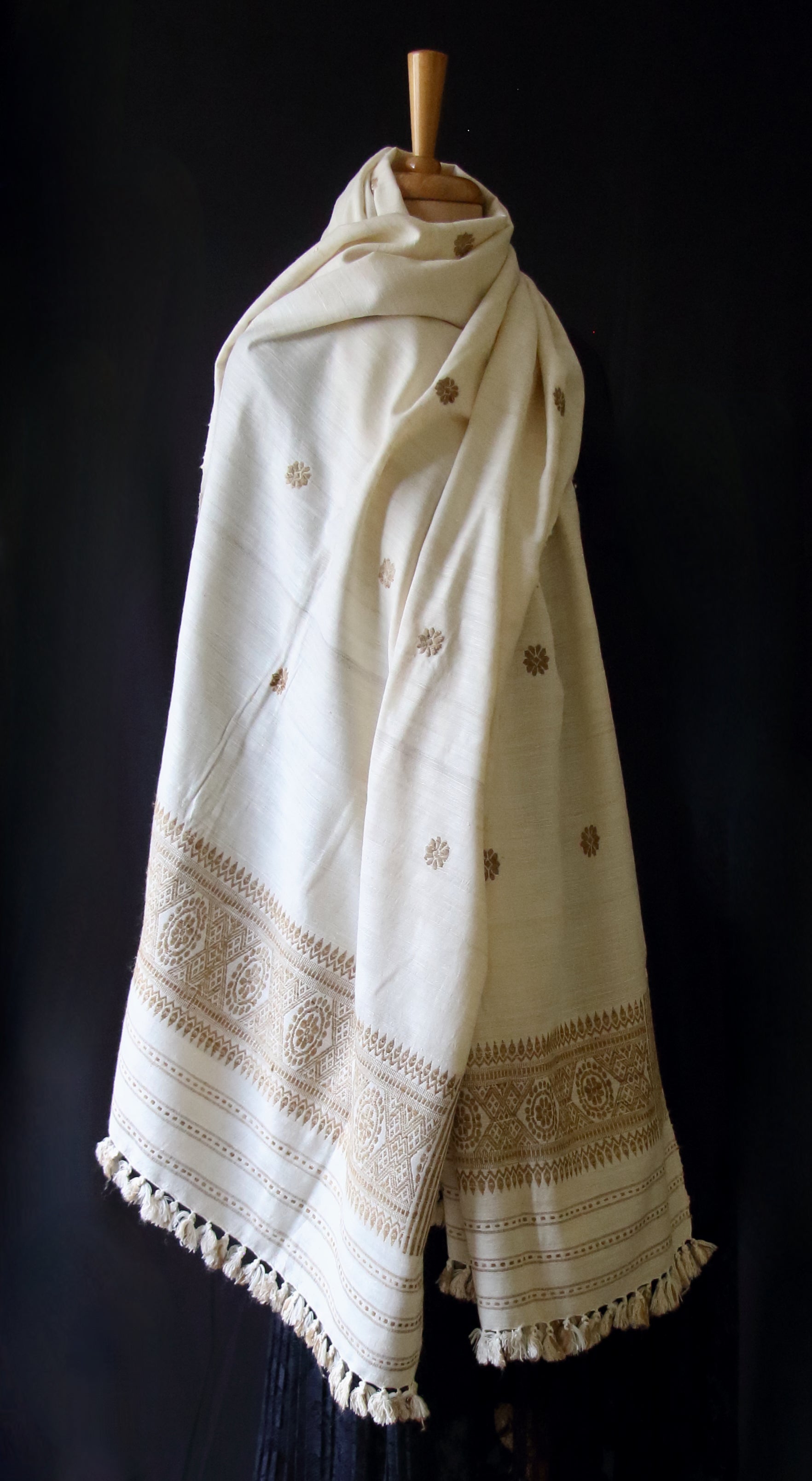 The shawl is made from Eri Silk Yarns in the traditional looms in Assam by women weavers . The off white colour of the shawl is it's natural colours and the beige motifs are the natural colour of Muga ghicha silk.
