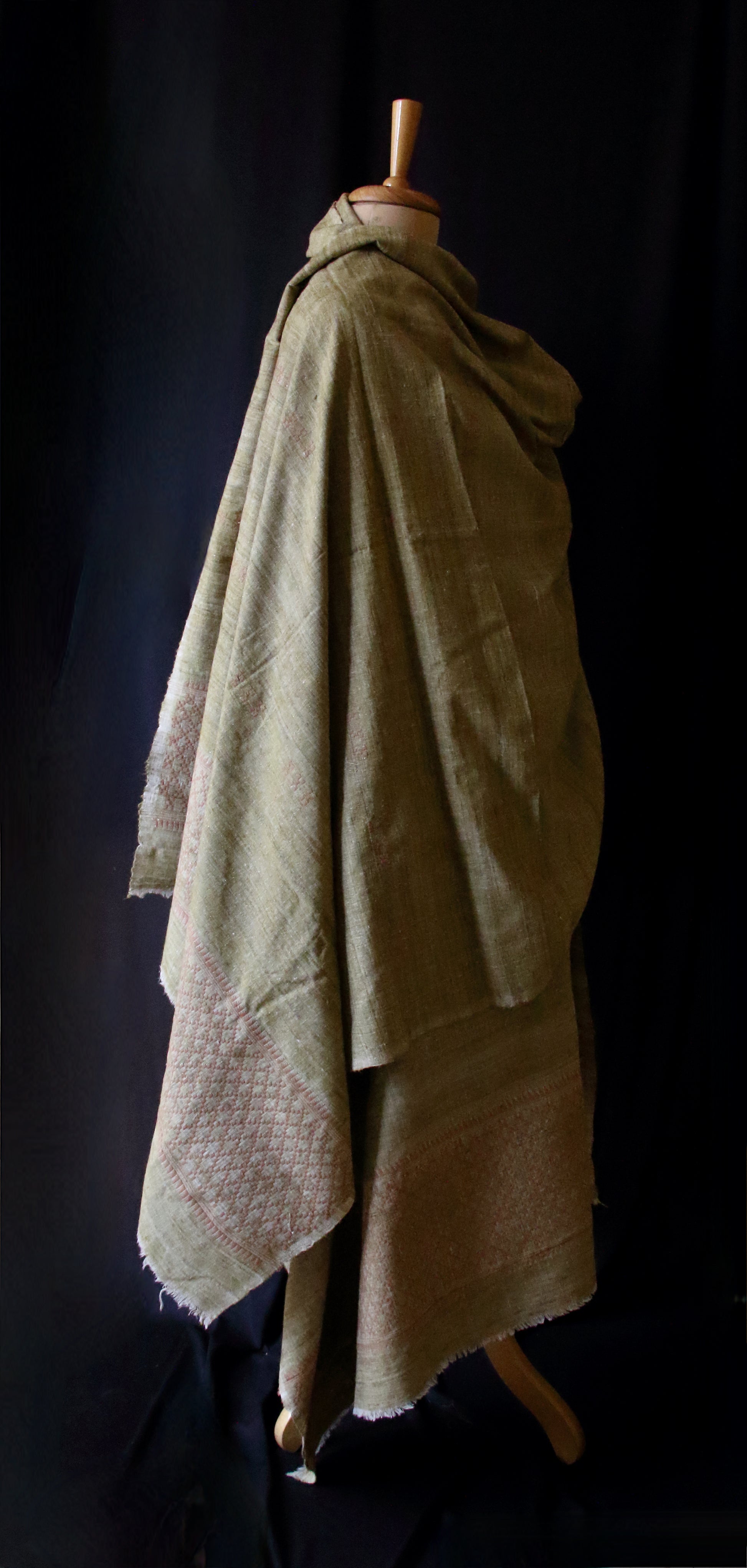 The Shawl has natural dyed hand spun yarns and the motifs are in natural dyed Eri silk . All yarns including the motif yarns are hand spun yarns