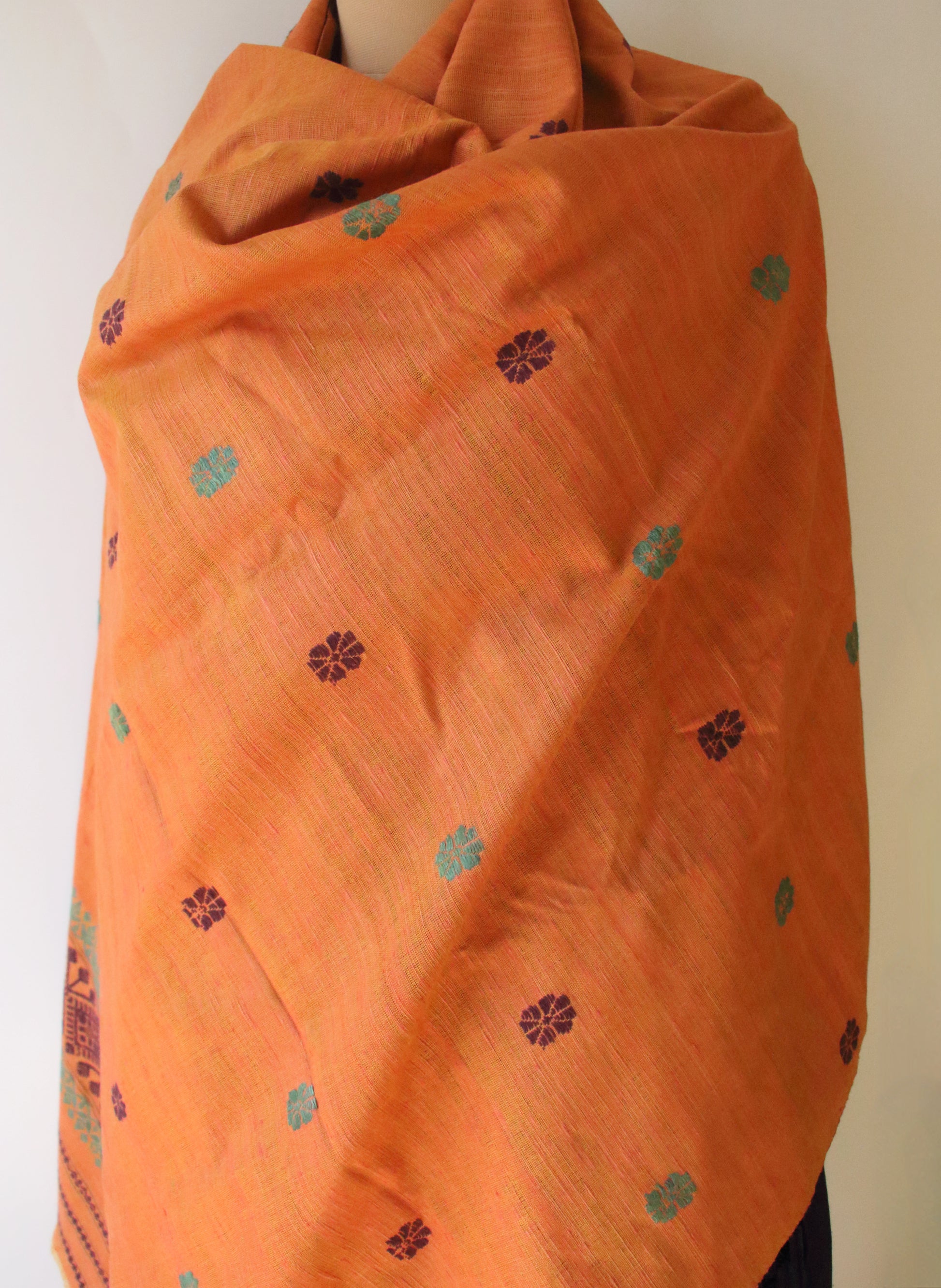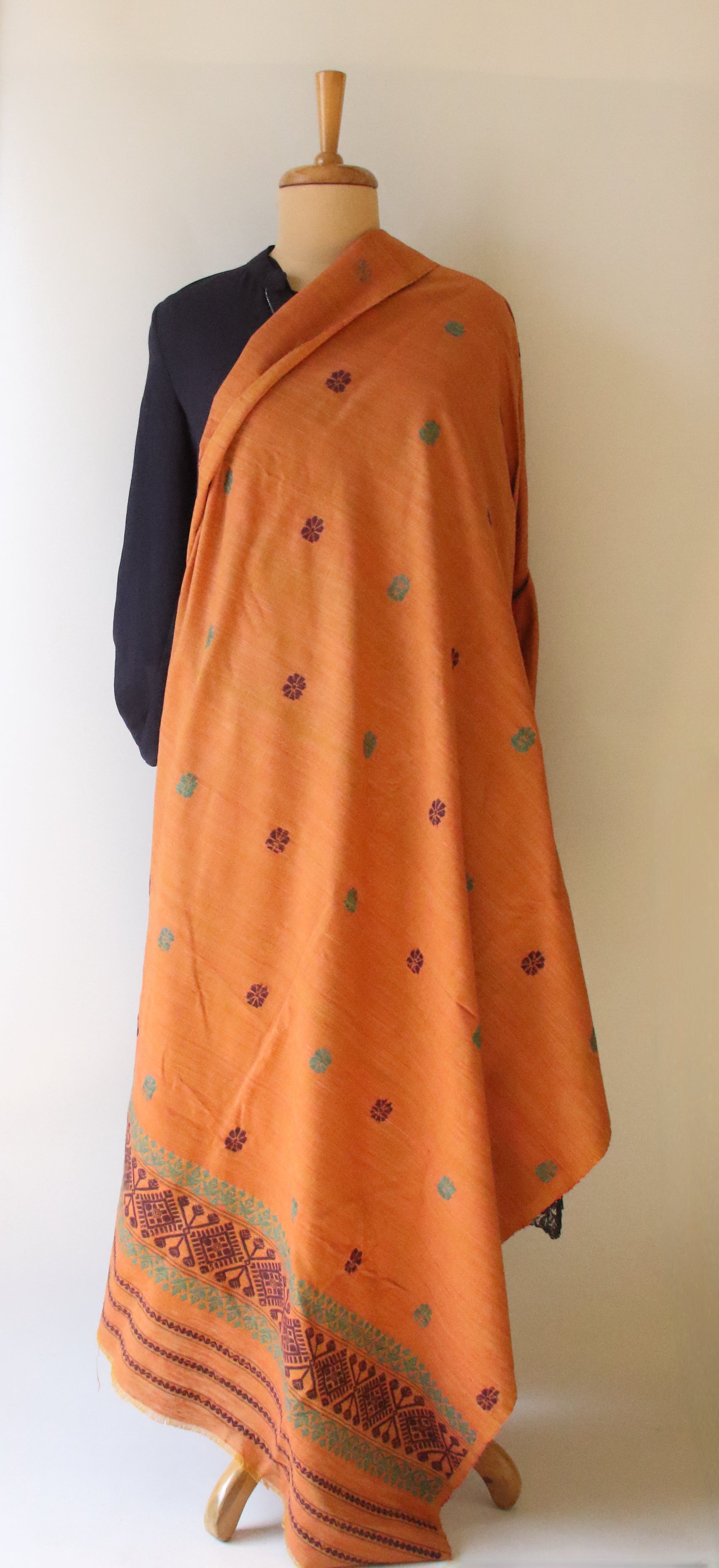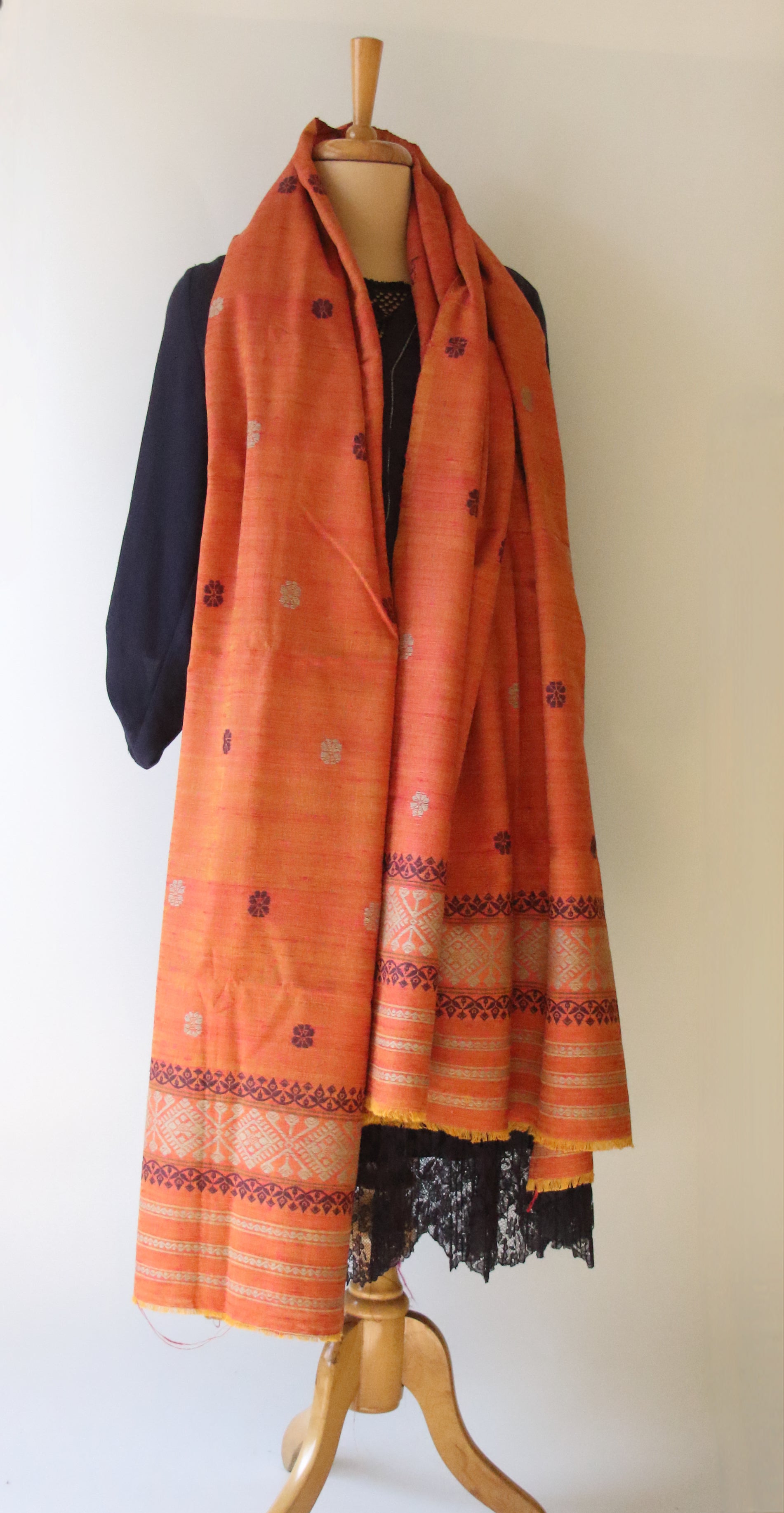 The Shawl has natural dyed hand spun  Eri Silk yarns in the weft and natural dyed Cotton yarns in the warp and the motifs are in natural dyed Eri silk .