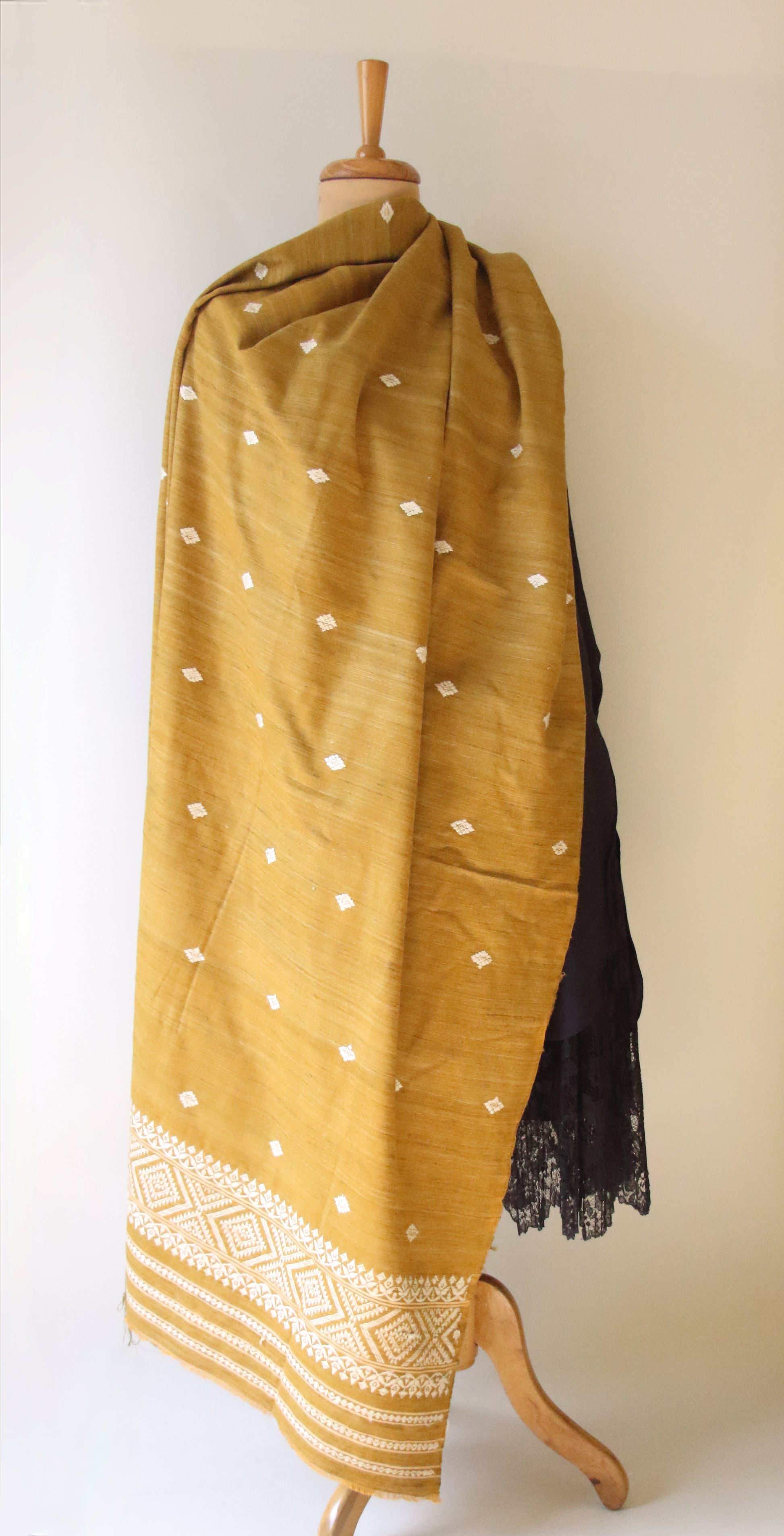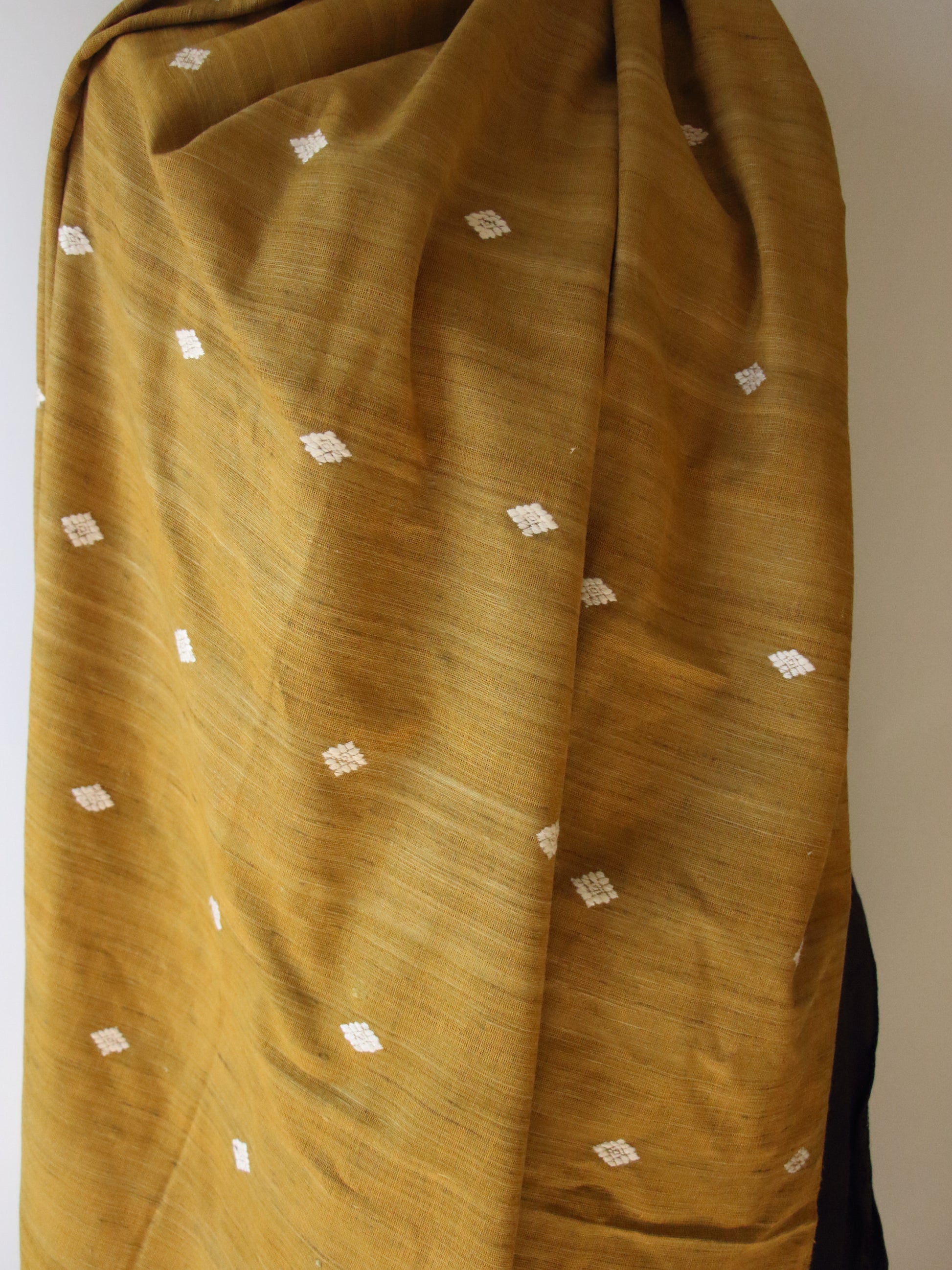 The Shawl has natural dyed hand spun Eri Silk yarns in the weft and natural dyed Cotton yarns in the warp and the motifs are in natural off white eri silk.