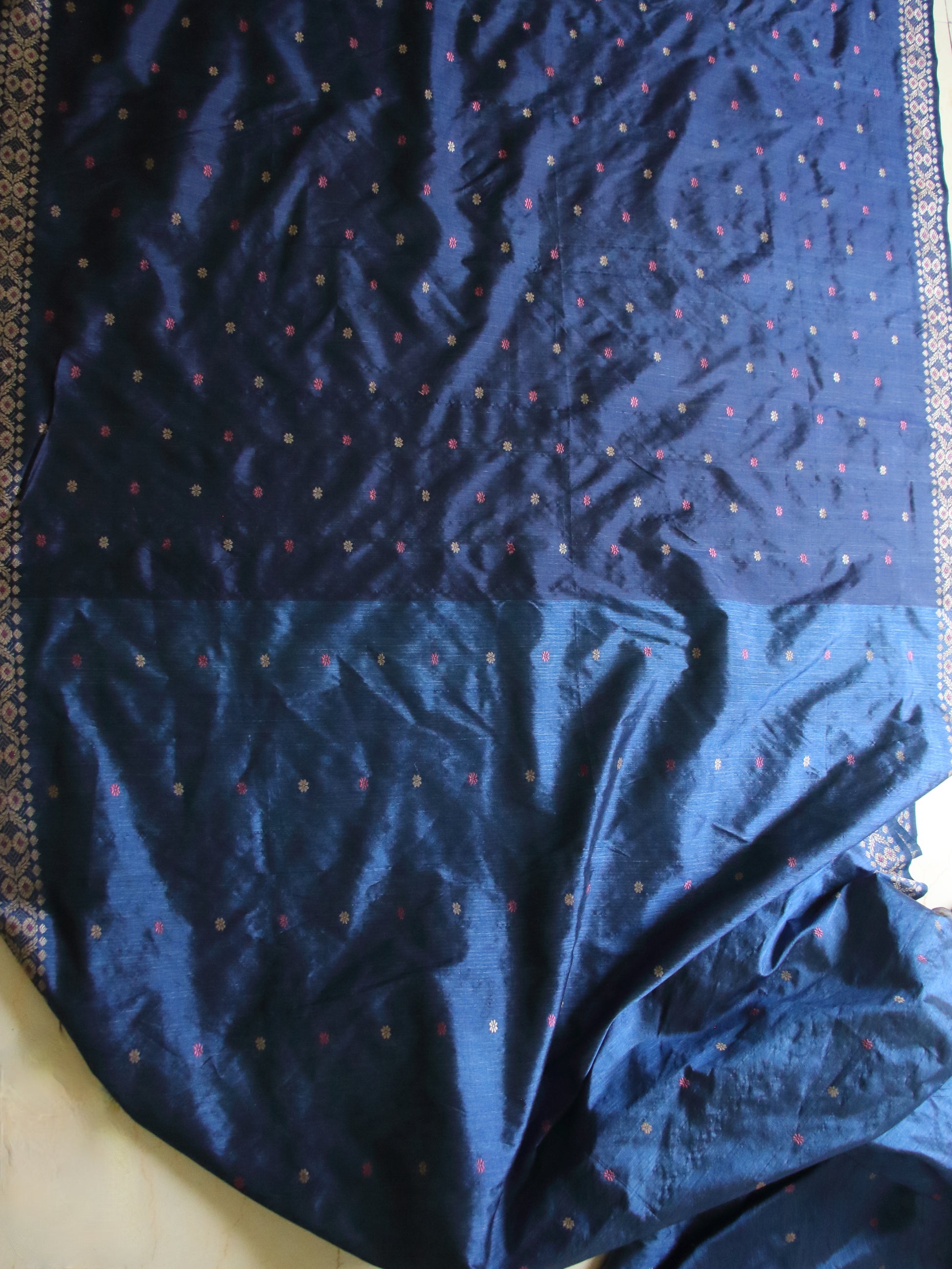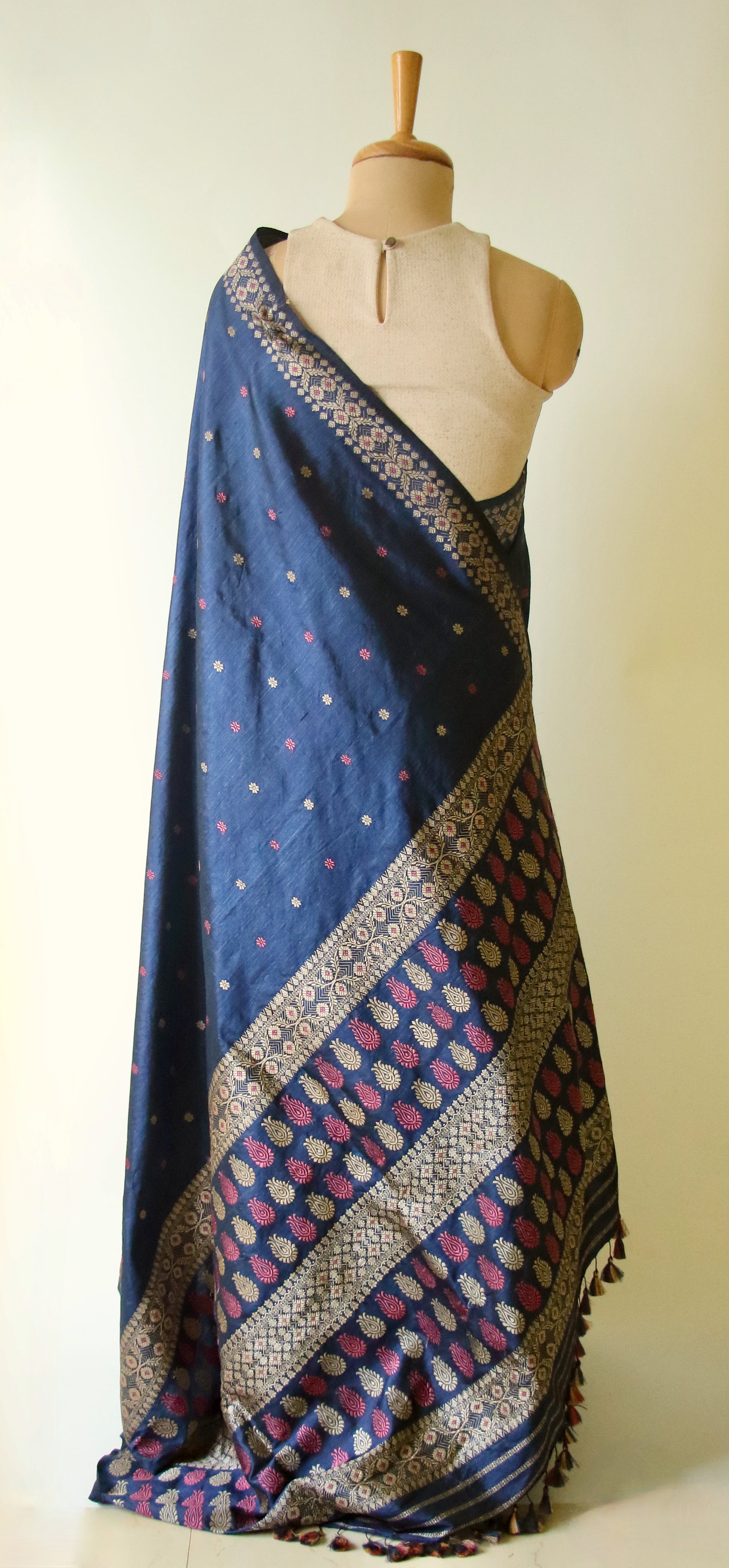 Indigo Natural Dyed Mulberry Silk Saree, Muga Silk Motifs