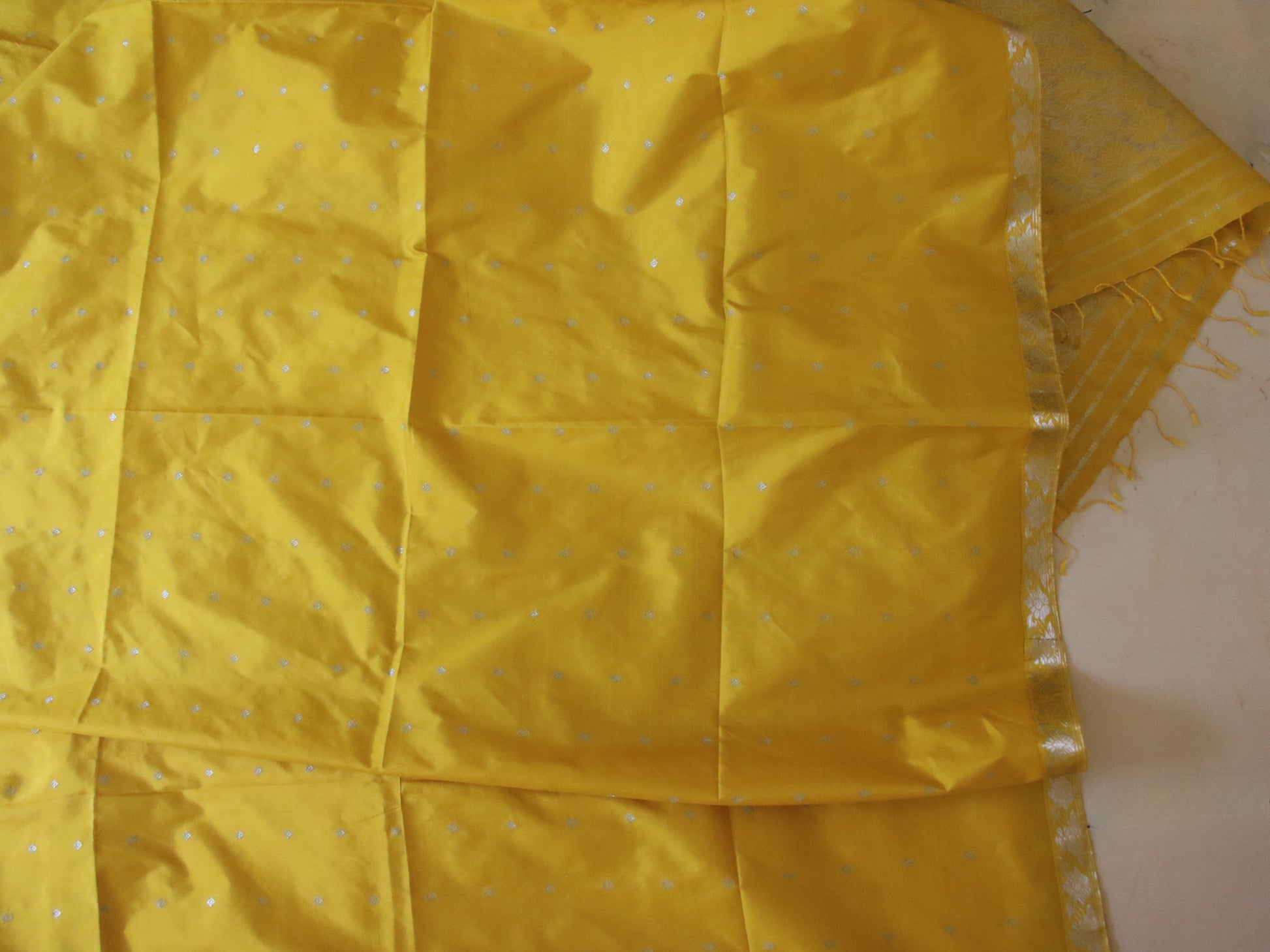 The Mekhla and Chador is a traditional 2 piece dress from the North East State of Assam, India . The Mekhla is appx 1.20 Mt in length and 37" width when stitched. The Warp will have pleats when worn. The top part or 'chadar ' is a shawl or half -sari which is used to cover the upper portion of the body and is worn on top of the mekhla or wrap. The usual size is 3 Meters long and about 37 inches in width.