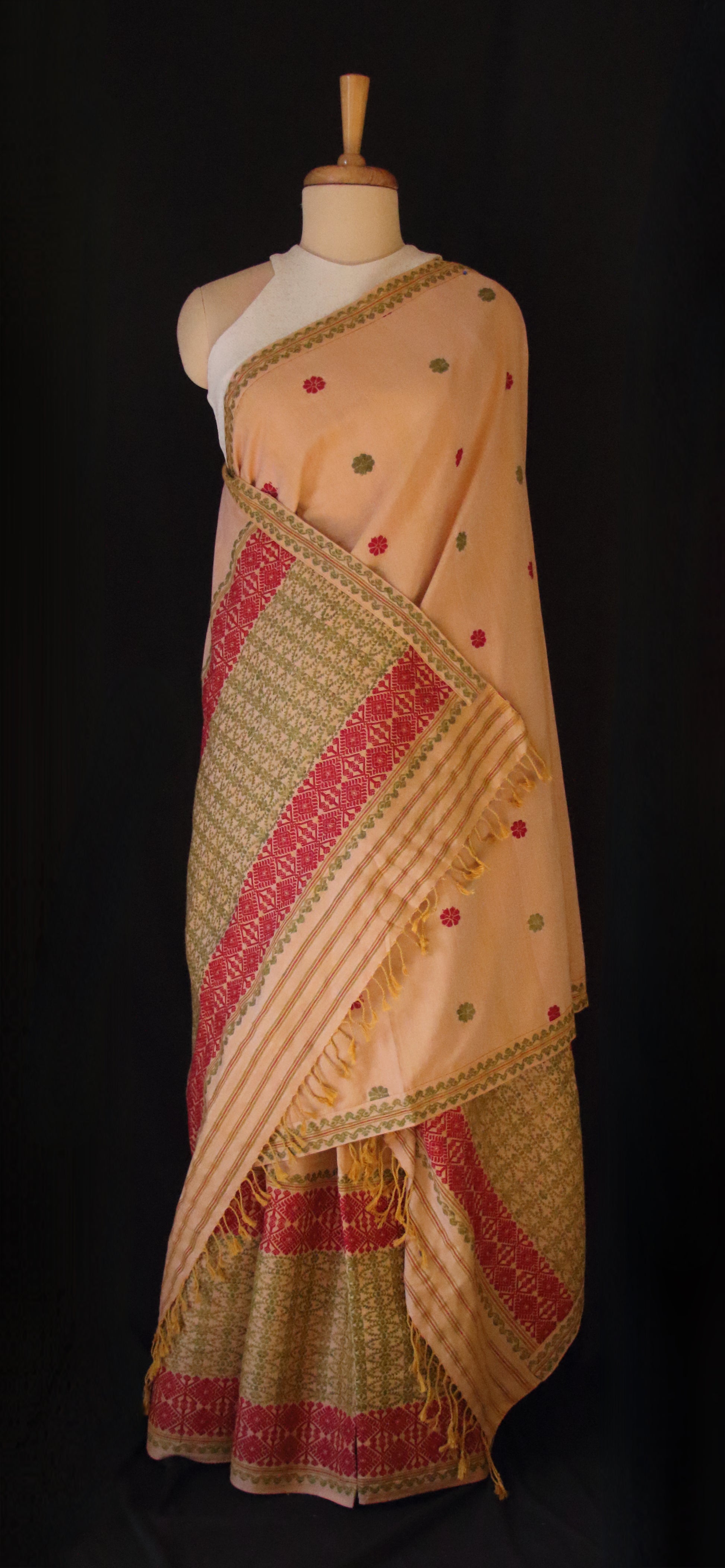 The Mekhla and Chador is a  traditional 2 piece dress from the North East State of Assam, India . The Mekhla is appx 45" length and 36" width when stitched . It is worn as a skirt over the petticoat .  The skirt  will have pleats when worn. The top part or 'chadar ' is a shawl or half -sari which is used to cover the upper portion of the body and is worn on top of the mekhla or wrap. The usual size is 3 Meters long and about 36 inches in width.