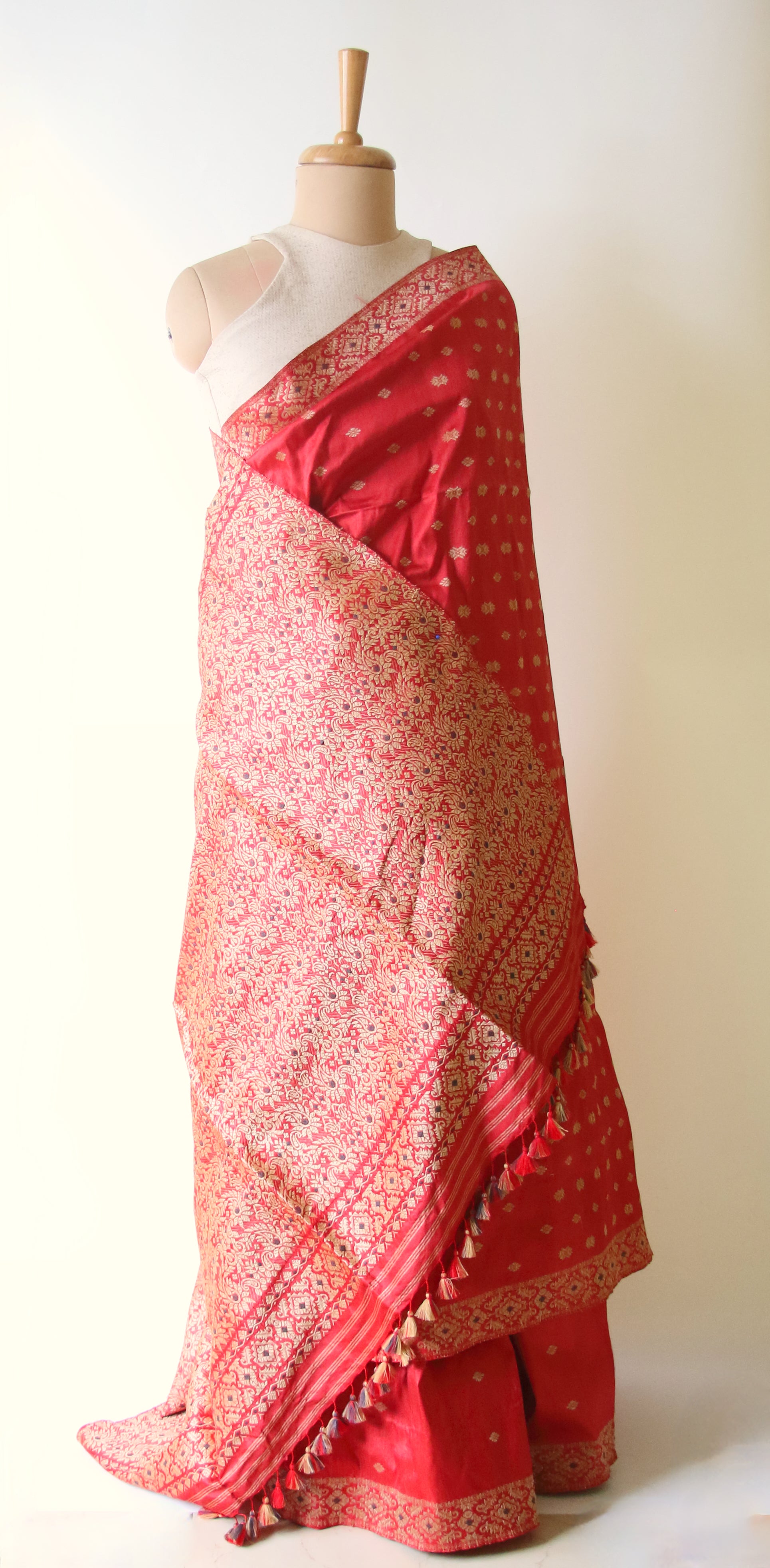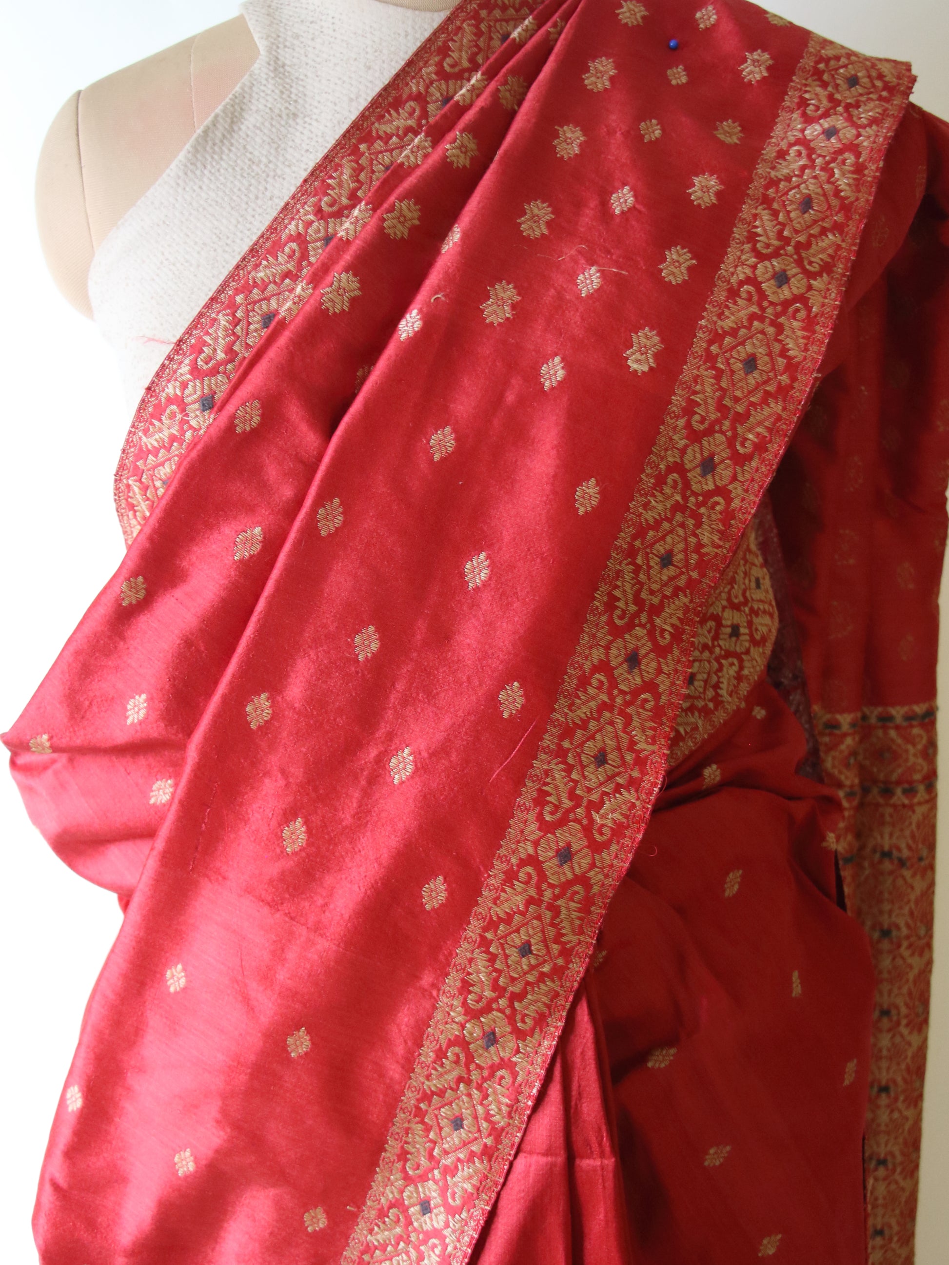 The saree has mulberry silk in the warp and weft and the entire golden motifs have been woven with Muga Silk . The mulberry silk yarns are natural dyed .The Saree can be worn as a bridal saree.
