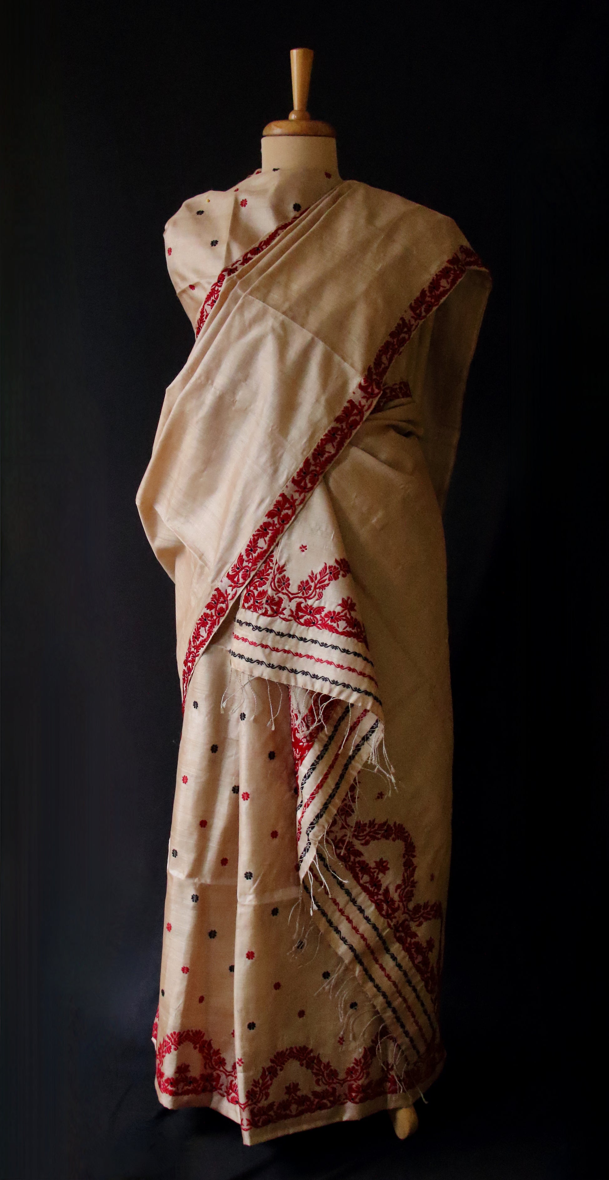 The Mekhla and Chador is a traditional 2 piece dress from the North East State of Assam, India . The Mekhla is appx 1.20 Mt in length and 37" width when stiched. The Warp will have pleats when worn. The top part or 'chadar ' is a shawl or half -sari which is used to cover the upper portion of the body and is worn on top of the mekhla or wrap. The usual size is 3 Meters long and about 37 inches in width.
