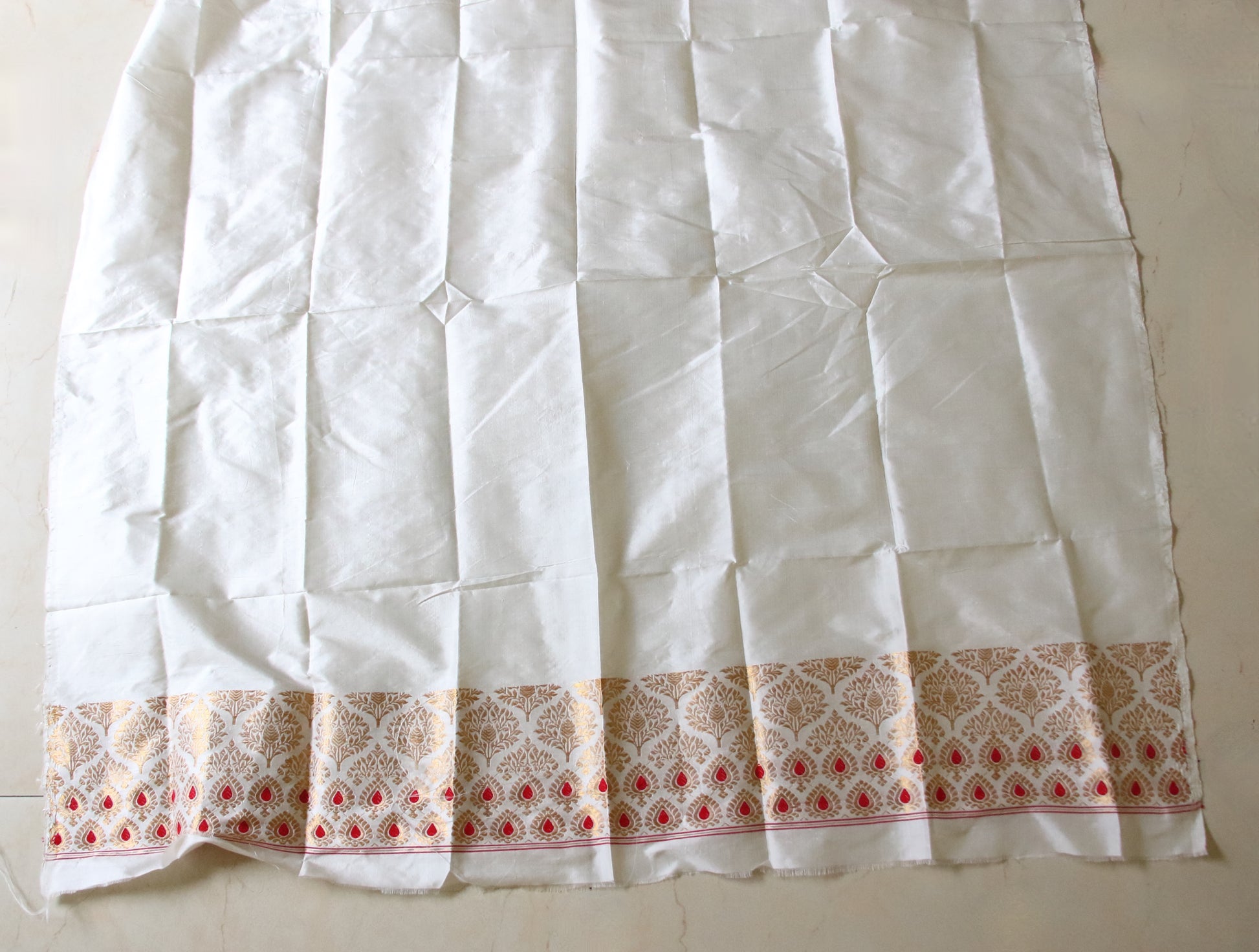 The Mekhla and Chador is a  traditional 2 piece dress from the North East State of Assam, India . The Mekhla is  appx 1.20 Mt in length and 37" width when stitched. The Warp will have pleats when worn. The top part or 'chadar ' is a shawl or half -sari which is used to cover the upper portion of the body and is worn on top of the mekhla or wrap. The usual size is 2.80 to 3 Meters long and about 37 inches in width.