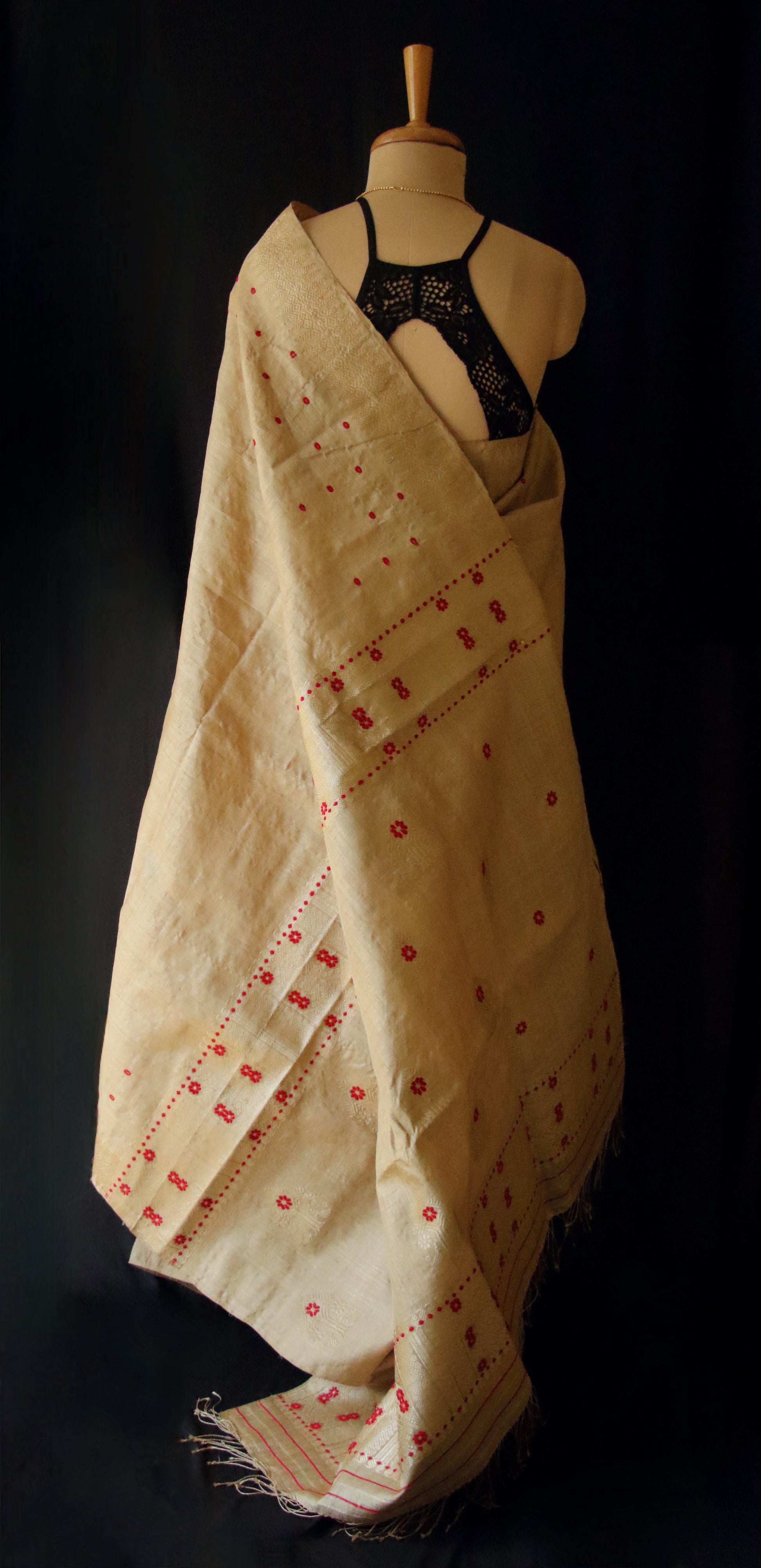 The yarn produces is a natural rich golden yellow or light brown colour depending on the host plant it feeds on. These are unique products. Muga silks resist sunshine and are more durable than mulberry silks. Muga silks can be termed Organic as no harmful chemicals have been used in the cultivation of host trees or in the processing of silk fabrics. No dyes are applied to the yarns. The golden colour is its natural colour. Most Muga rearing and cultivation is still done by village clusters in Assam in the traditional method.