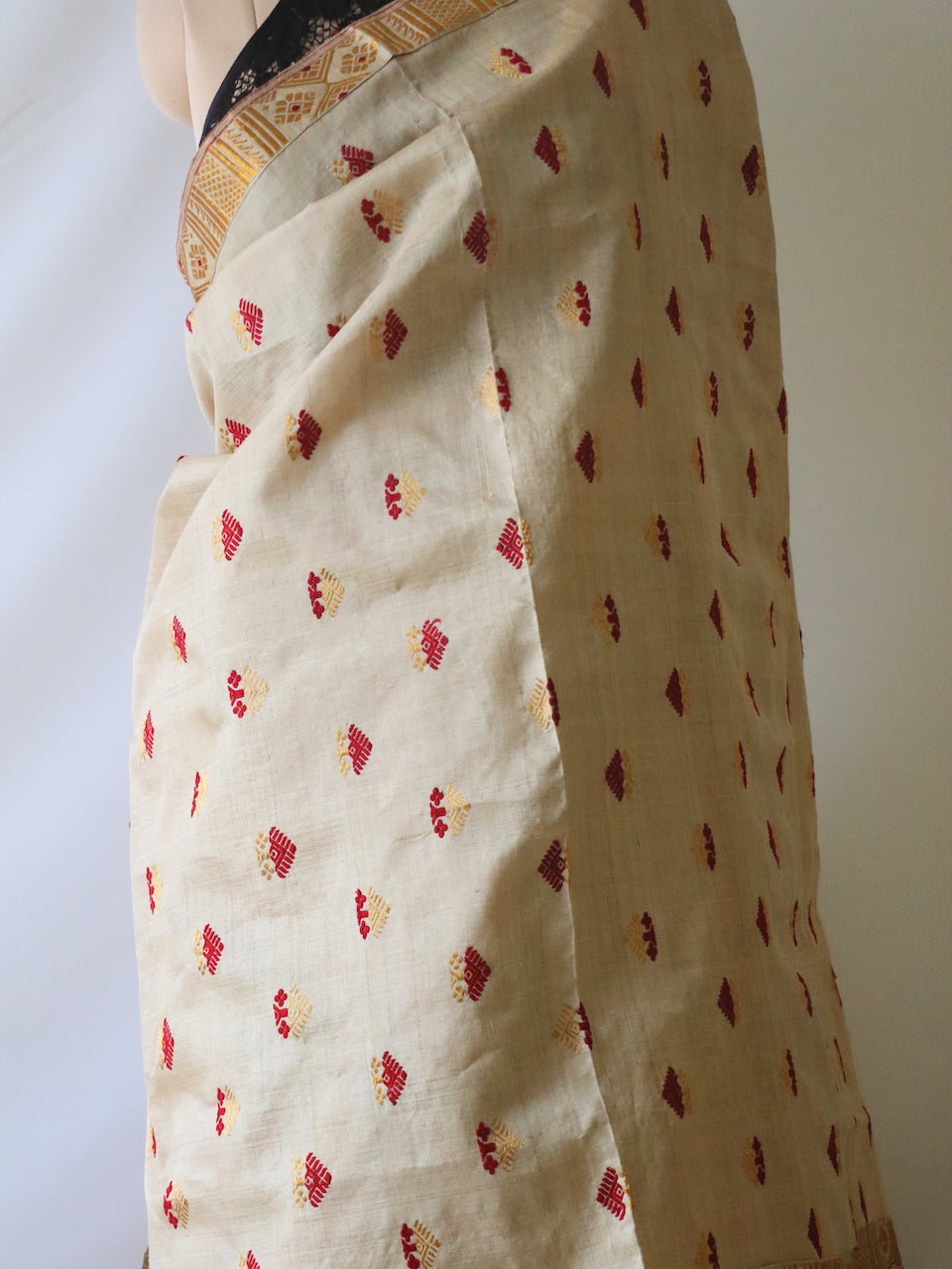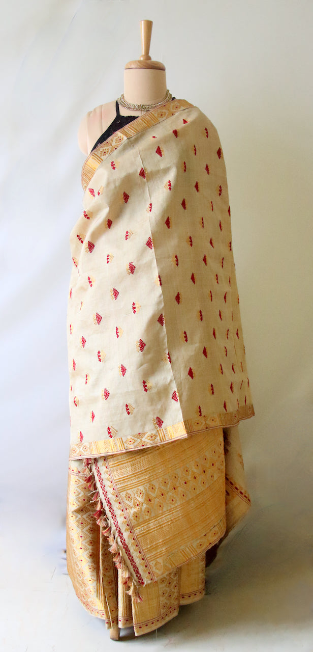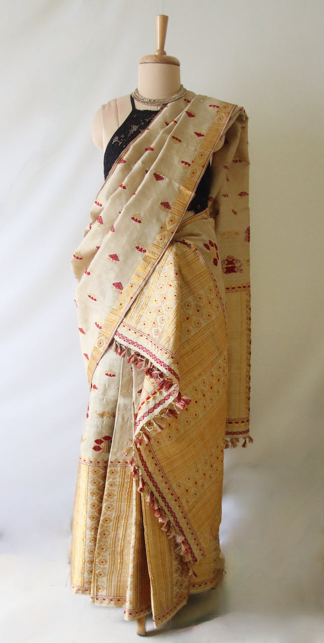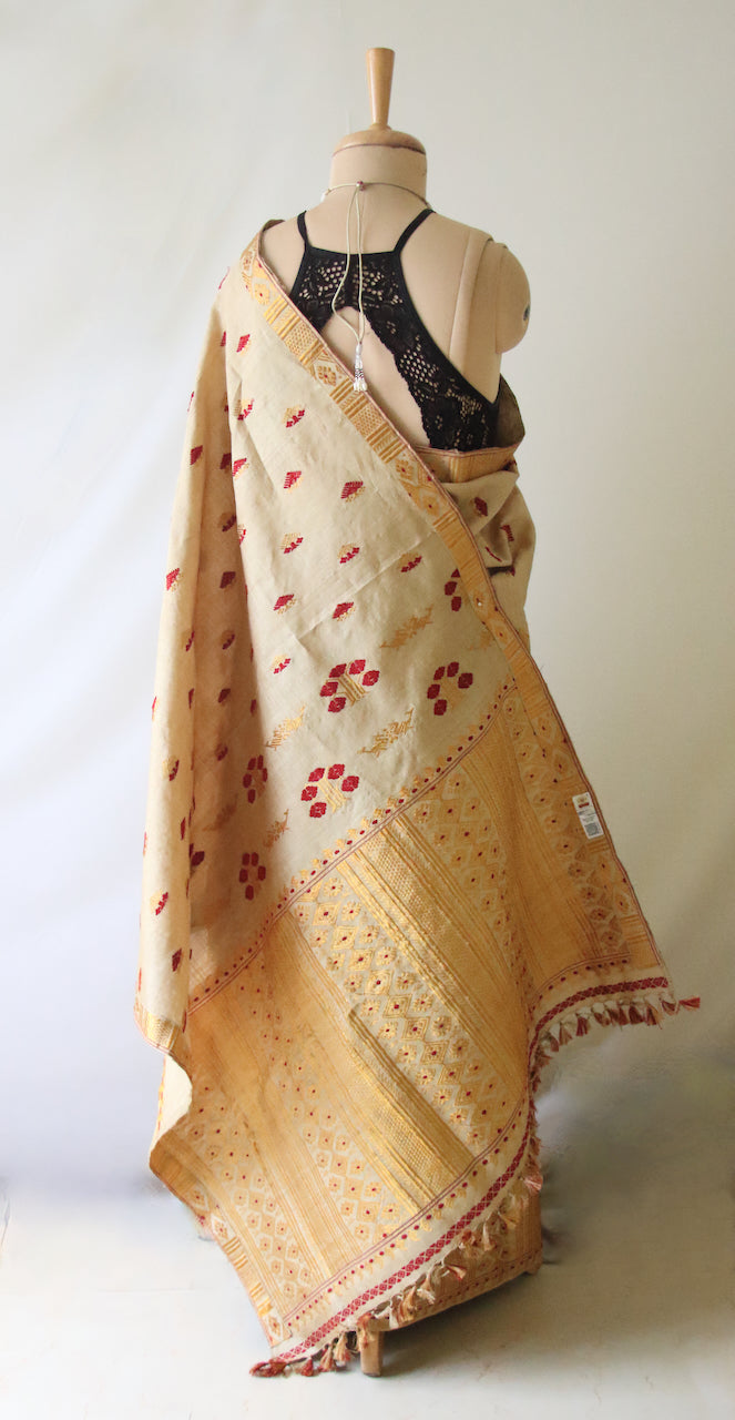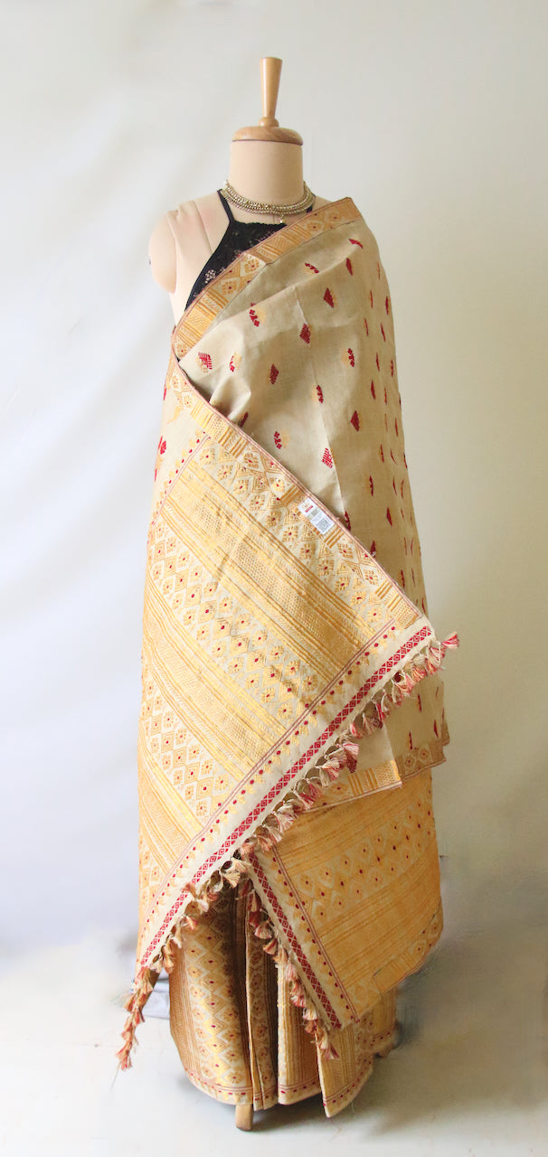 Red colour with Muga is the traditional and ubiquitous combination . Here we have used maroon instead of red .