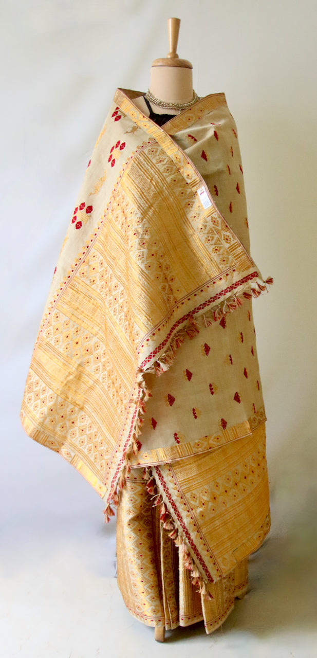 The Mekhla and Chador is a  traditional 2 piece dress from the North East State of Assam, India . The Mekhla is  appx 1.20 Mt in length and 37" width when stitched. The Warp will have pleats when worn. The top part or 'chadar ' is a shawl or half -sari which is used to cover the upper portion of the body and is worn on top of the mekhla or wrap. The usual size is 3 Meters long and about 37 inches in width.