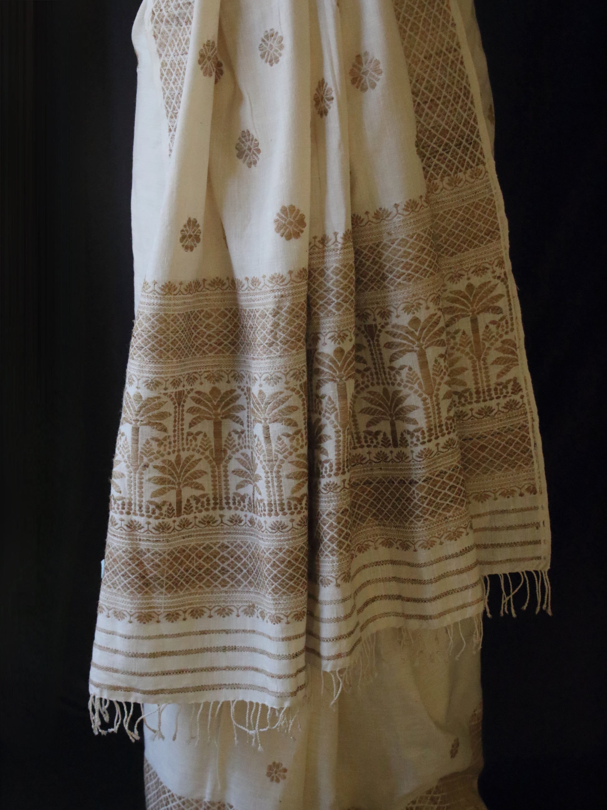 It has fine mill spun Eri Silk yarns in the warp and weft and the interwoven motifs are in Ghicha silk. No additional dyes are present . The yarn colours are natural off white and brown .
