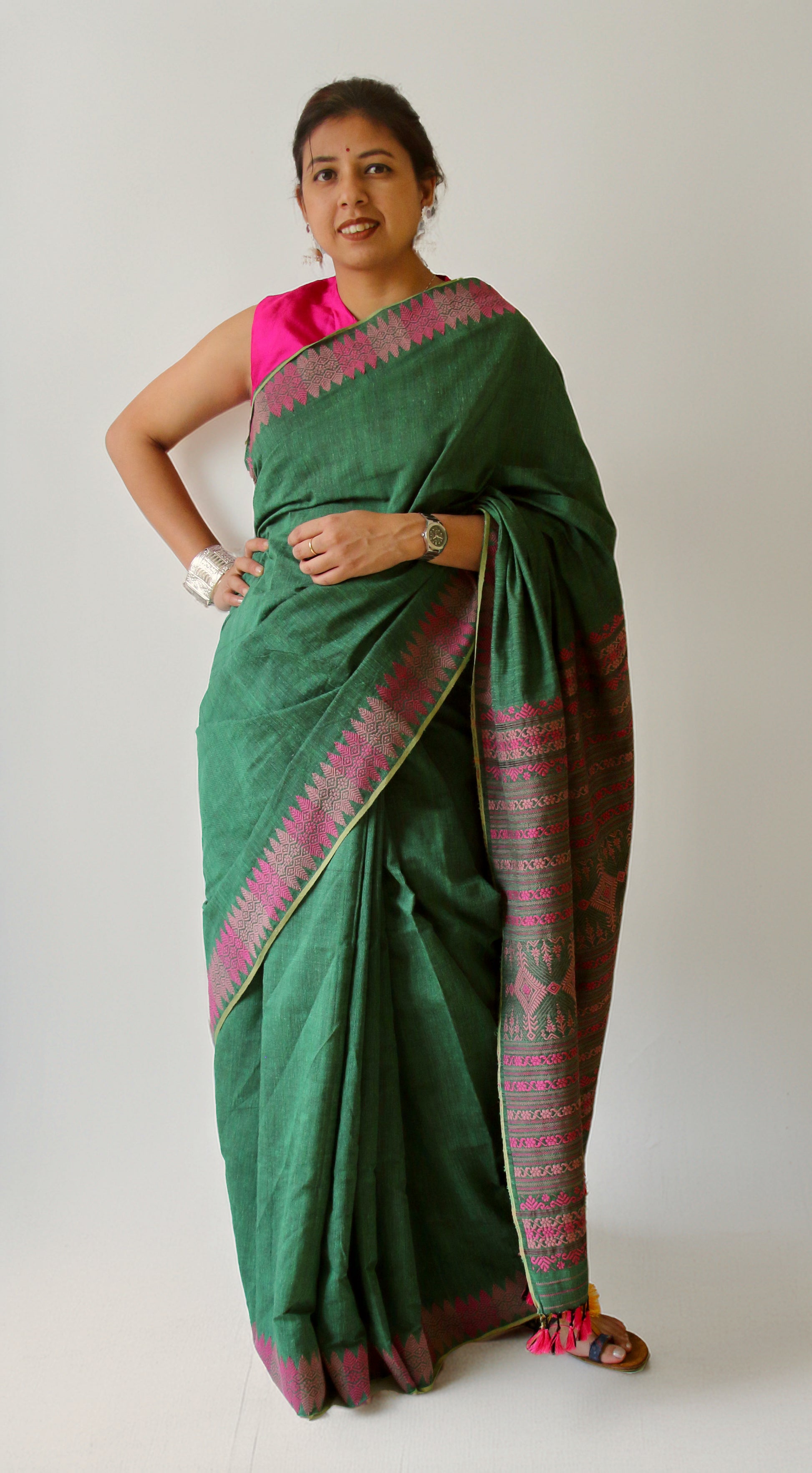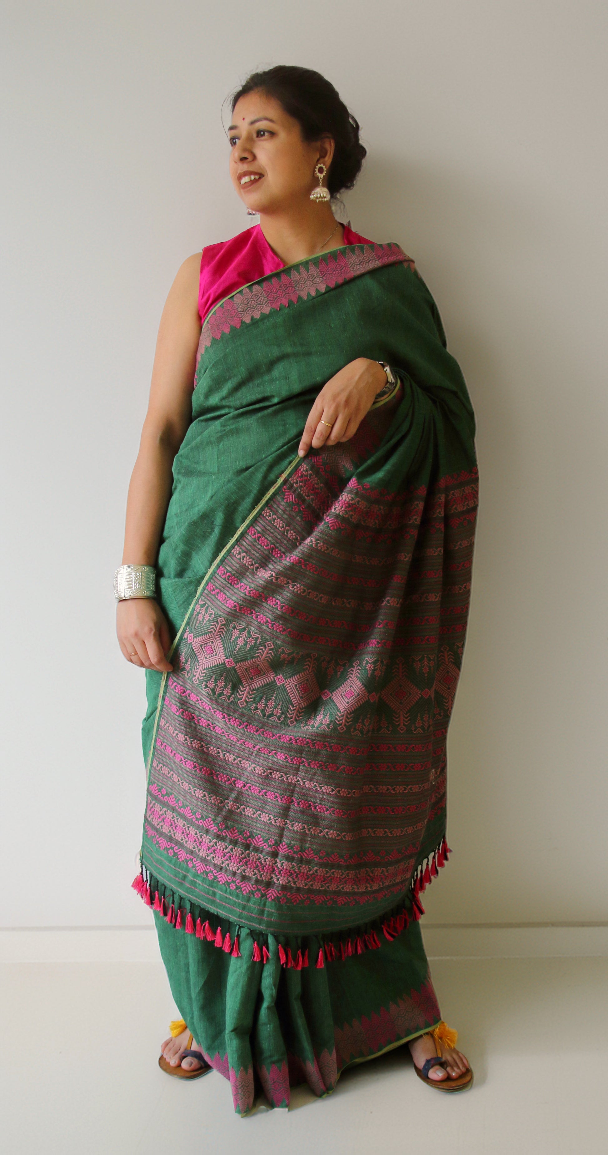 The saree has Modal yarns in the warp and Eri silk Yarns in the weft . The interwoven motif yarns are Eri Silk yarns.
