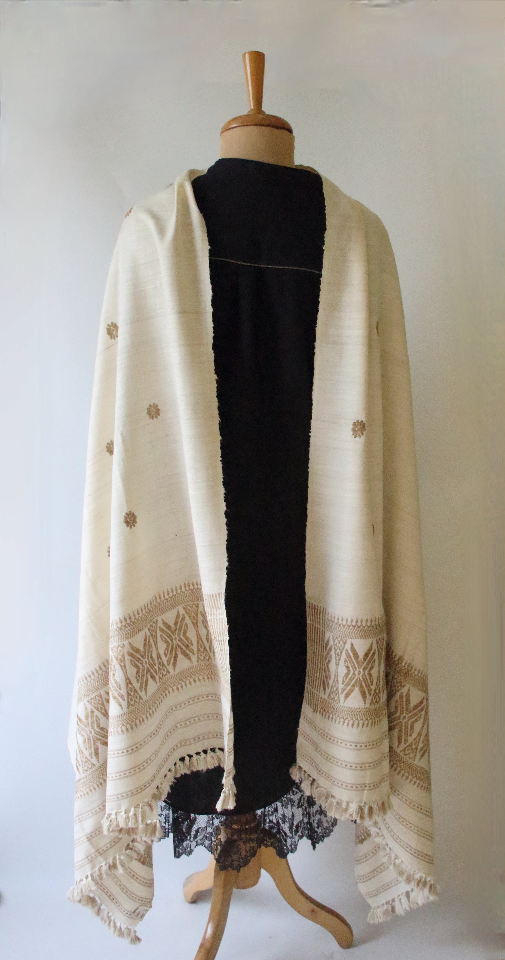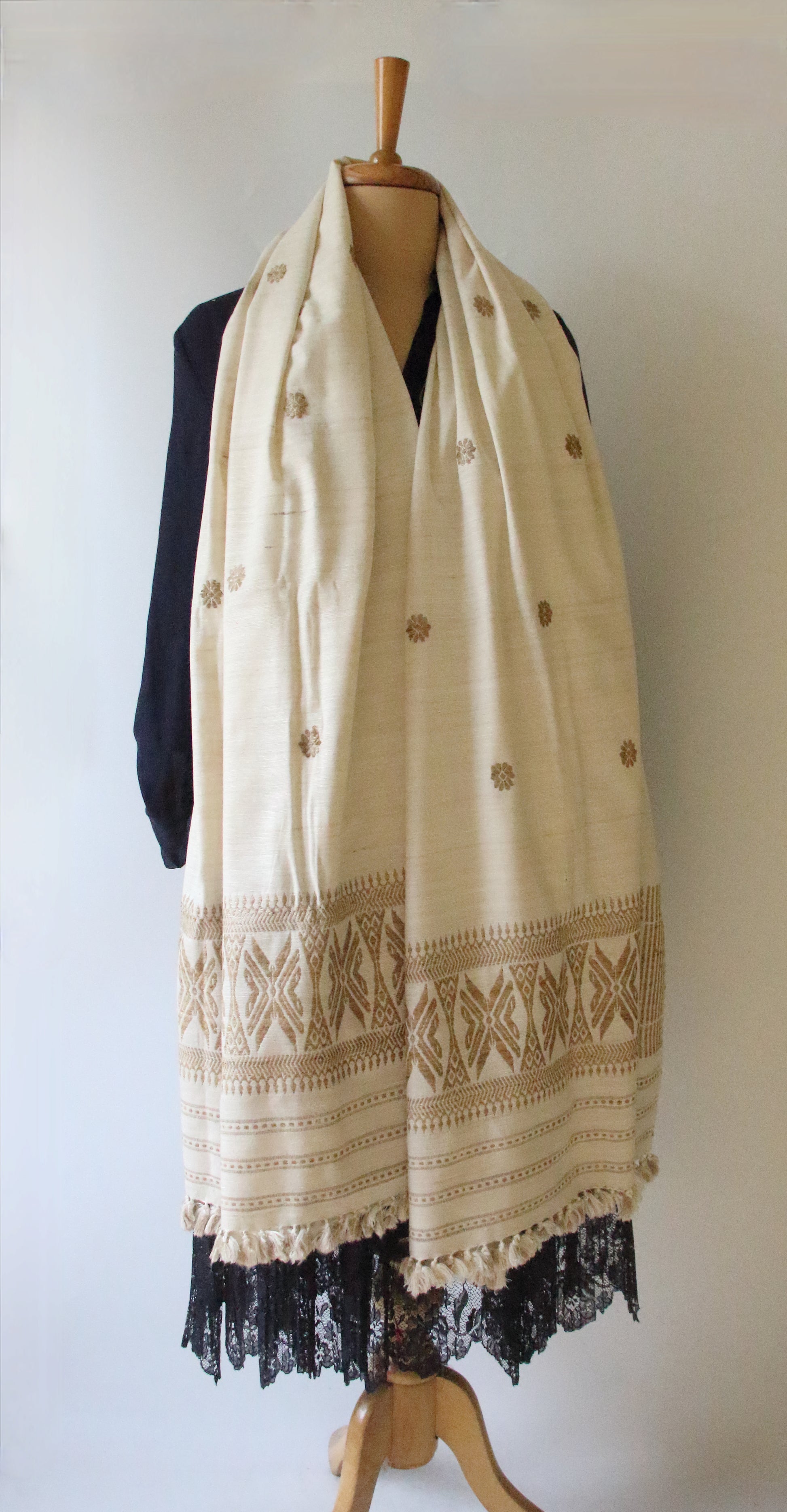 The shawl is made from Eri Silk Yarns in the traditional looms in Assam by women weavers . The off white colour of the shawl is it's natural colours and the beige motifs are the natural colour of Muga ghicha silk.
