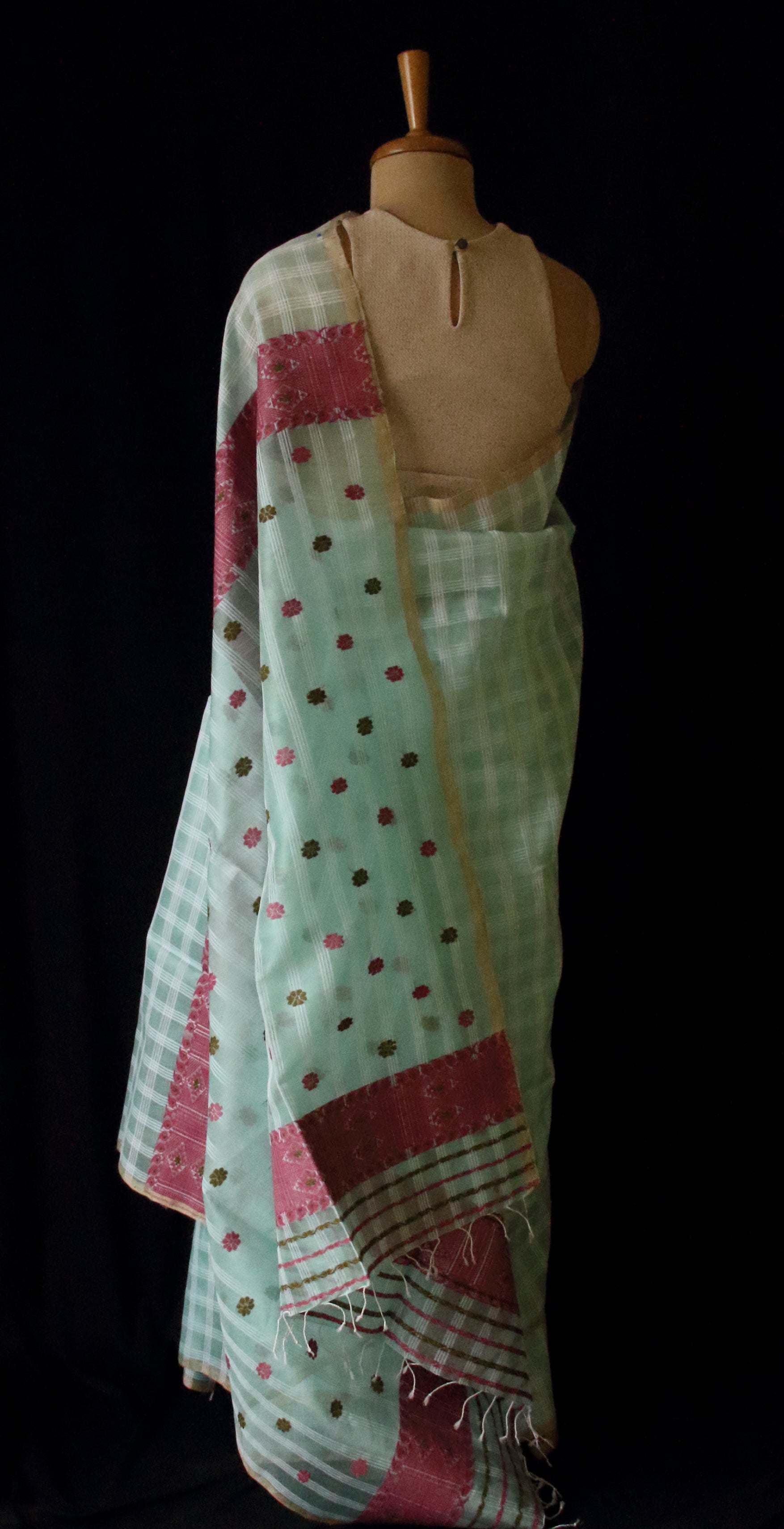 The sari has undyed raw mulberry silk in the warp and dyed raw silk in the weft .The motifs are in Eri Silk and Ghicha Silk . The chequered effect is achieved by inserting extra cotton yarns at regular interval. These kinds of material is colloquially known as ' Garidiya ' in the region.