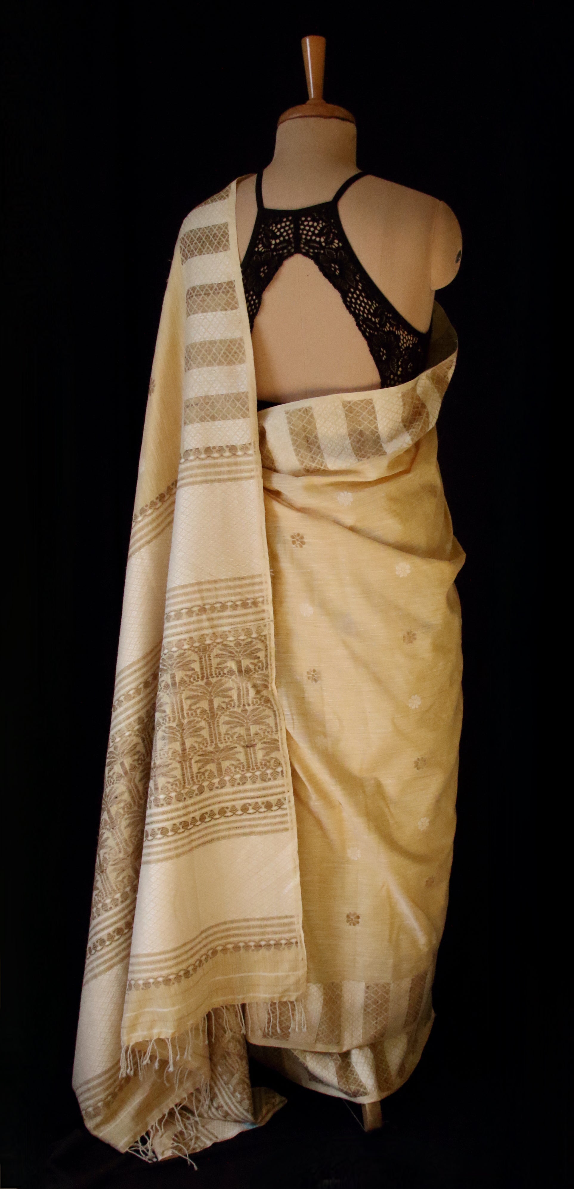 The saree has mulberry silk in the warp and eri silk in the weft and all the interwoven motifs in Eri and ghicha silk. It is a hundred percent silk saree.