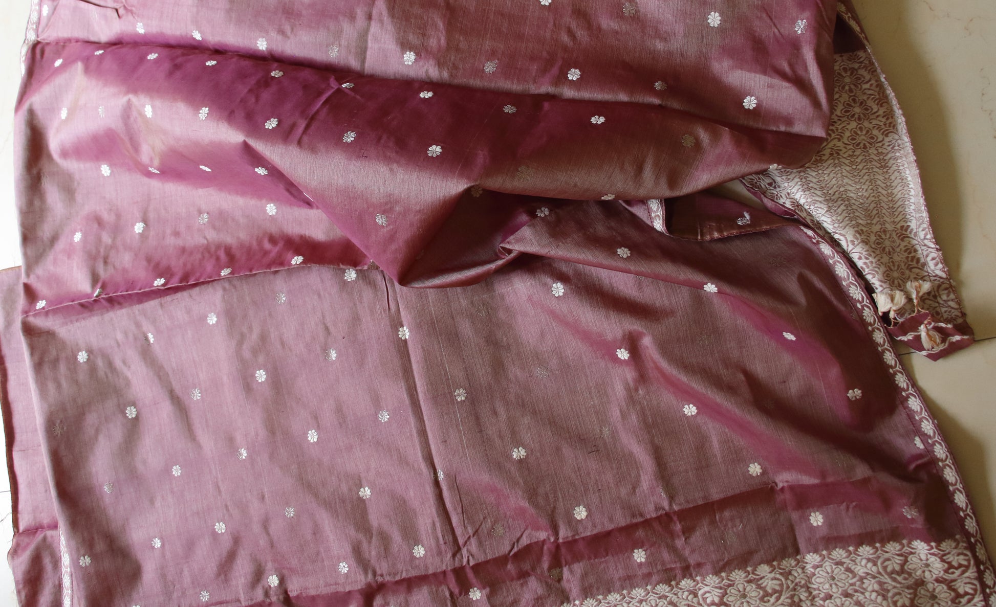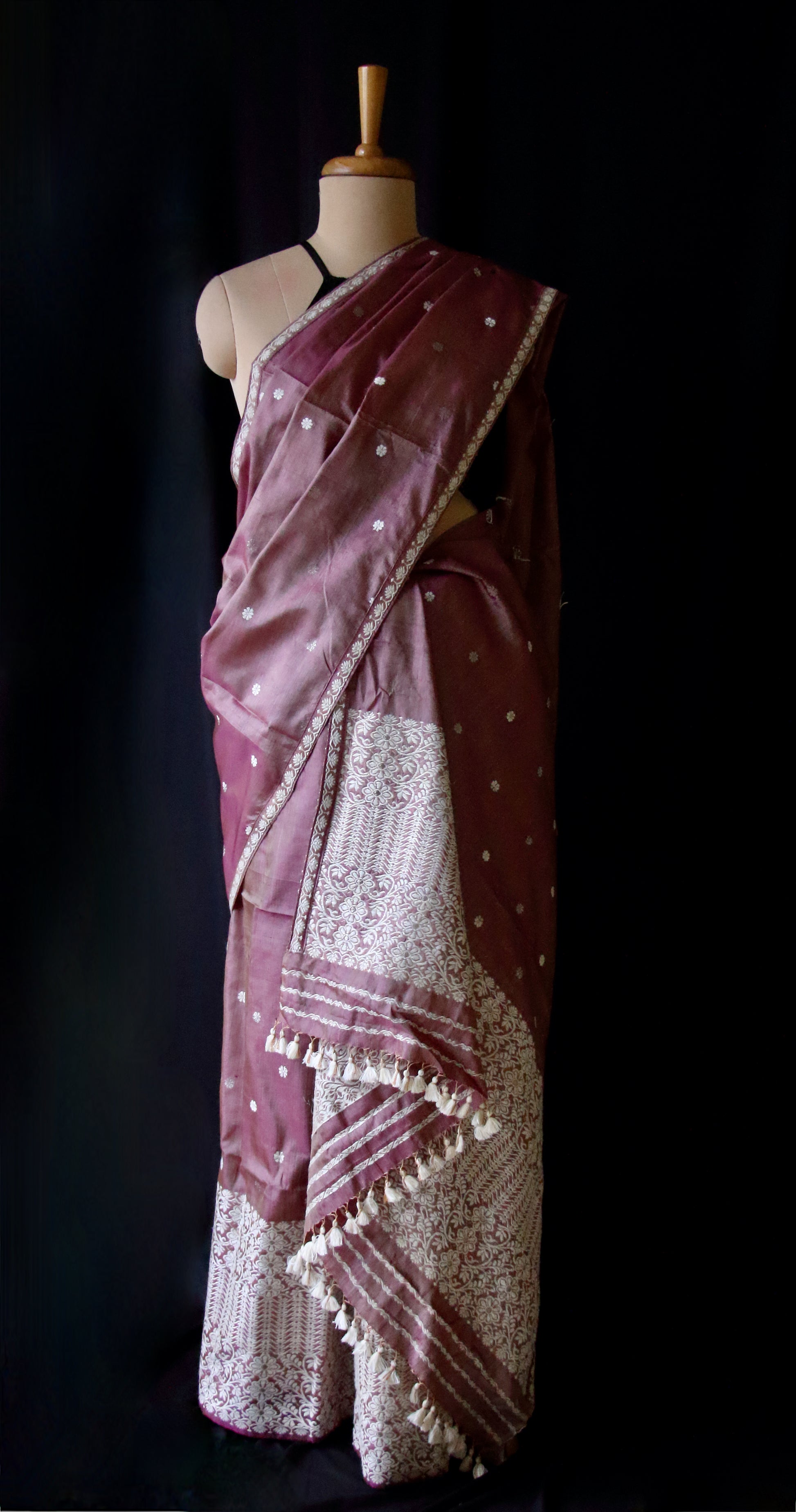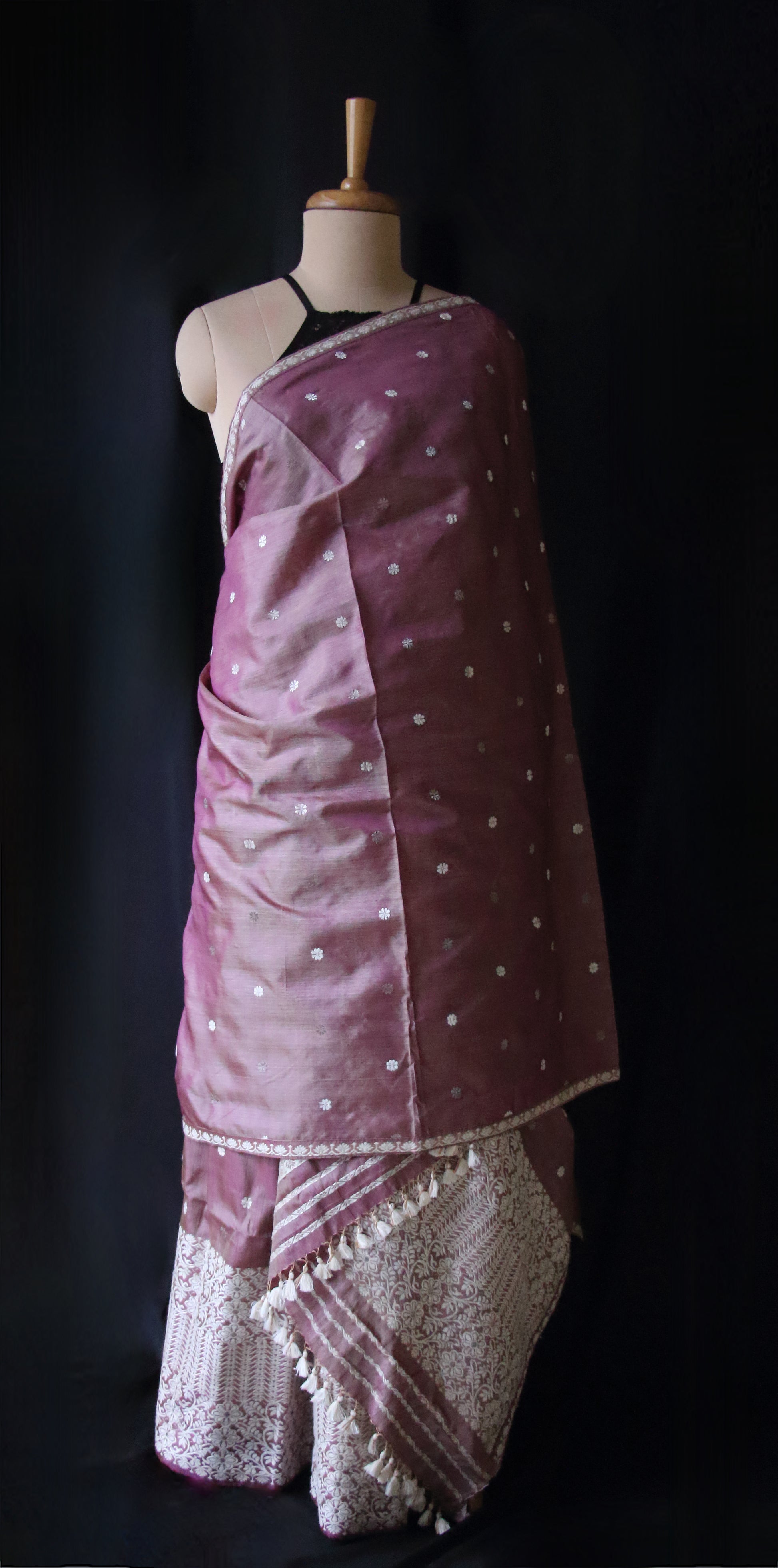 The Mekhla Chadar has Mulberry Silk in the warp and Tassar Silk in the weft and all the interwoven motifs are in Eri Silk and silver zari.