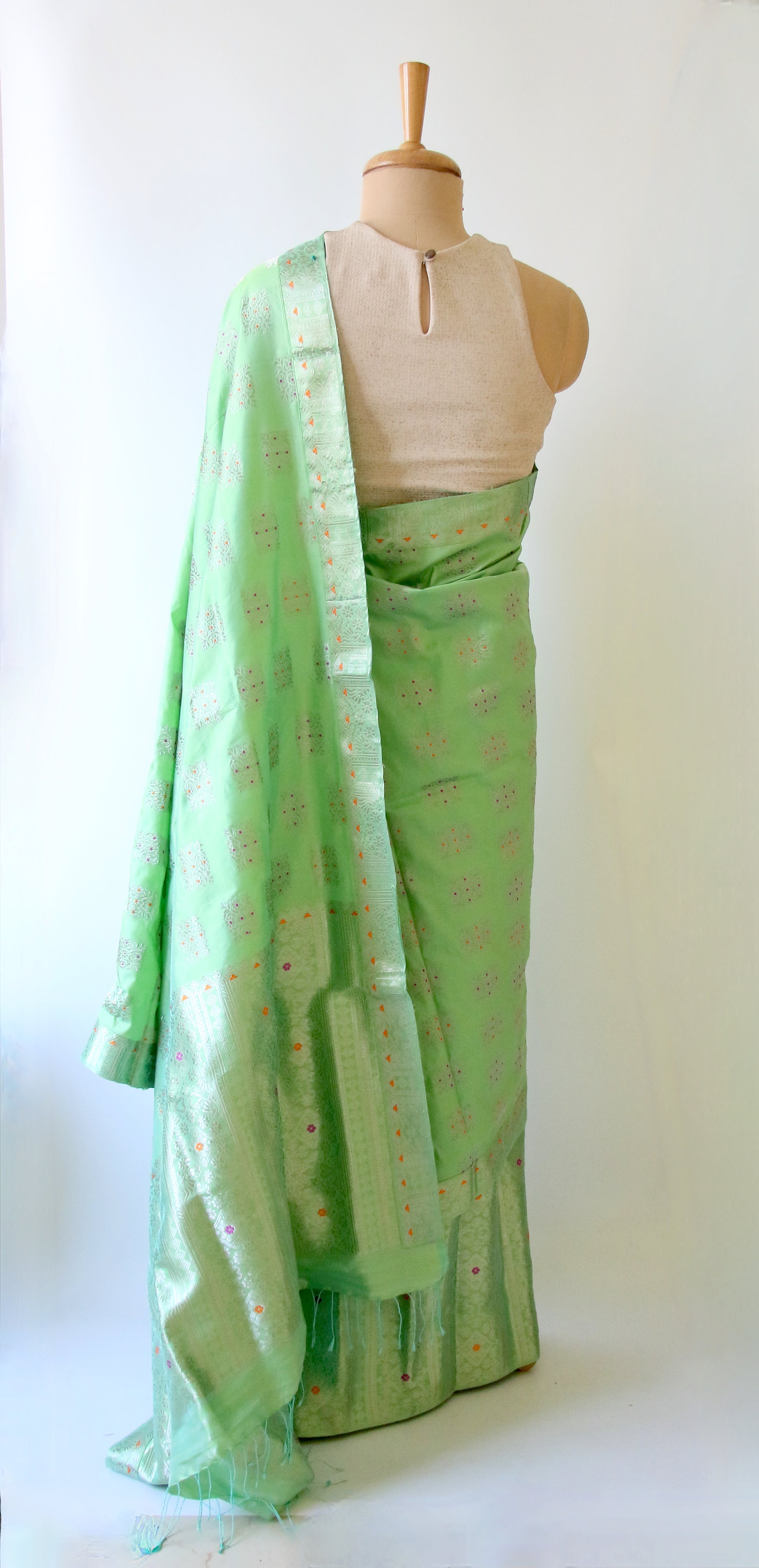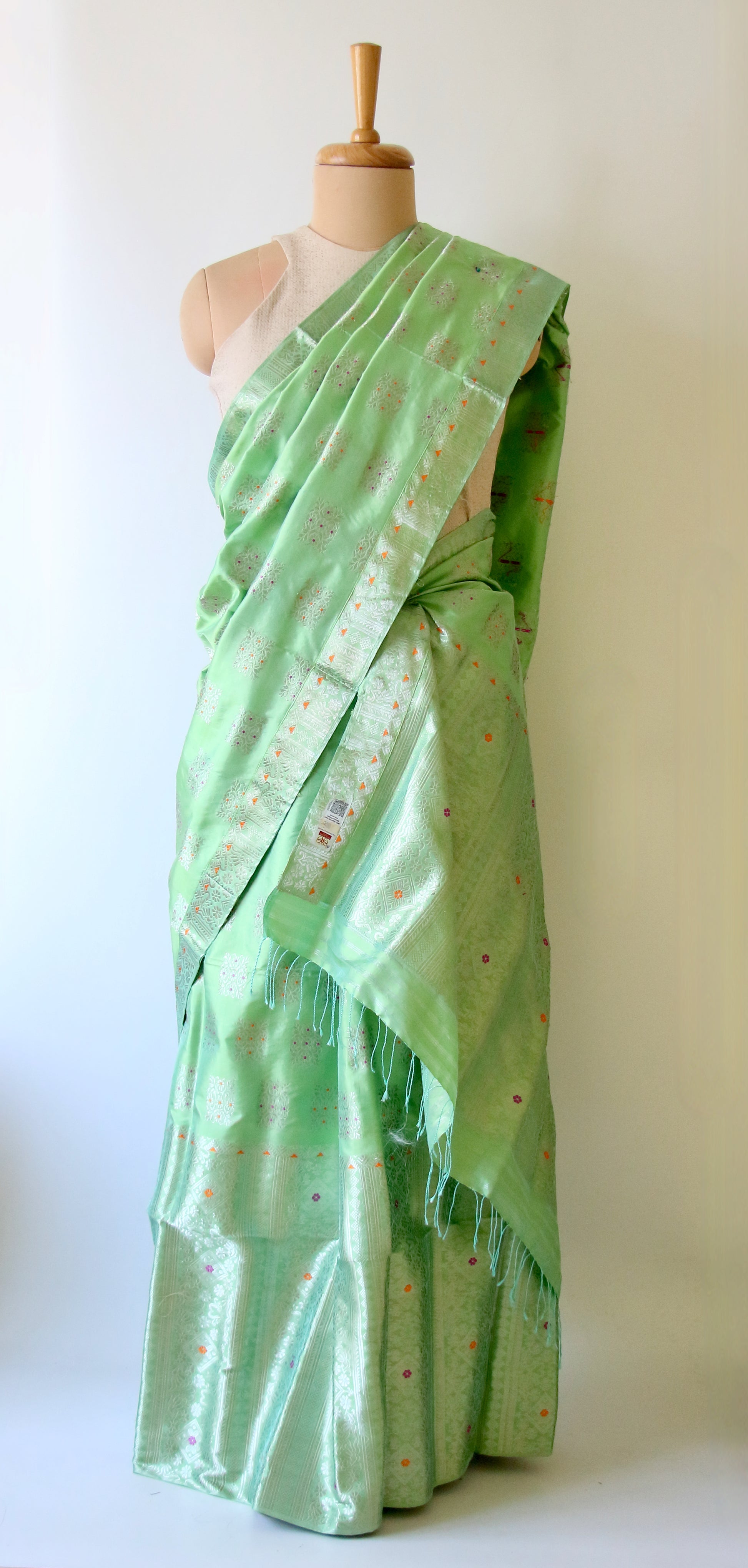 Pista Green all over motifs silk Mekhela Chador set from our looms in Assam , India.