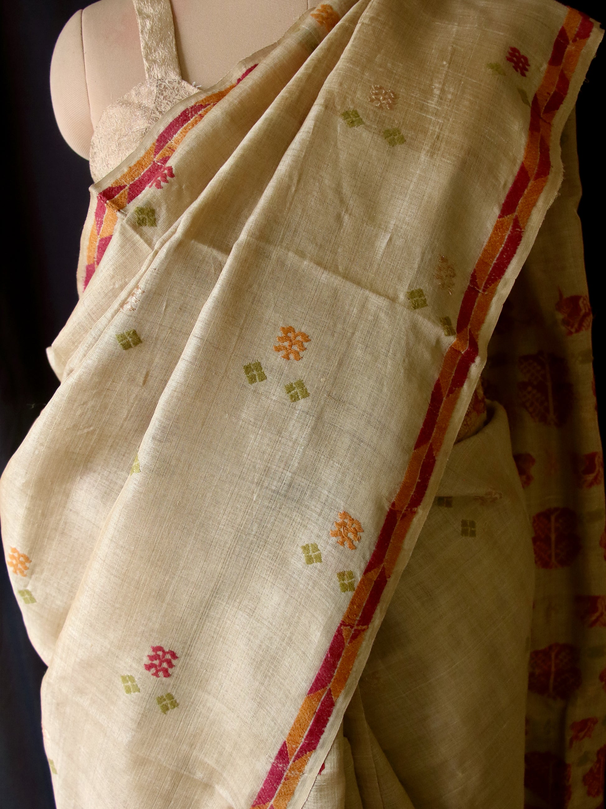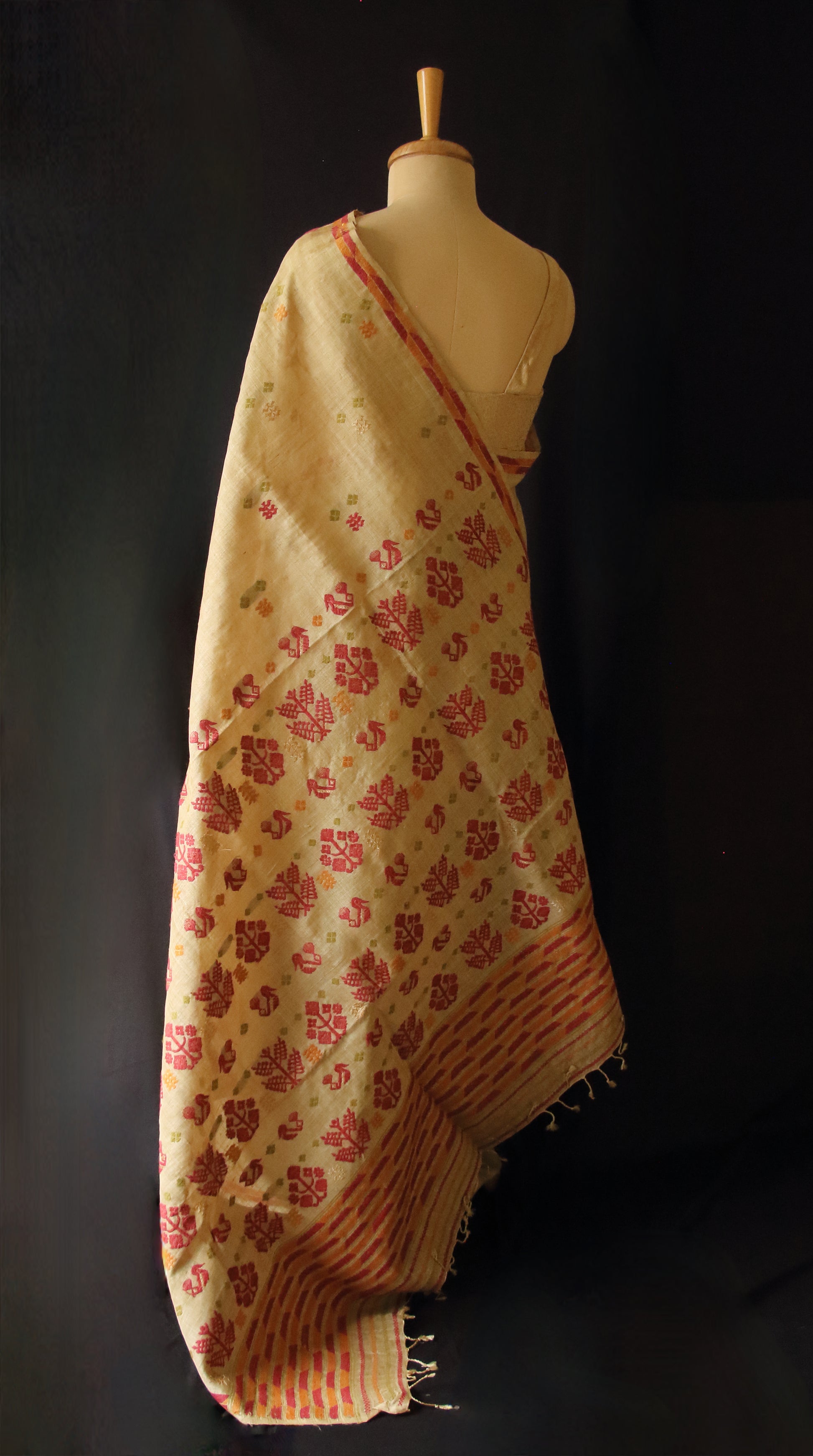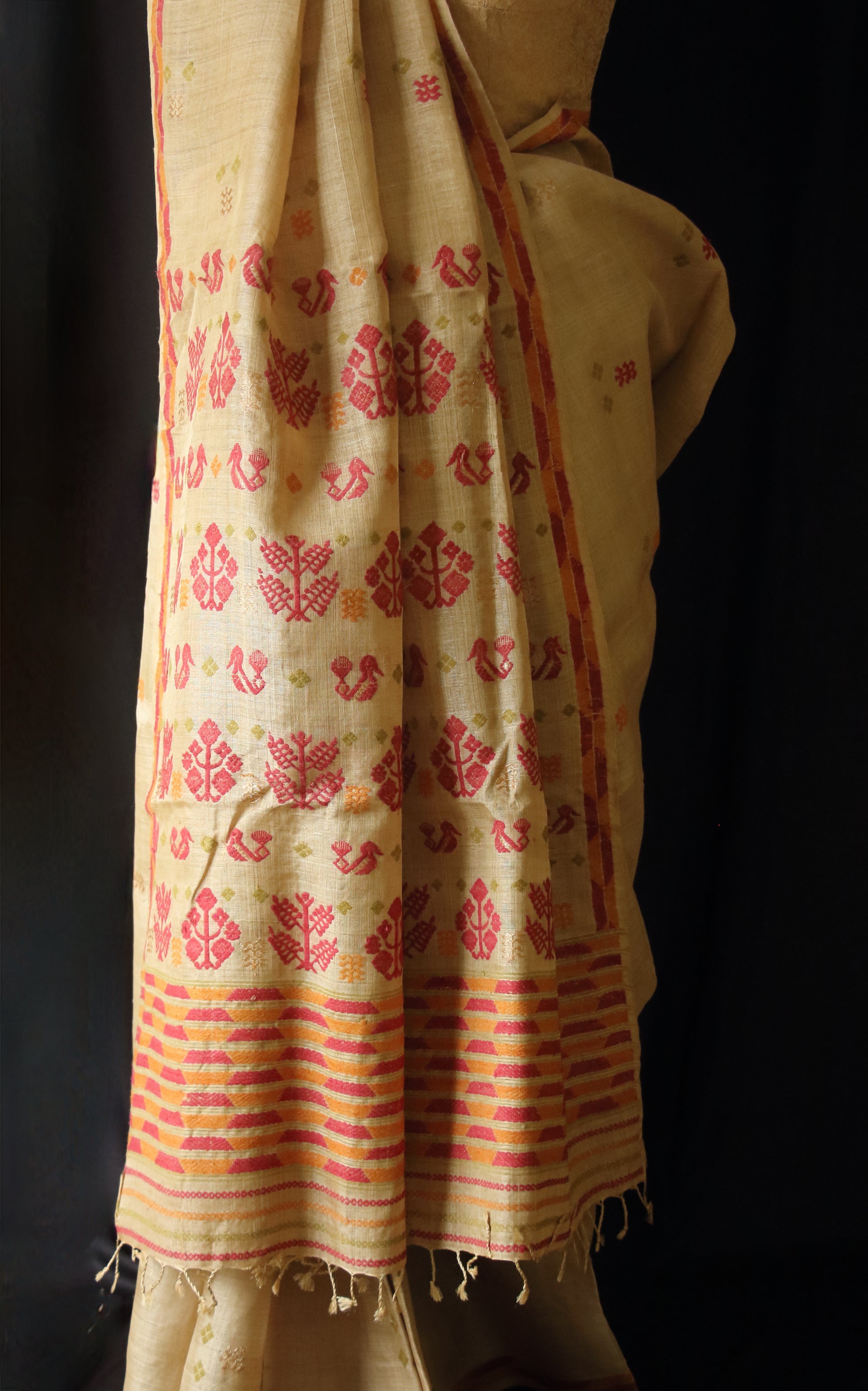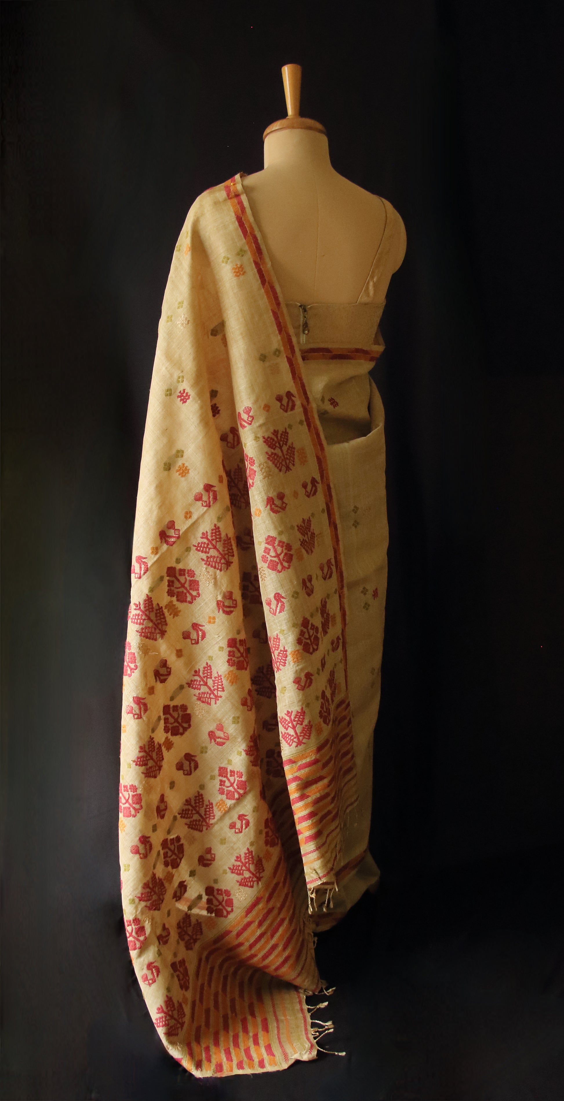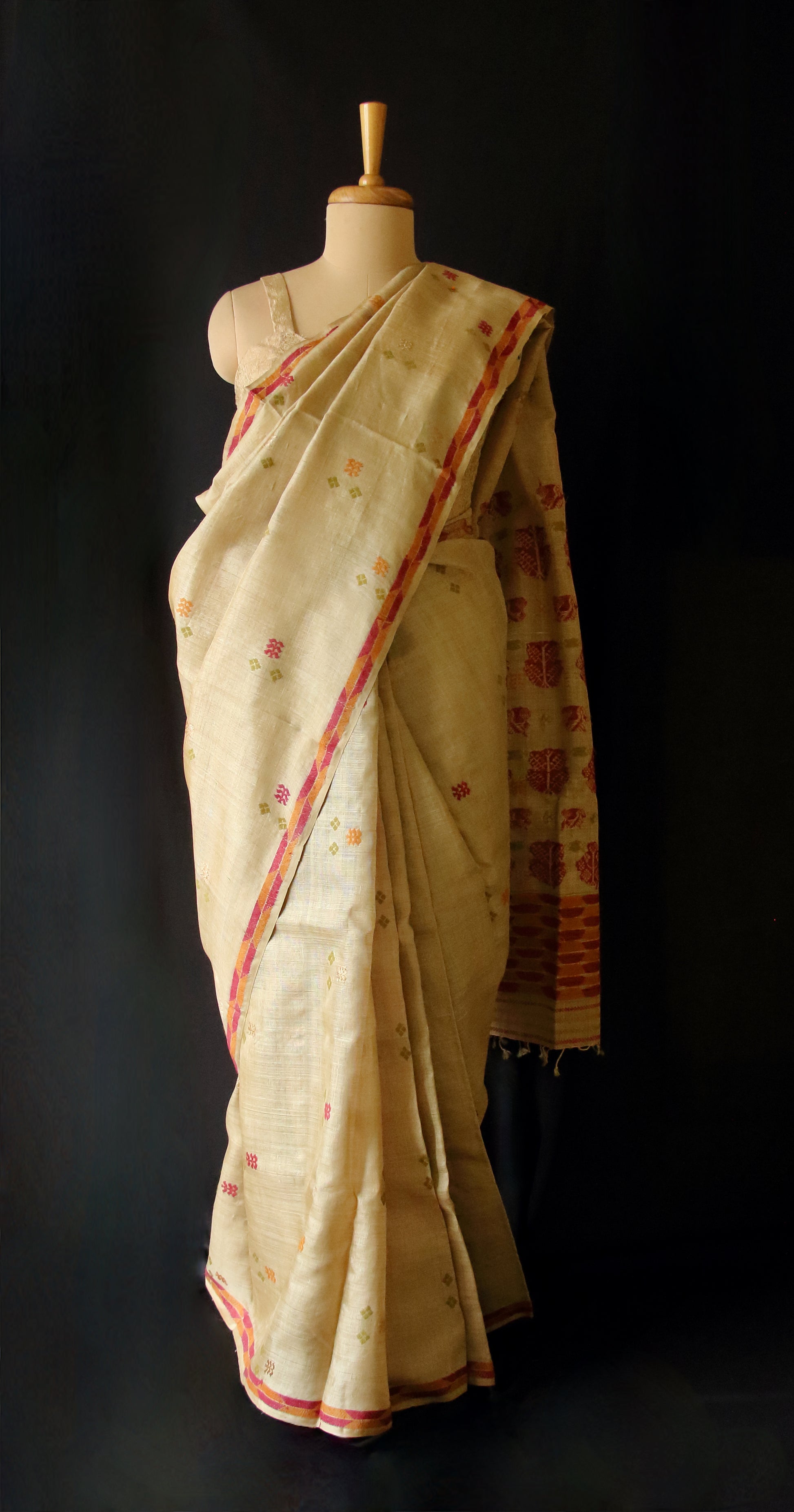 Muga Silk Saree with natural dyed Eri Silk motifs from Assam