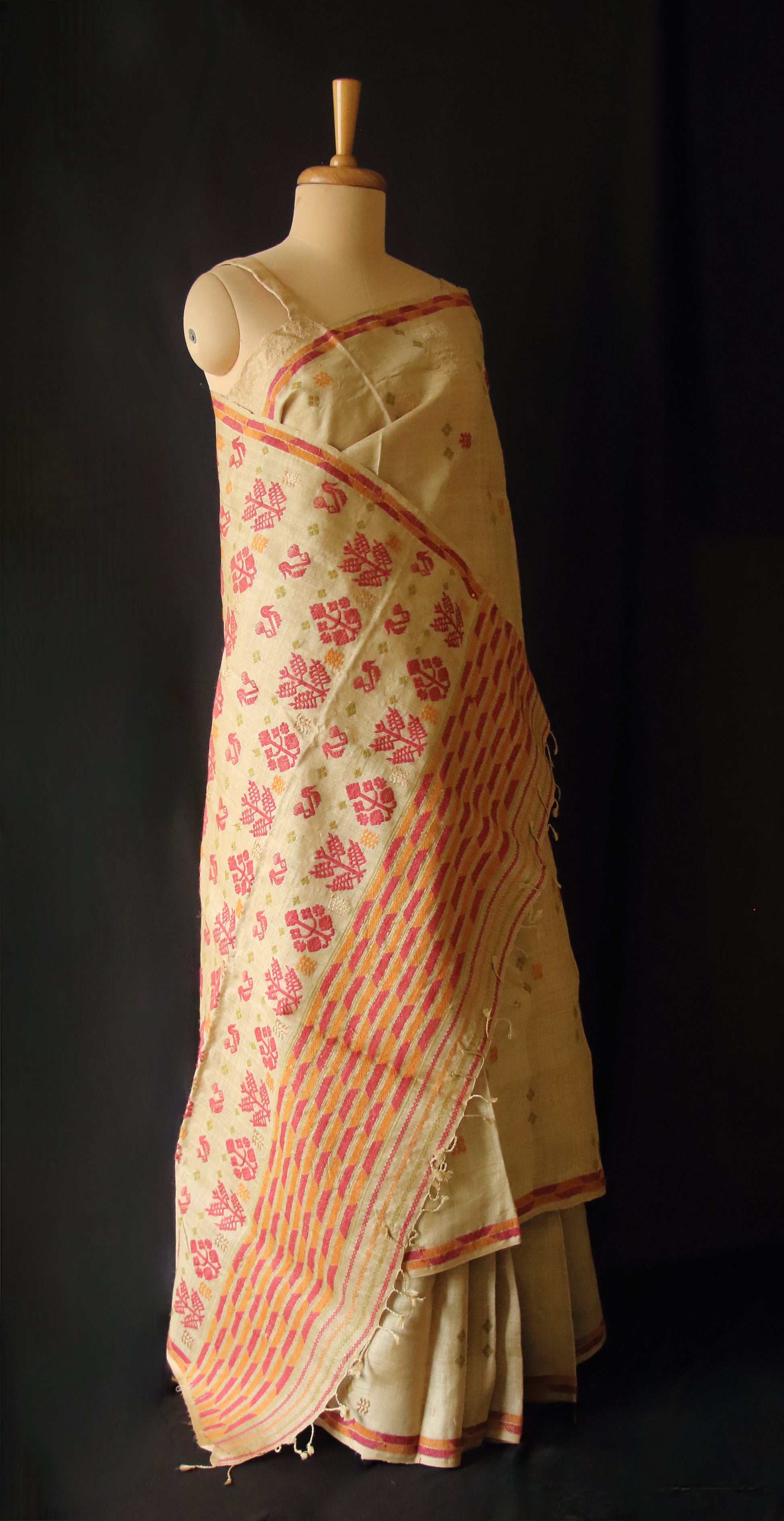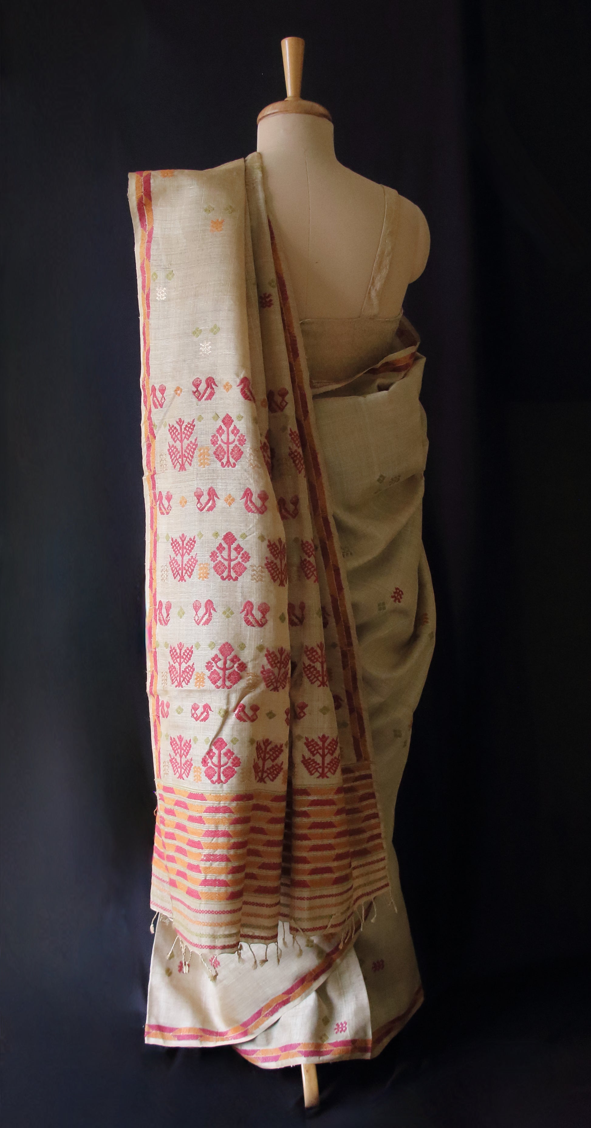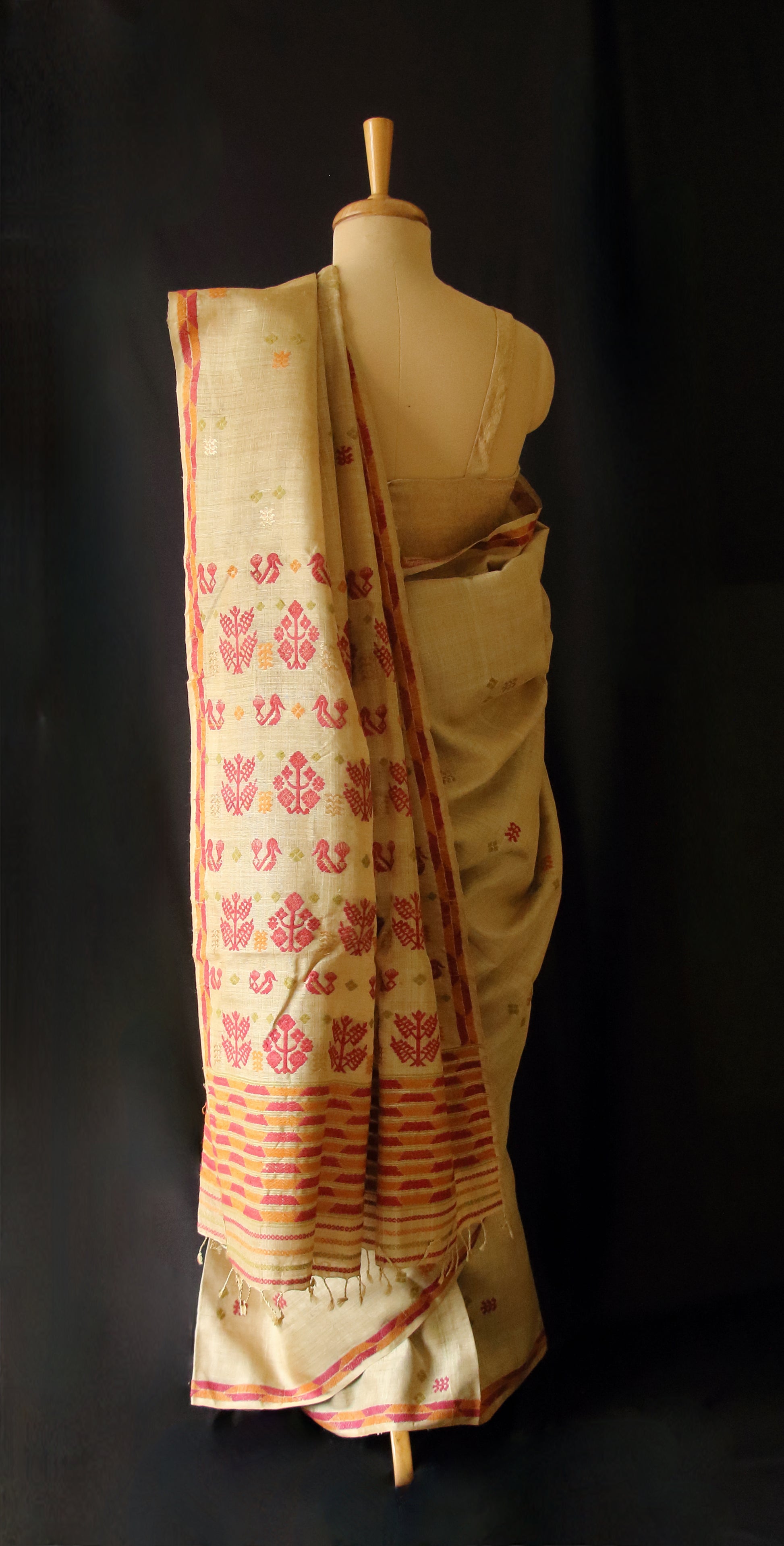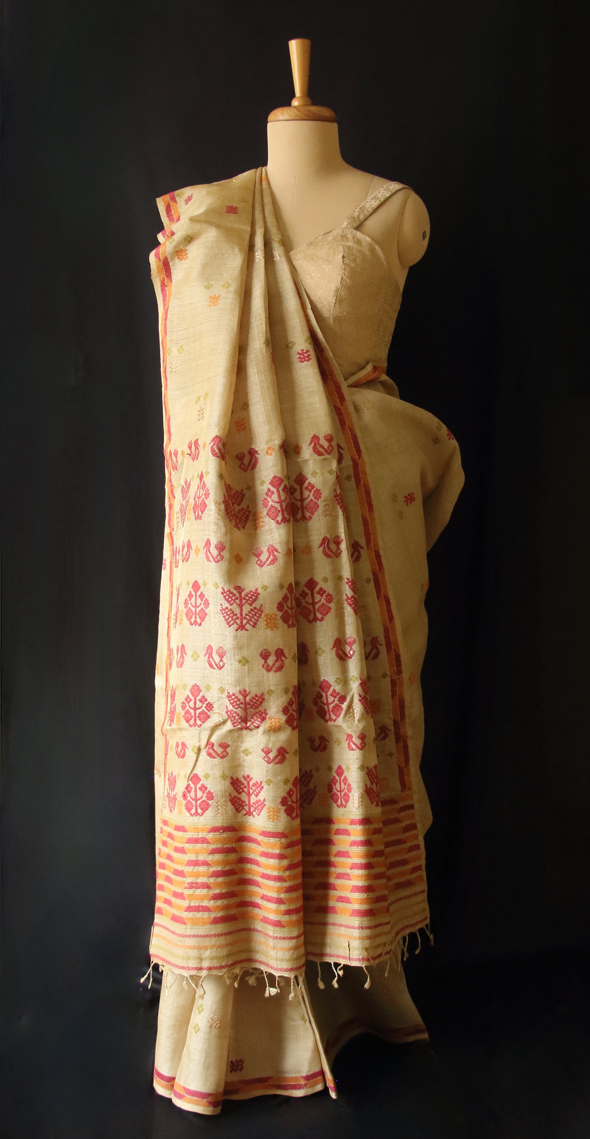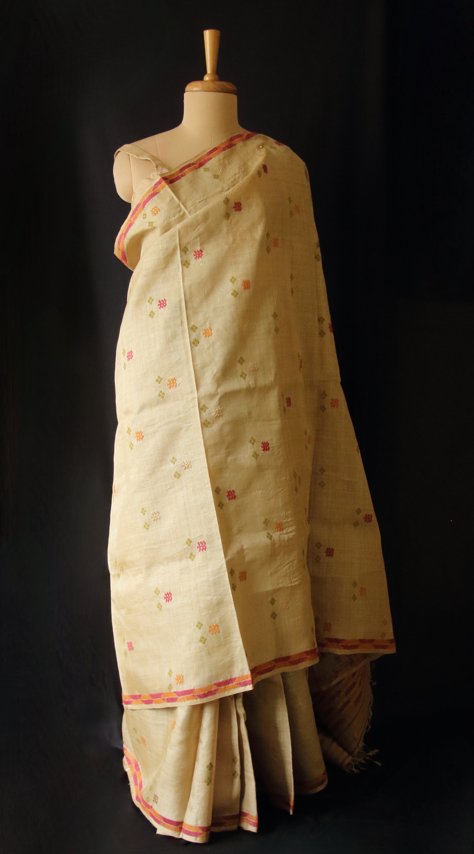 Muga Silk Saree with natural dyed Eri Silk motifs from Assam
