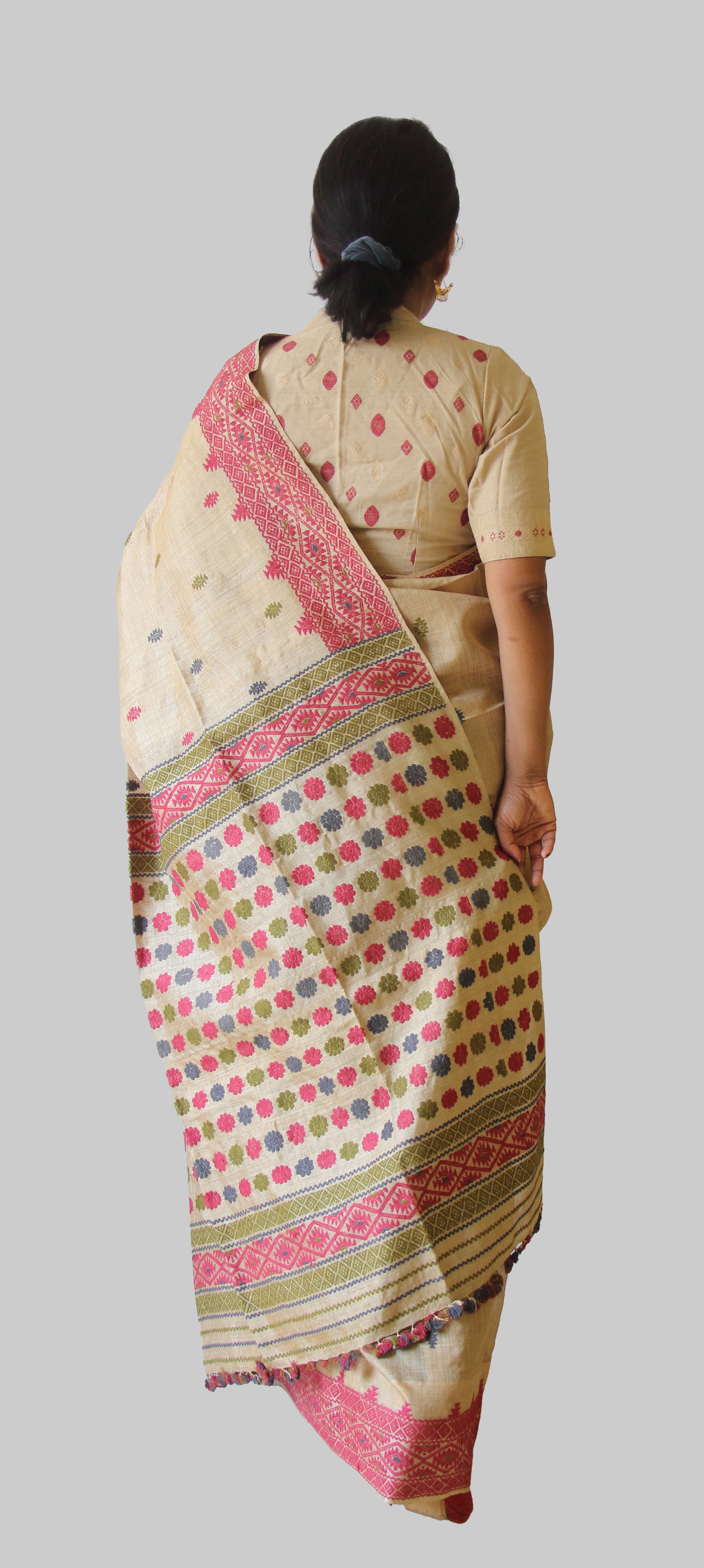 The interwoven motif yarns are in natural dyed Eri Silk yarns  . The saree is hundred percent silk .
