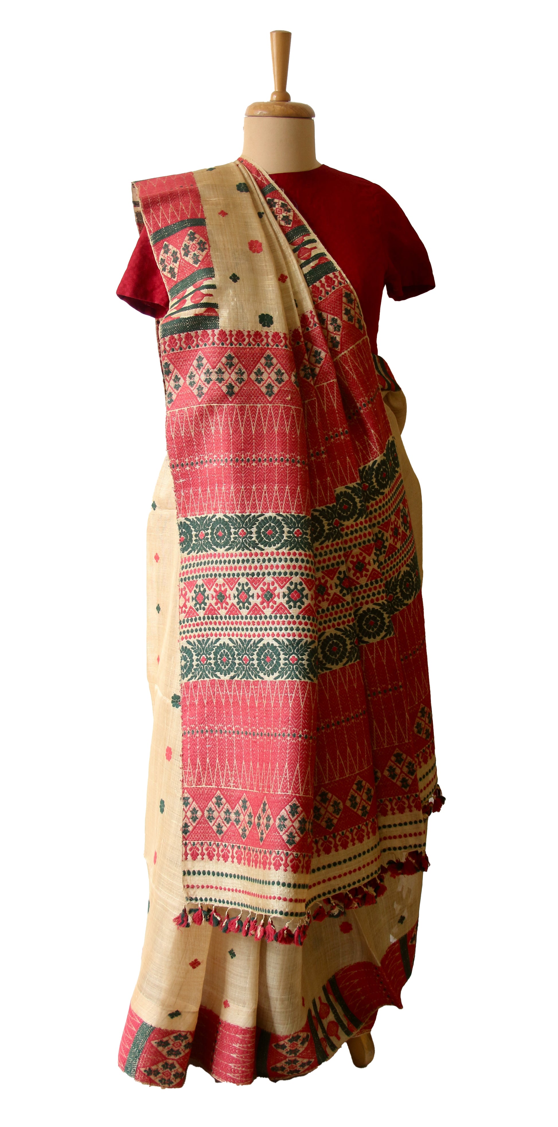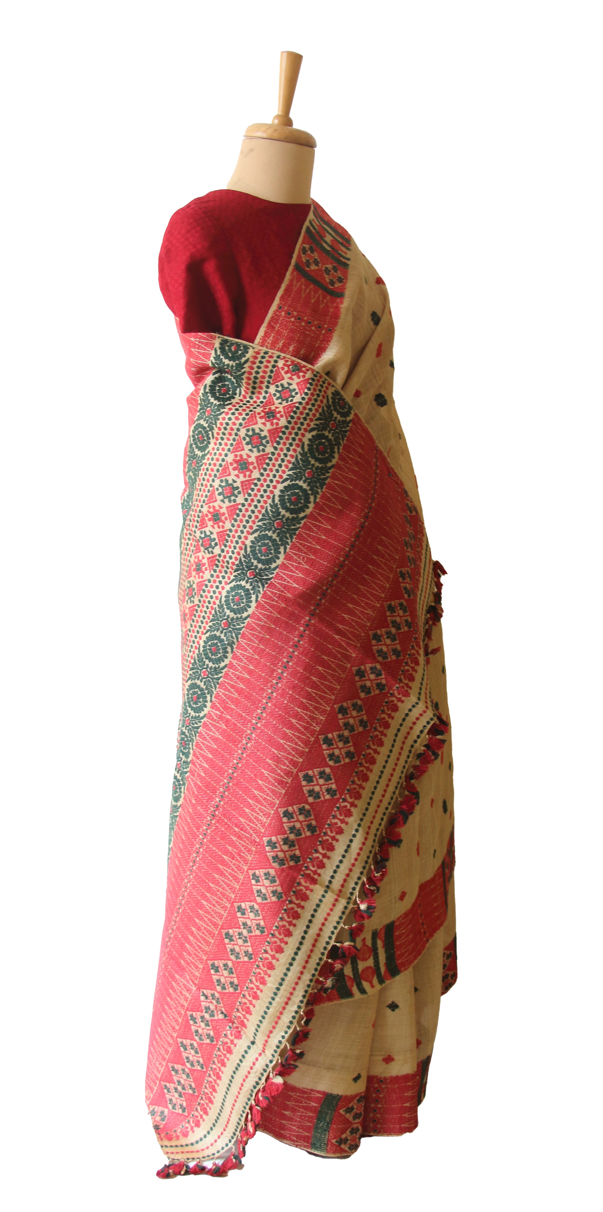 The interwoven motif yarns are in natural dyed Eri Silk yarns  . The saree is hundred percent silk .