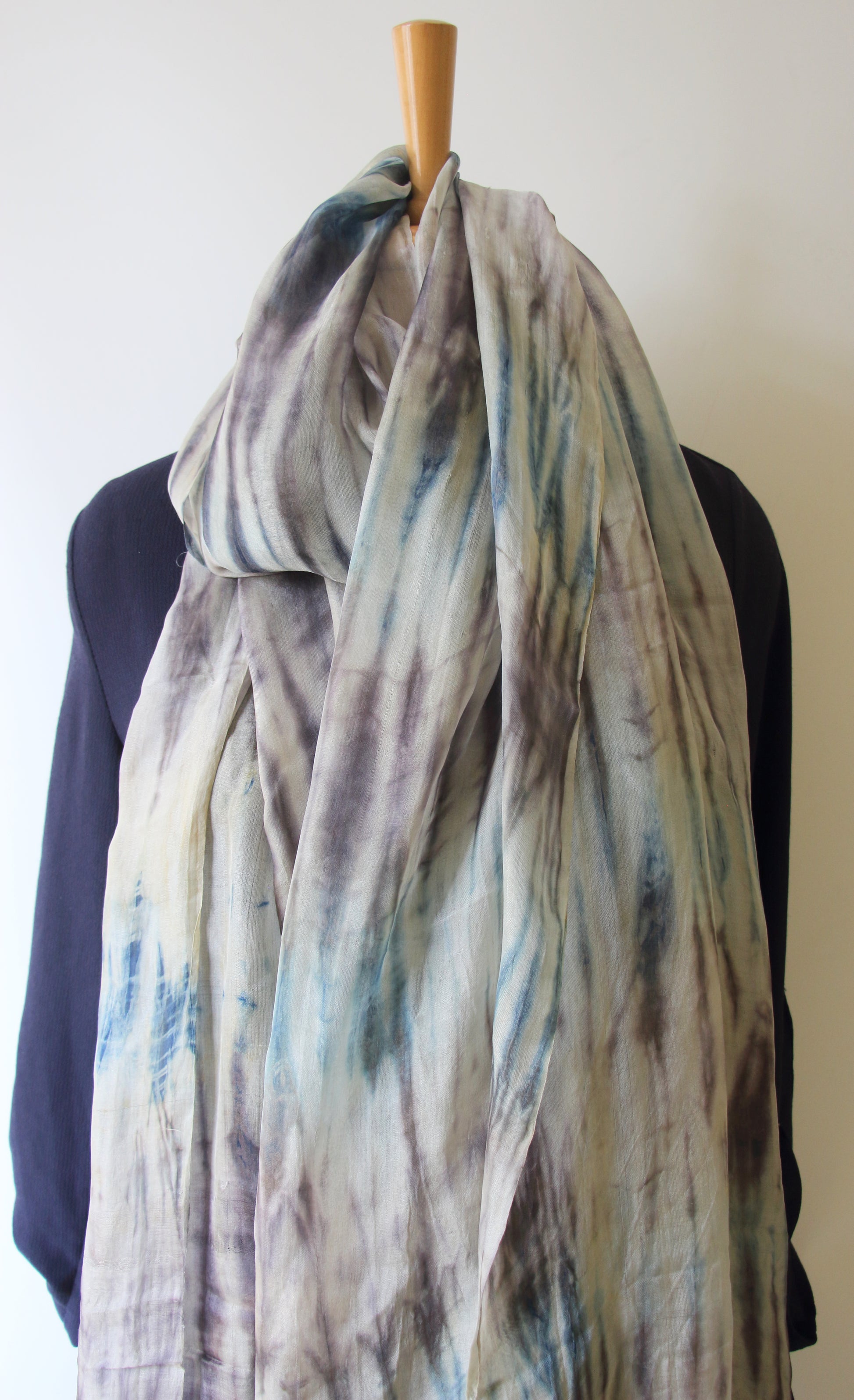 The base material is hundred percent Raw Mulberry Silk . We have used tie & dye technique to dye this piece of textile using Assam Indigo extracts and other locally available ingredients .
