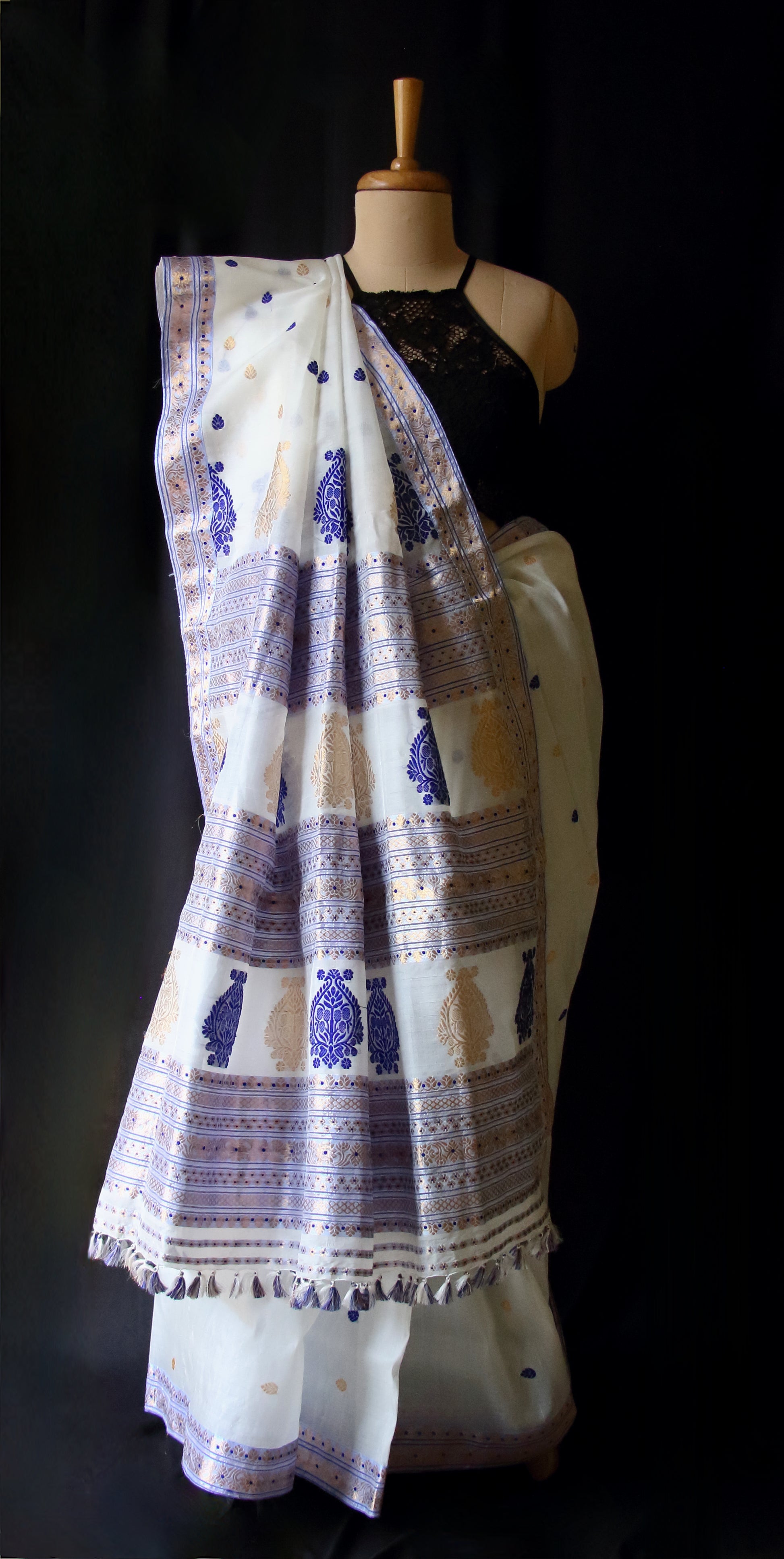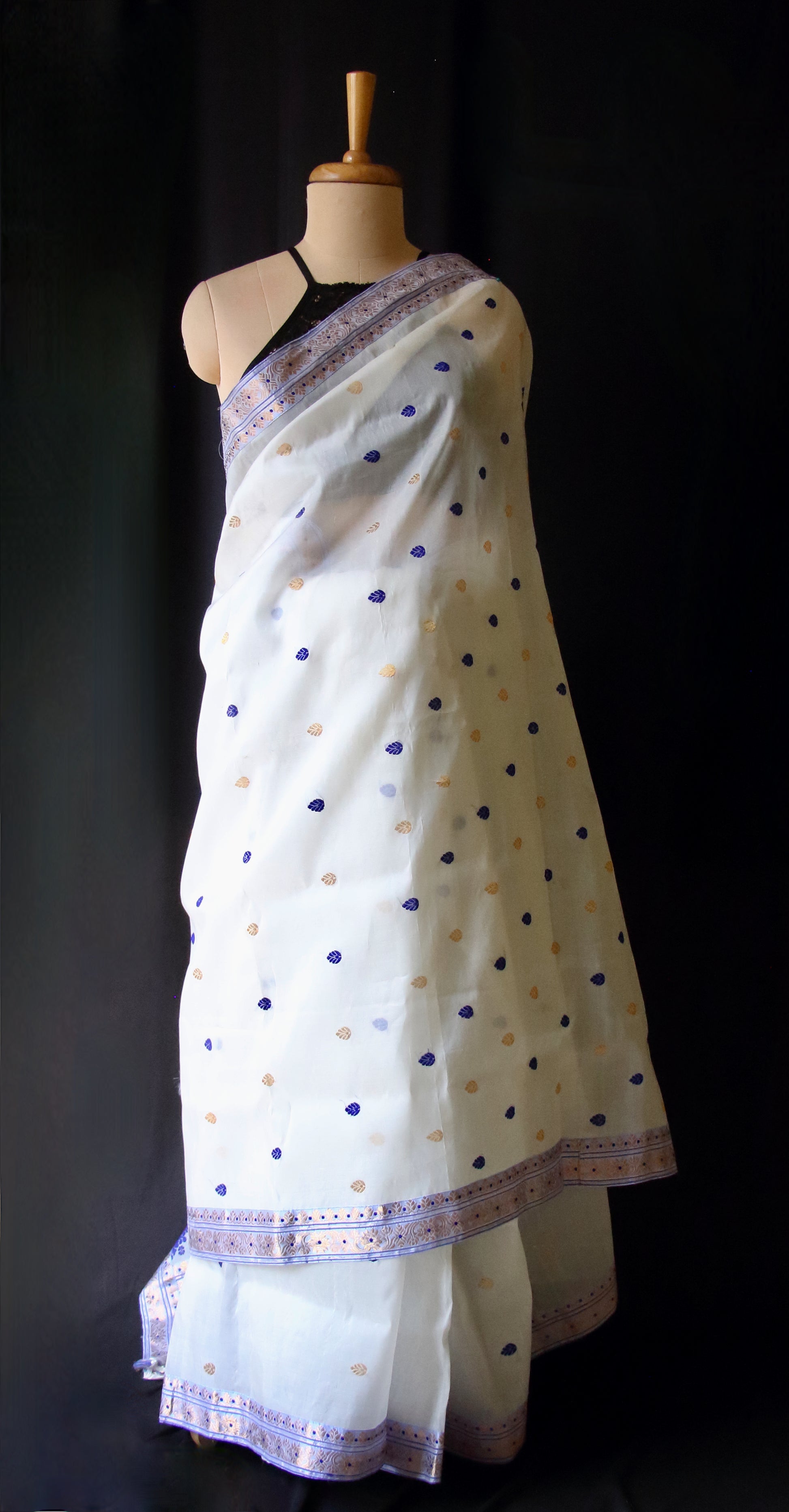 The Saree has Mulberry Silk in the warp Raw mulberry silk in the  weft and all the extra weft motifs are in cotton and zari.