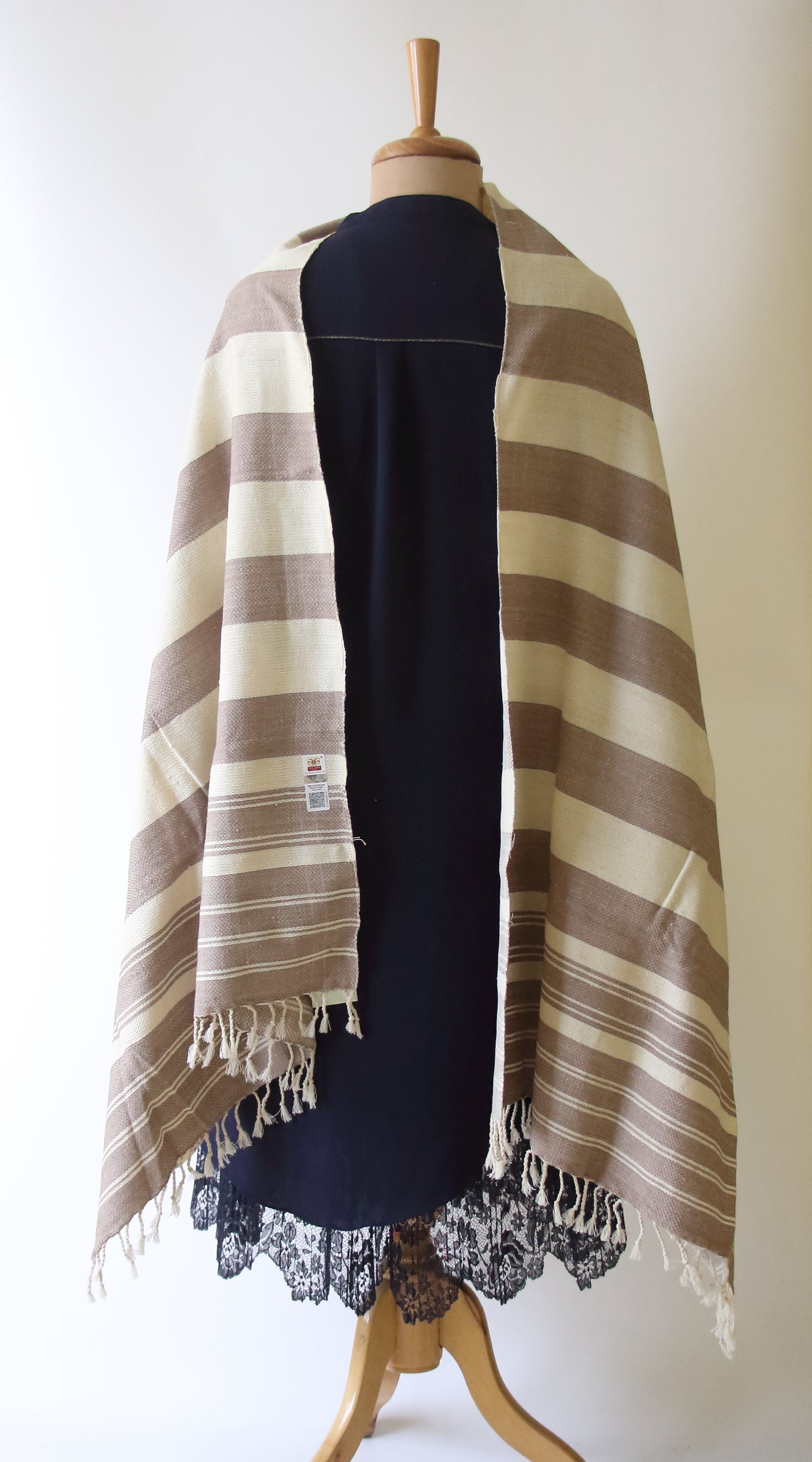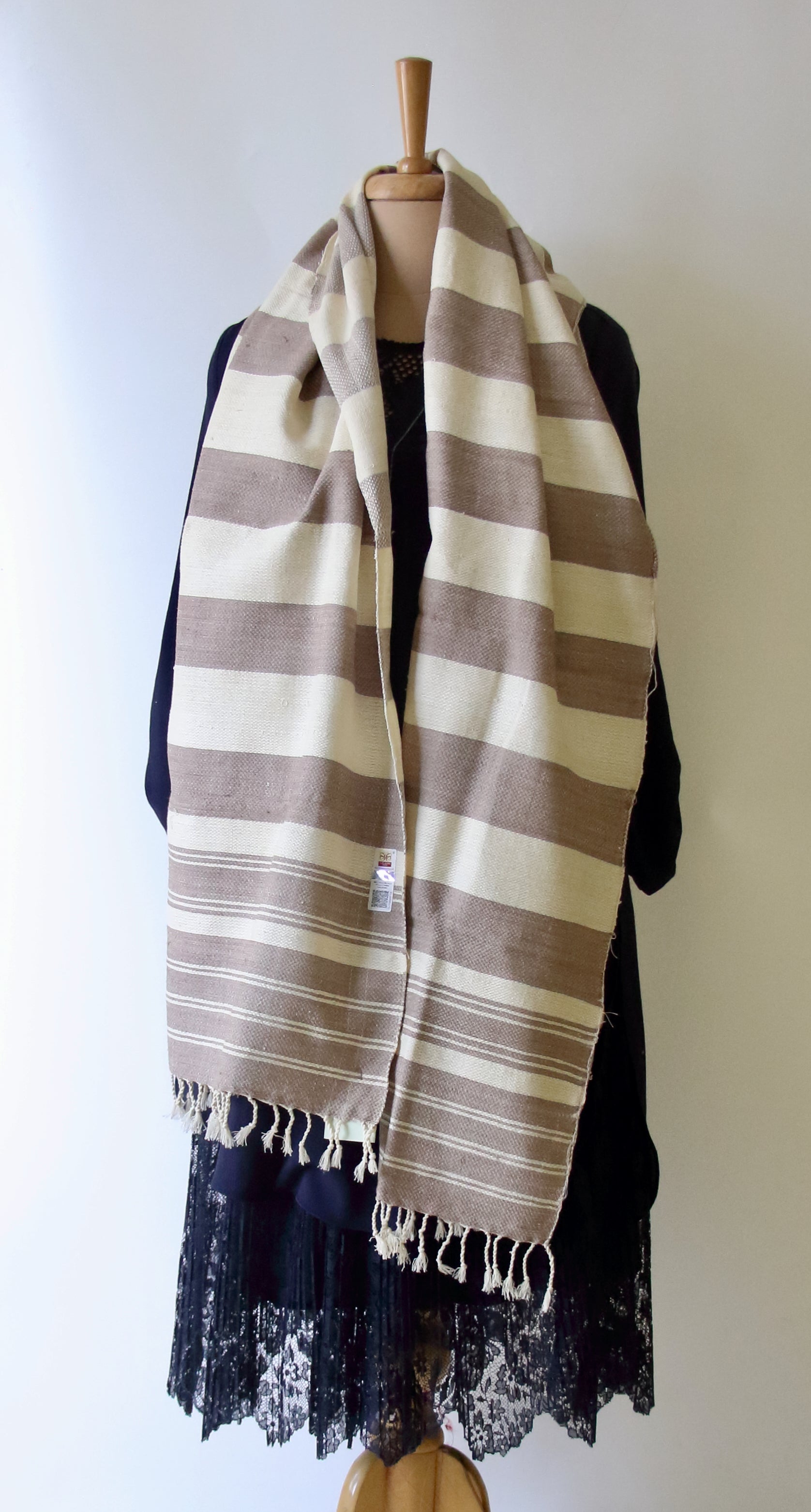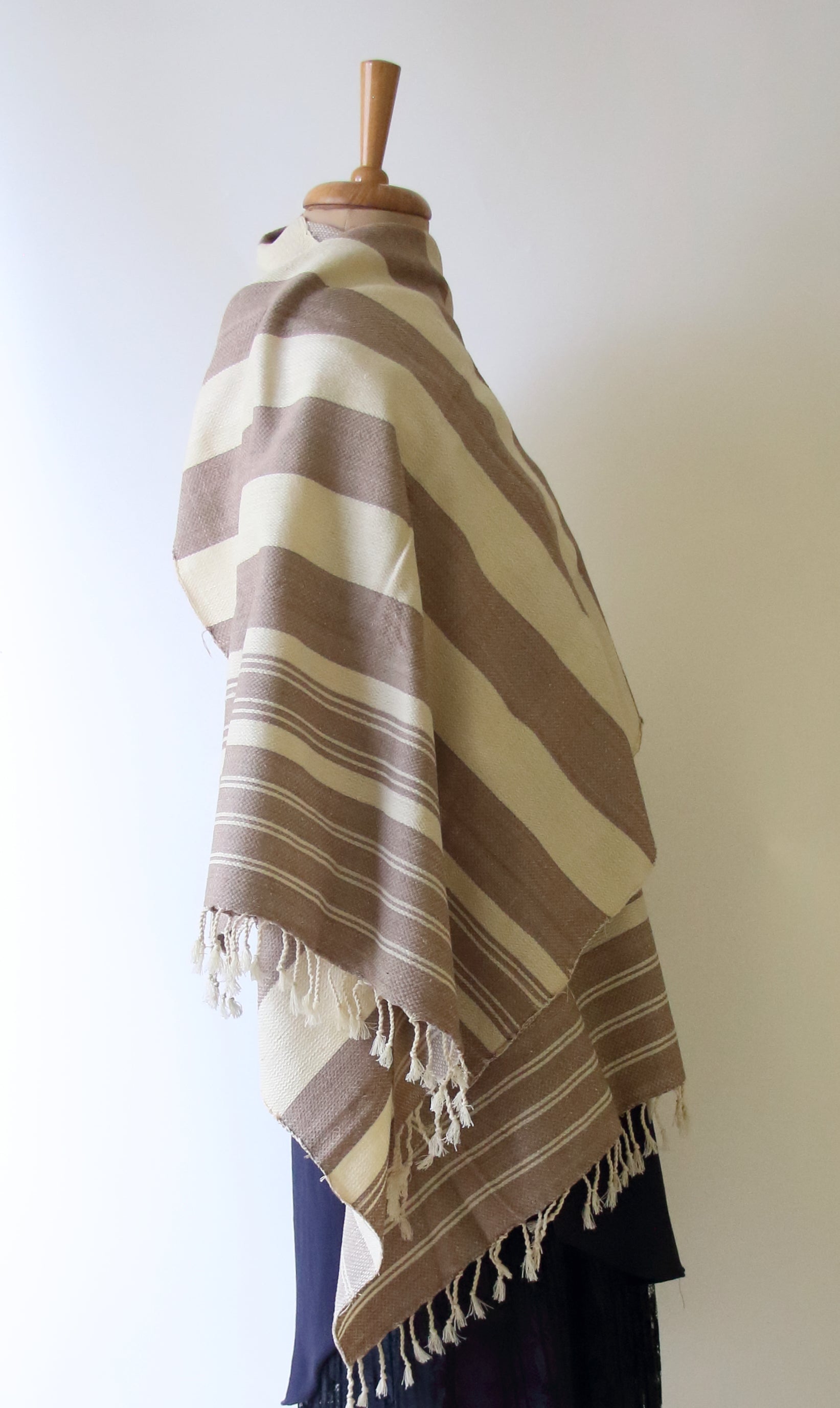 The shawl has been woven on basic traditional looms . It has hand spun yarns in the weft and mill spun yarns in the warp and has been woven in twill weave.  The presence of hand spun yarns and the twill weave gives the shawl a very unique texture .